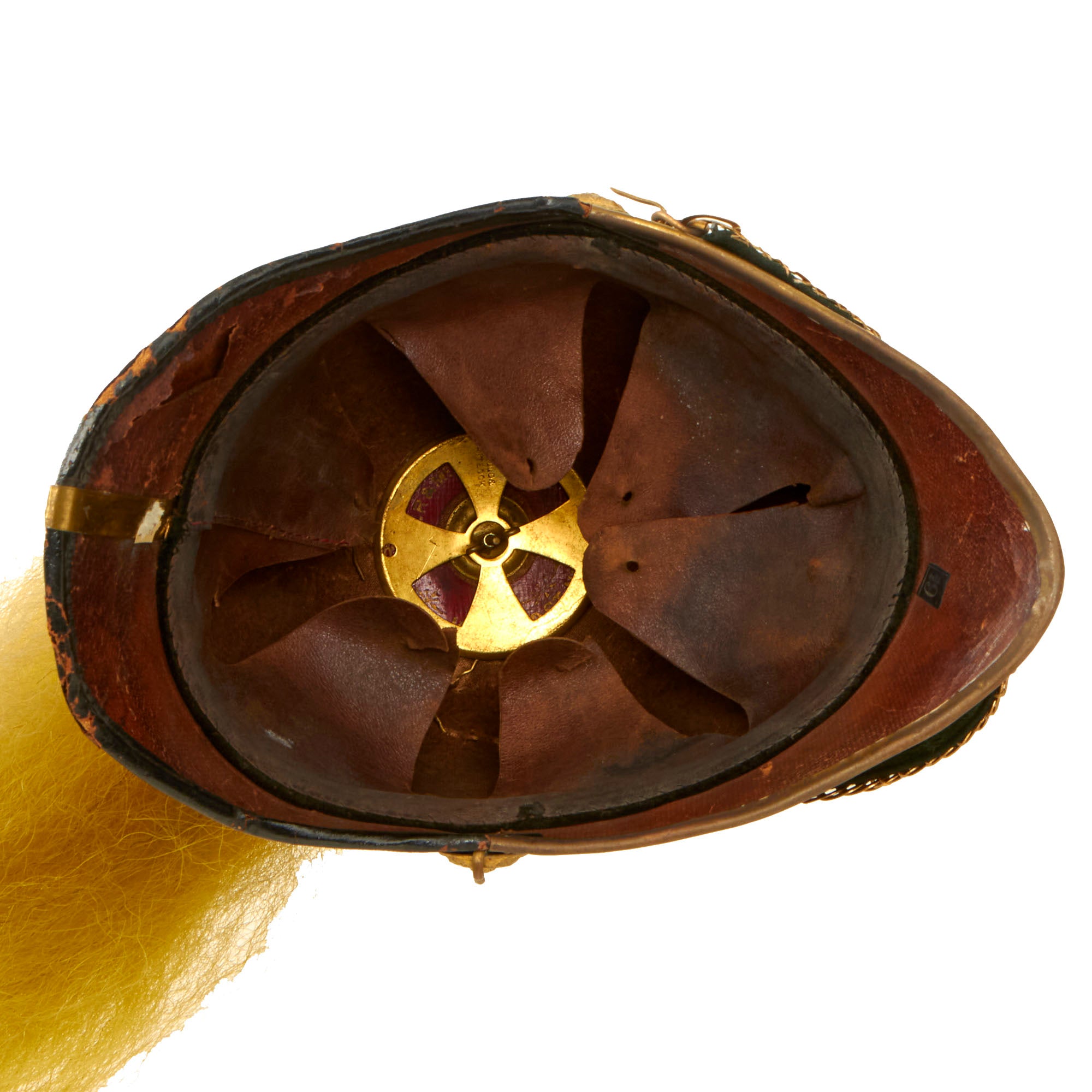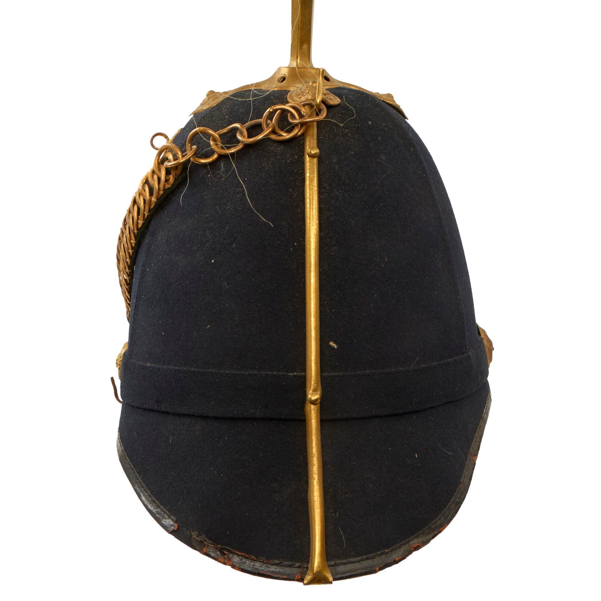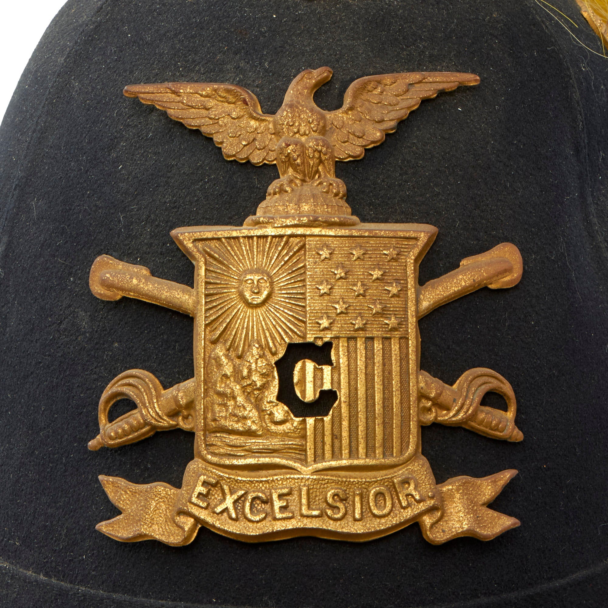 Original Item: One Only Available. Much like our European cousins in the 1880s, the U.S. Army started to adopt spiked pith helmets, often in white, with all brass mounts and occasionally plumes. These saw active service in the Spanish American War of 1898 especially in the tropical climate in Cuba. While often referred to as "pith helmets" in the broad sense, it was made from cork, like many European variants, such as the Wolseley pattern used by the British.This helmet dates to the 1880s, and it really is quite striking. This is not the type of helmet that was worn in the field, but instead one intended for use with the "dress" uniform for ceremonial occasions. It is beautifully made from cork covered with brown fabric, with a partial makers stamp inside around the spike fixture for RAYMOND & WHITLOCK.The Helmet plate displays the New York Guard Seal helmet plate; an Eagle perched atop a shield, wings spread, the letter “C” in front and a banner below marked “Excelsior”. The plate is in excellent condition with the expected verdigris. Unfortunately there is no regimental number present, nor do we think there ever was one. Comes complete with its original cruciform base and yellow plume for Cavalry. The overall condition of the helmet is fantastic given its age. The original chinstrap chains are retained and scarce. There is no major damage to the inside or outside.Very nice, great condition for age, ready to display.The Model 1881 Dress Helmet was worn only for full dress events. The helmet evolved from the earlier Model 1872 helmets worn only by the Cavalry, Light Artillery and Signal Corps. In 1881, the new helmet design was adopted for use by all enlisted troops and for officers of the Infantry, Cavalry and Artillery. (General and Staff officers continued to wear a chapeau de bra as they had for many years…) For enlisted troops, the helmet was made of black felt, while officers could buy a helmet of black cloth over a cork or felt base. Atop the helmet of all mounted troops is a brass plume holder, resting on a brass base having an oak leaf and acorns motif, while the plume holder itself is engraved with an eagle and star. For enlisted men, a thin rod with two circular plates at the top clamps the base of the horsehair plume and rests atop the plume holder, while officers had a similar device to let the plume appear like it was fountain sprung from their heads. The plume’s color depended on the branch of service the soldier was in: white for mounted Infantry officers, red for Artillery and yellow for Cavalry.The Arms of the United States forms the large insignia on the helmet’s face. Again, depending on the branch of service, one of four different eagle designs formed the insignia. Enlisted troops in branches other than the “Big Three” wore the general services eagle, while dismounted officers from another corps wore either an Infantry or an Artillery plate. For all Infantry, Artillery and Cavalry personnel, a small white metal numeral of the assigned regiment is affixed by small wires to the shield of the eagle plate. Other corps had a small device to signify their assigned branch. For all mounted troops, the helmet cord is hung on the helmet from two devices. For enlisted troops, the cord’s color matched that of their branch, while all officers wore a two-piece cord of braided, gilt thread. The cord’s braided bands drape over the front and back of the helmet. The remainder then falls to the left shoulder and gets secured by a slide, goes around both sides of the head and gets secured by another slide, then around both sides of the right arm and gets secured by a third slide, then the two lozenge ends are secured to a button on the frockcoat and simply dangle.For all officers, a brass chain chinstrap hangs from two corps-faced buttons with hooks on them. All dismounted officers of Infantry and Heavy Artillery wore the same helmet and base plate, but with a plain brass spike on top. Those officers also wore the brass chain chinstrap. It was draped across the helmet’s face, from a shield hook on the helmet’s upper right back to the left helmet button, when not being used. Enlisted troops had a simple leather band for a chin strap, with two corps-faced buttons on the sides.