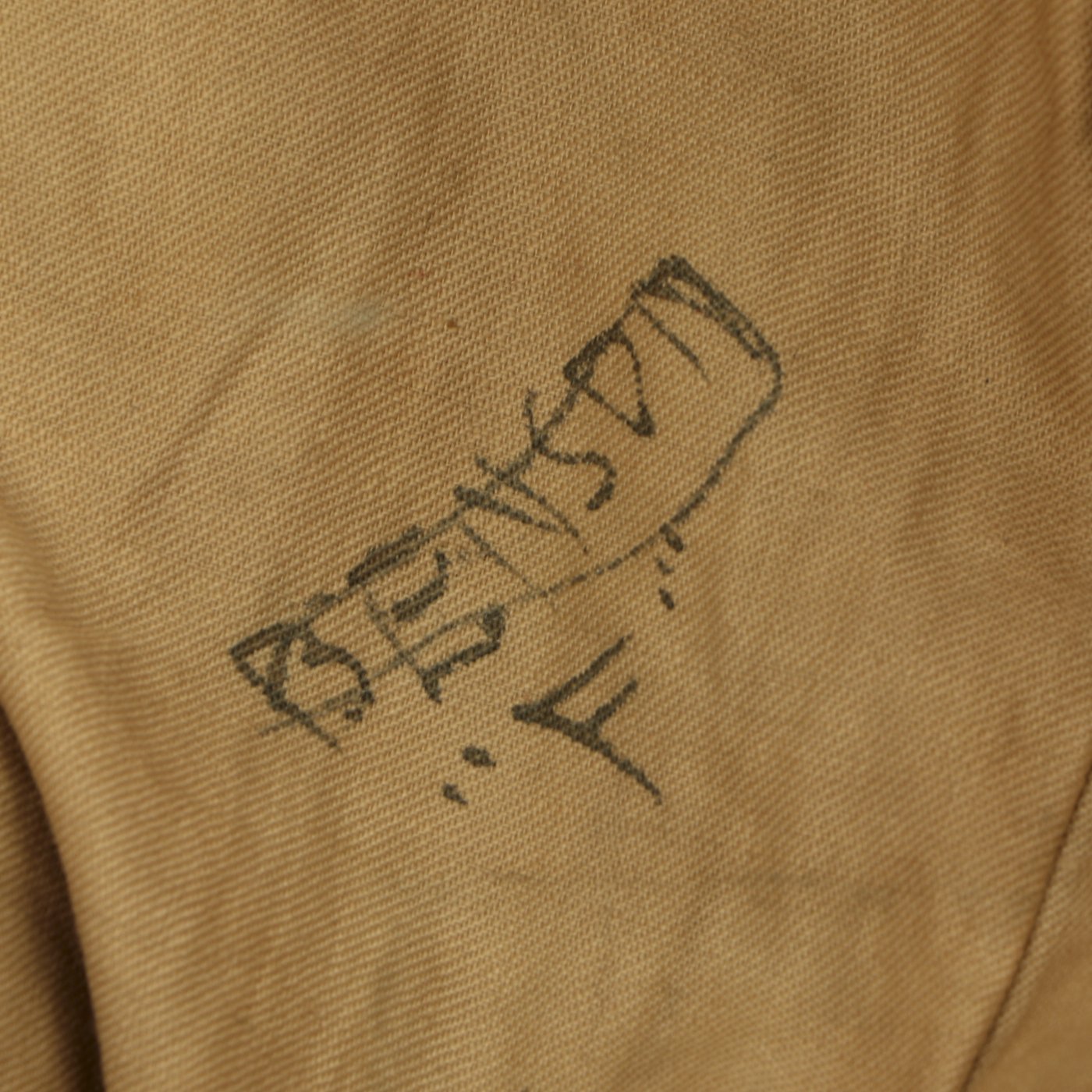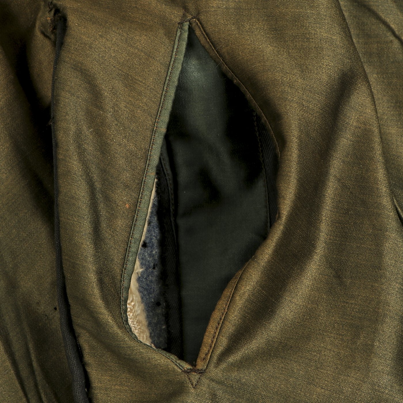 The jacket is lined with a machine quilted lining of a light color. The swallow tails are lined in black, and contains a secret pocket in one of the tails. There is a fair amount of hand stitching the finish work of the lining.