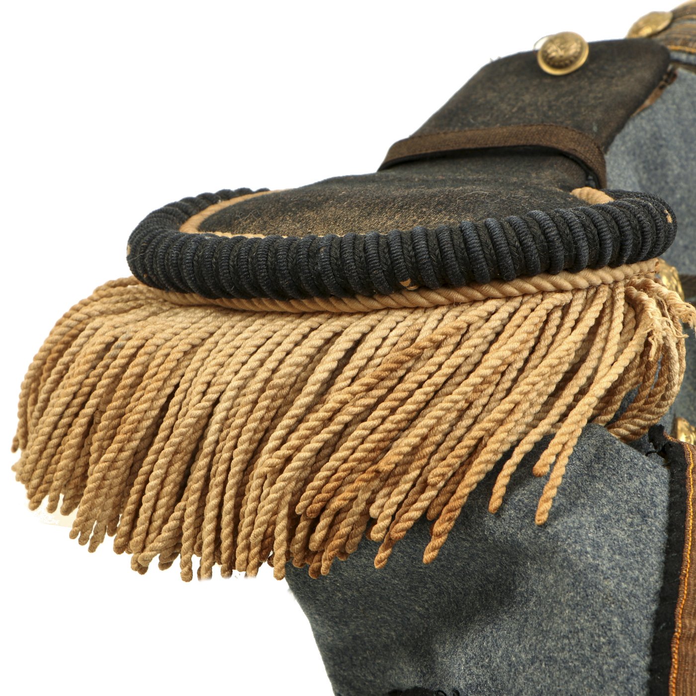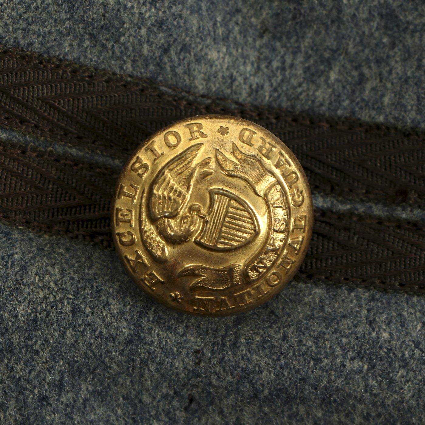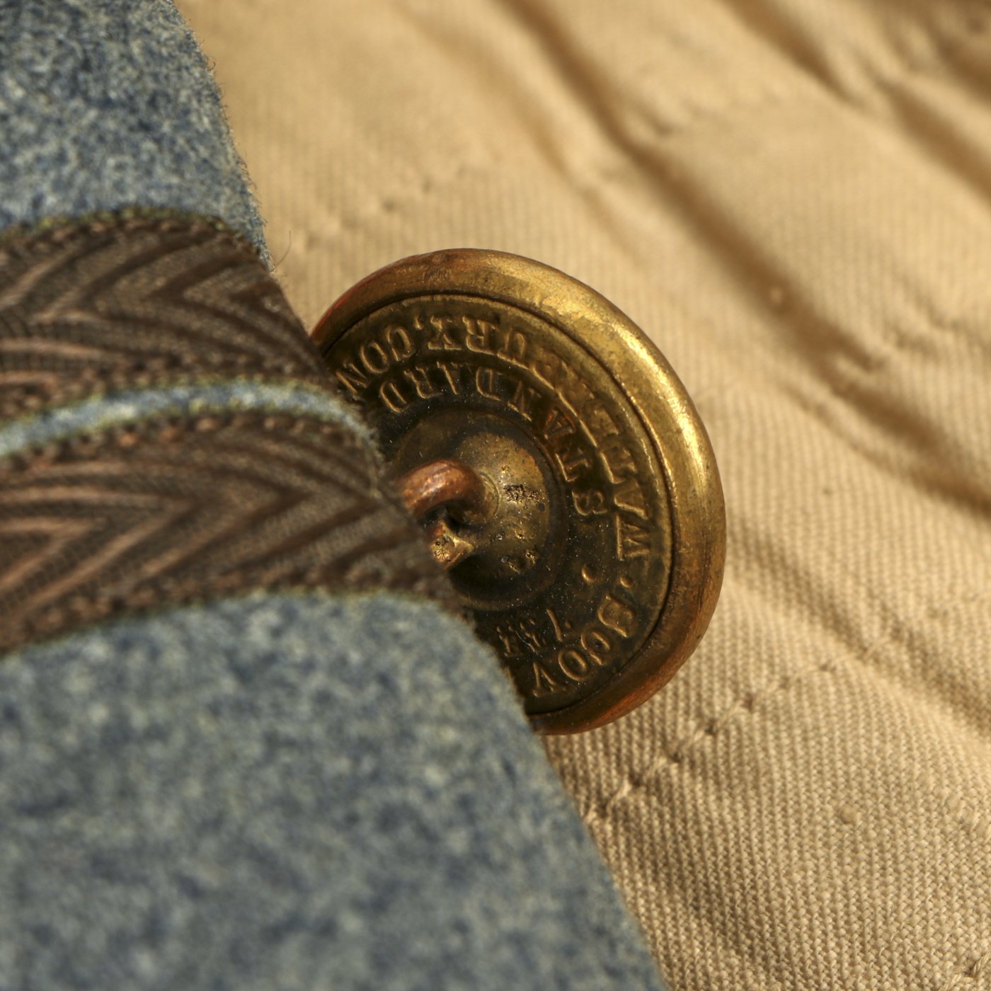 The front of the swallowed tail jacket has 9 rows of herringbone pattern ribbon going across, with only the brass buttons down the center being functional (one of these 9 is missing) and two more rows on either side being decorative. There are 18 more shiny brass buttons on the swallow tails and sleeves, and two more buttons on the stand up collar. All of the buttons read "EXCELSIOR; NATIONAL GUARD" with the initials N.Y.S.A. inside a banner in the button design. All buttons are back marked.