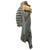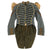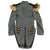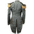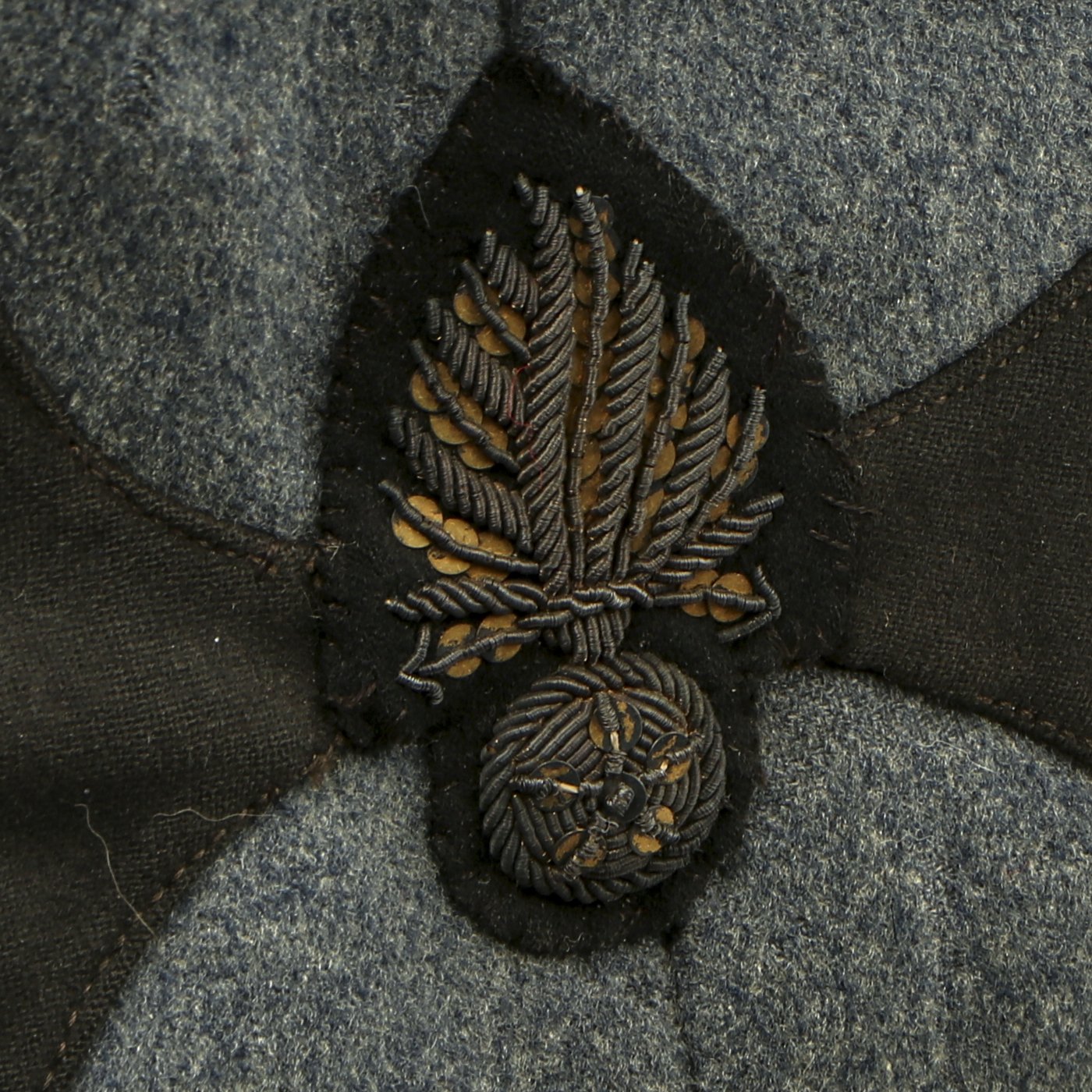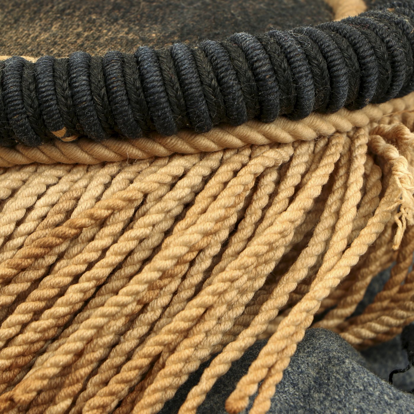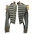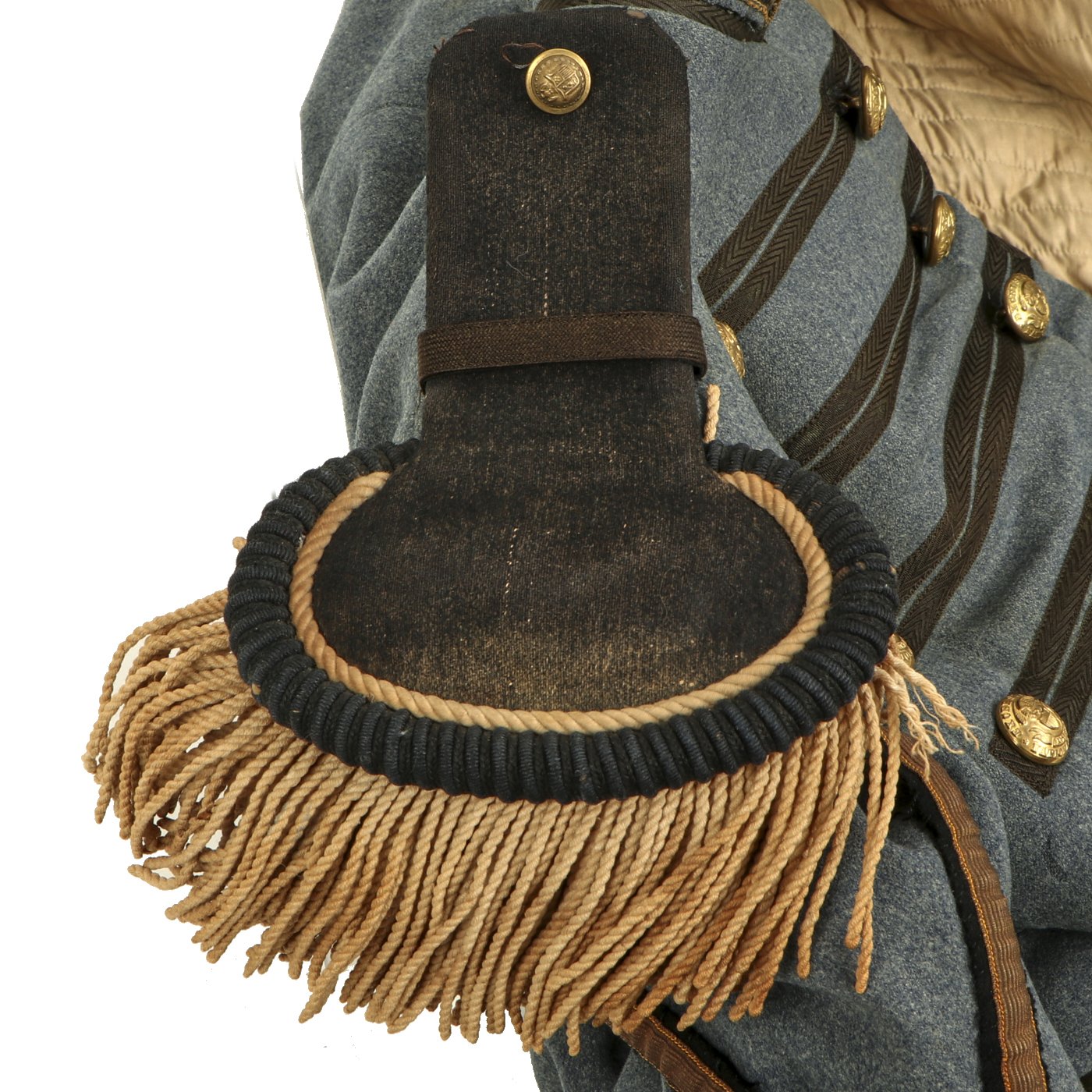 The front of the swallowed tail jacket has 9 rows of herringbone pattern ribbon going across, with only the brass buttons down the center being functional (one of these 9 is missing) and two more rows on either side being decorative. There are 18 more shiny brass buttons on the swallow tails and sleeves, and two more buttons on the stand up collar. All of the buttons read "EXCELSIOR; NATIONAL GUARD" with the initials N.Y.S.A. inside a banner in the button design. All buttons are back marked.