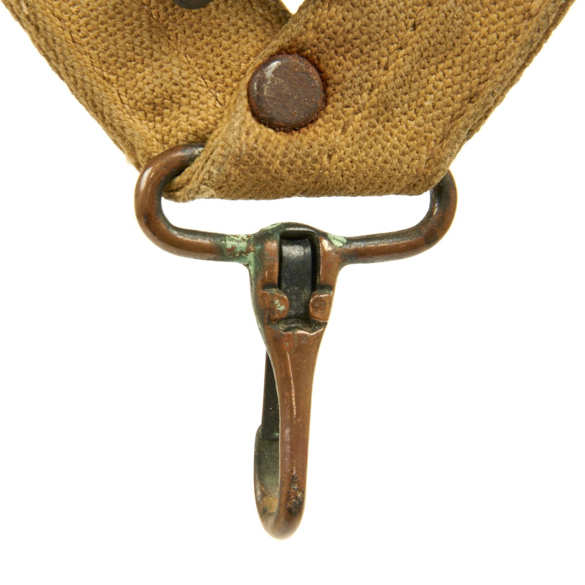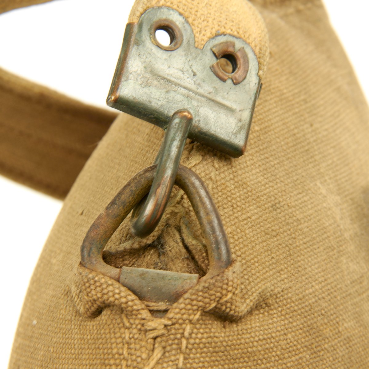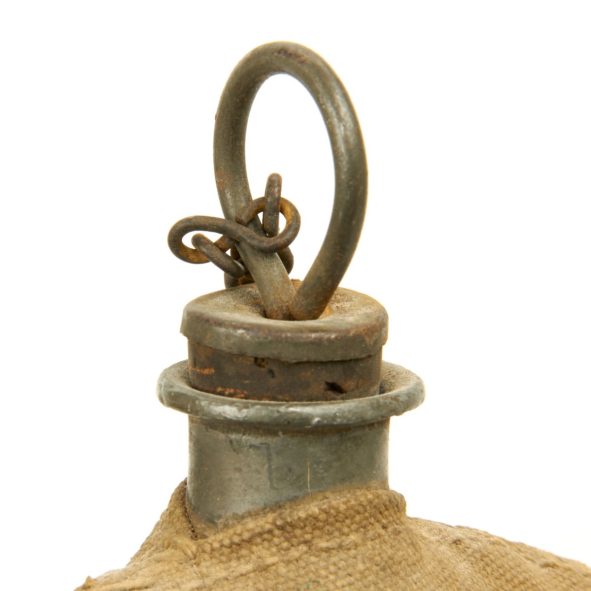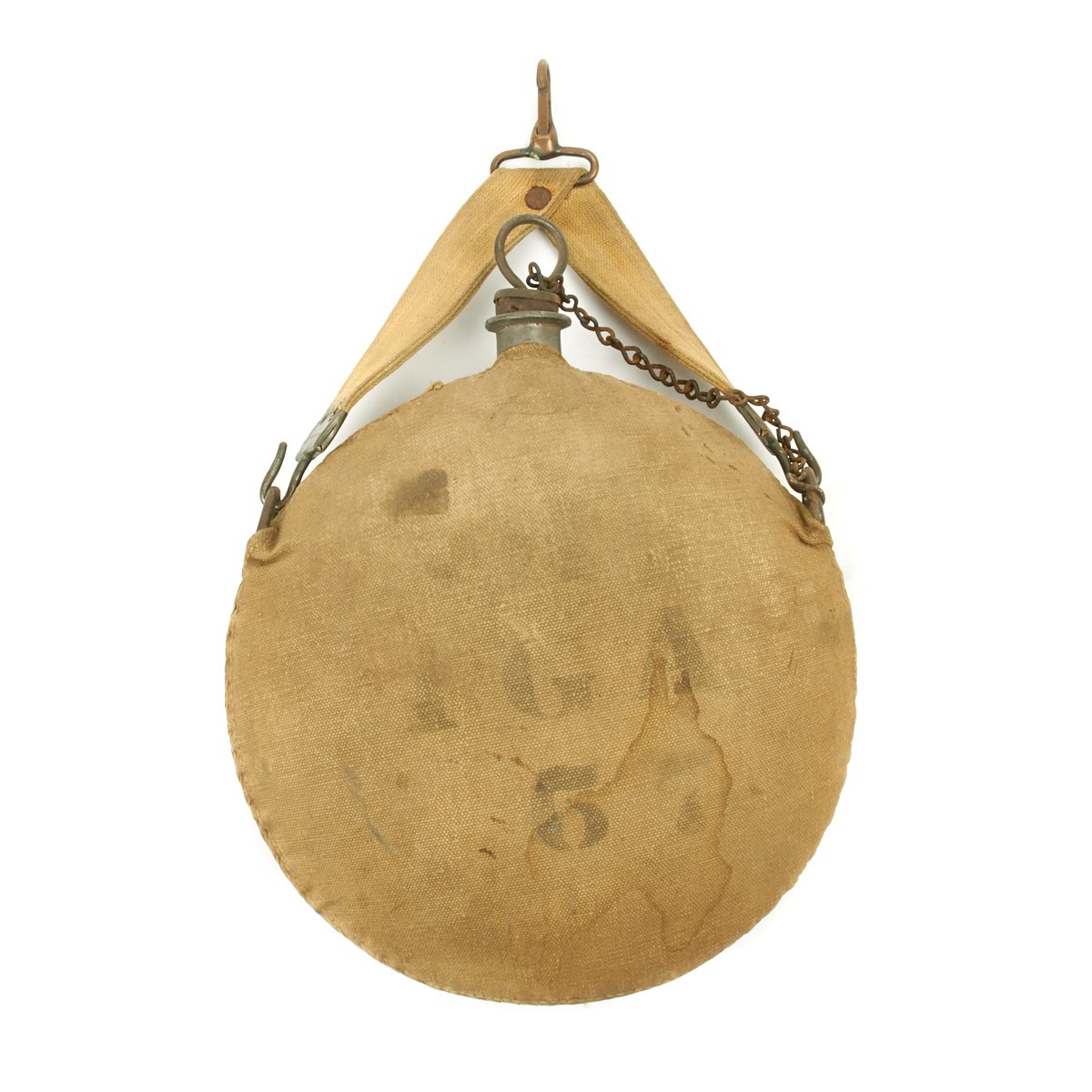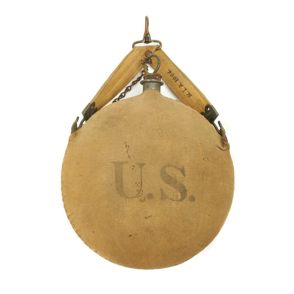 The canteen is complete with its original cork stopper secured to one of the triangular loops found on each side of the body. It also has the proper pattern canteen canvas strap with brass fittings marked RIA 1904 for Rock Island Arsenal. No denting to the body, one of the cleanest canteens we have ever offered.