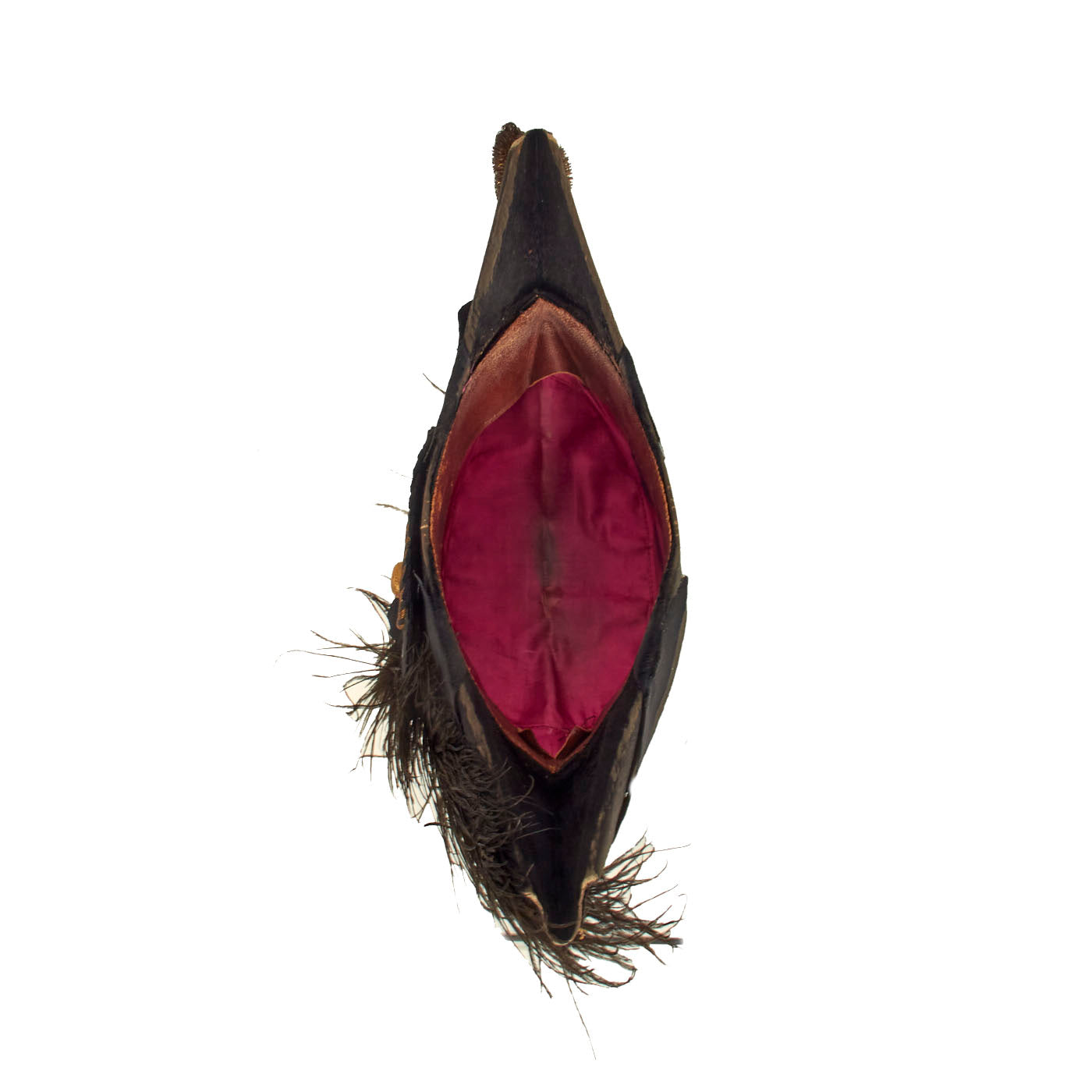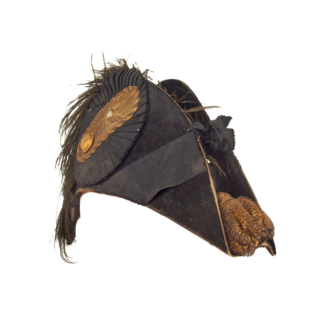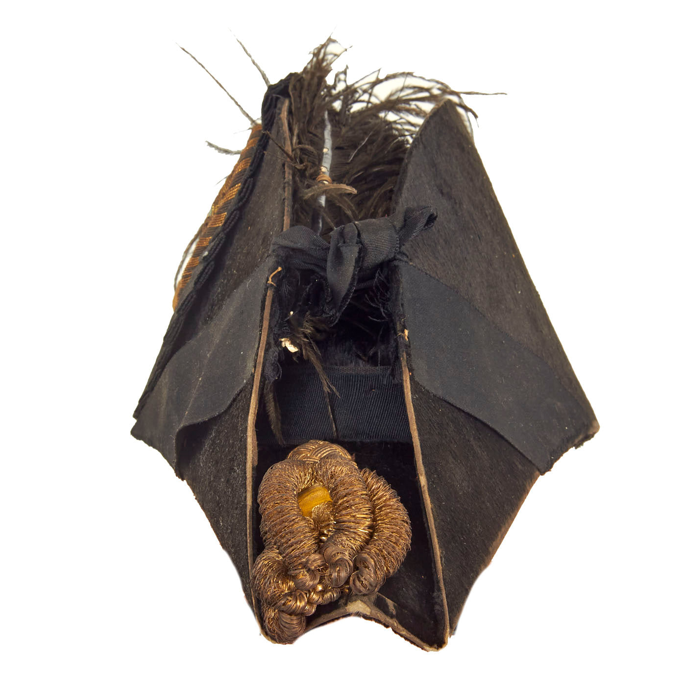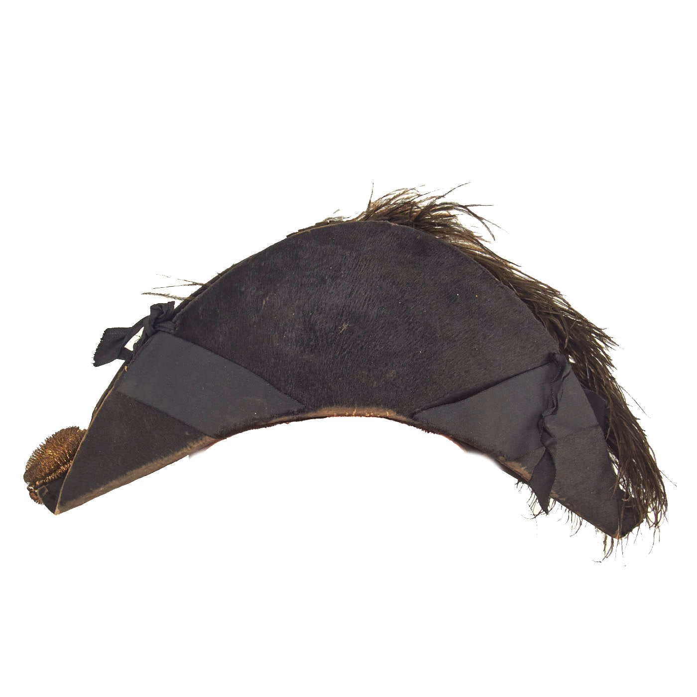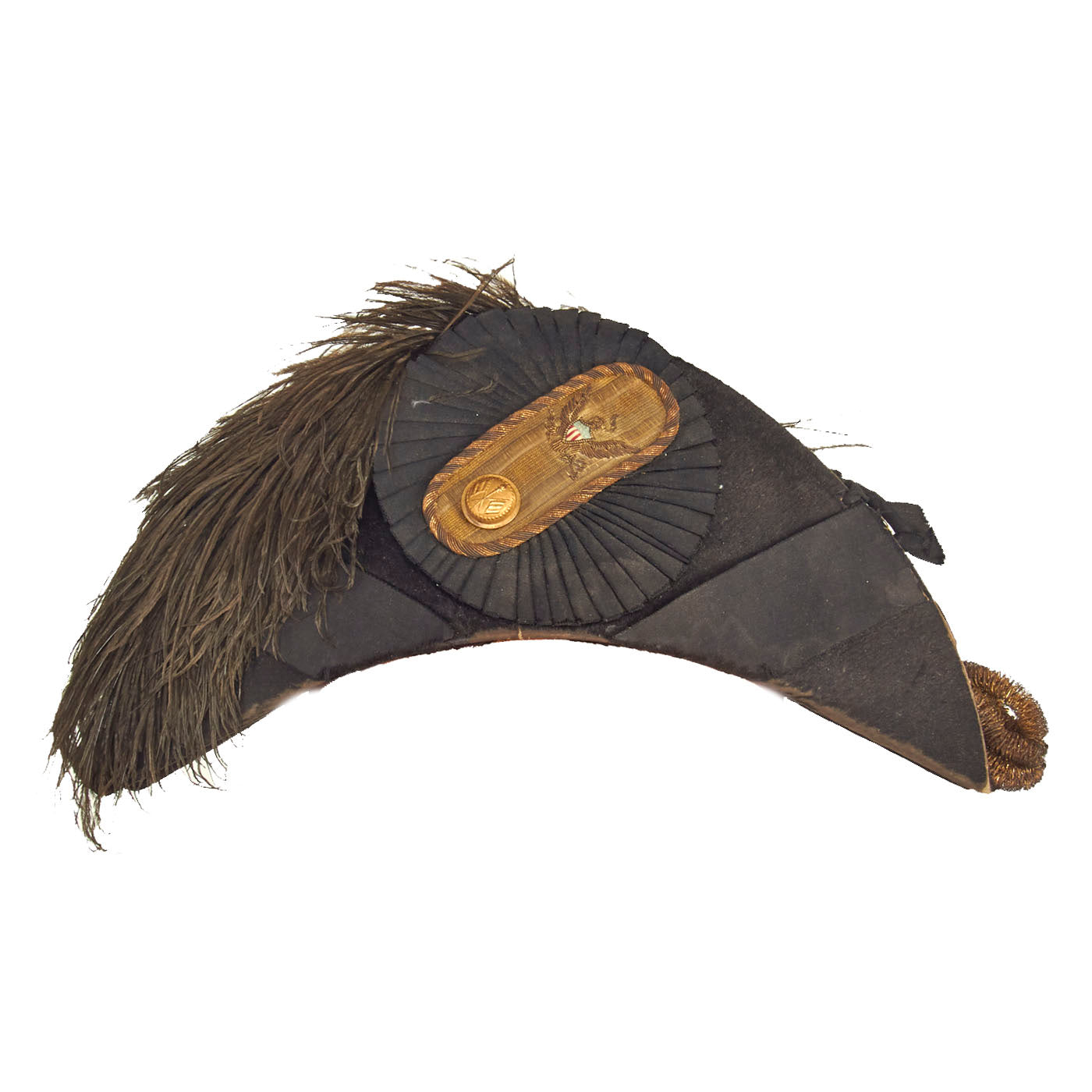 Original Item: Only One Available. This is a fantastic example of the scarce Indian War period U.S. Army Officer’s "Chapeau De Bras", or folding bicorn. It is made of beaver fur with original ostrich feathers. These caps were intended as a Dress Hat, and not many survived the ages due to their fragile nature. The cap we are offering is perhaps one of the finest examples of a U.S. Army Chappeau from the Indian War era that we have ever seen! Not only is the cap in very solid condition, but all the adornments are still intact as well!