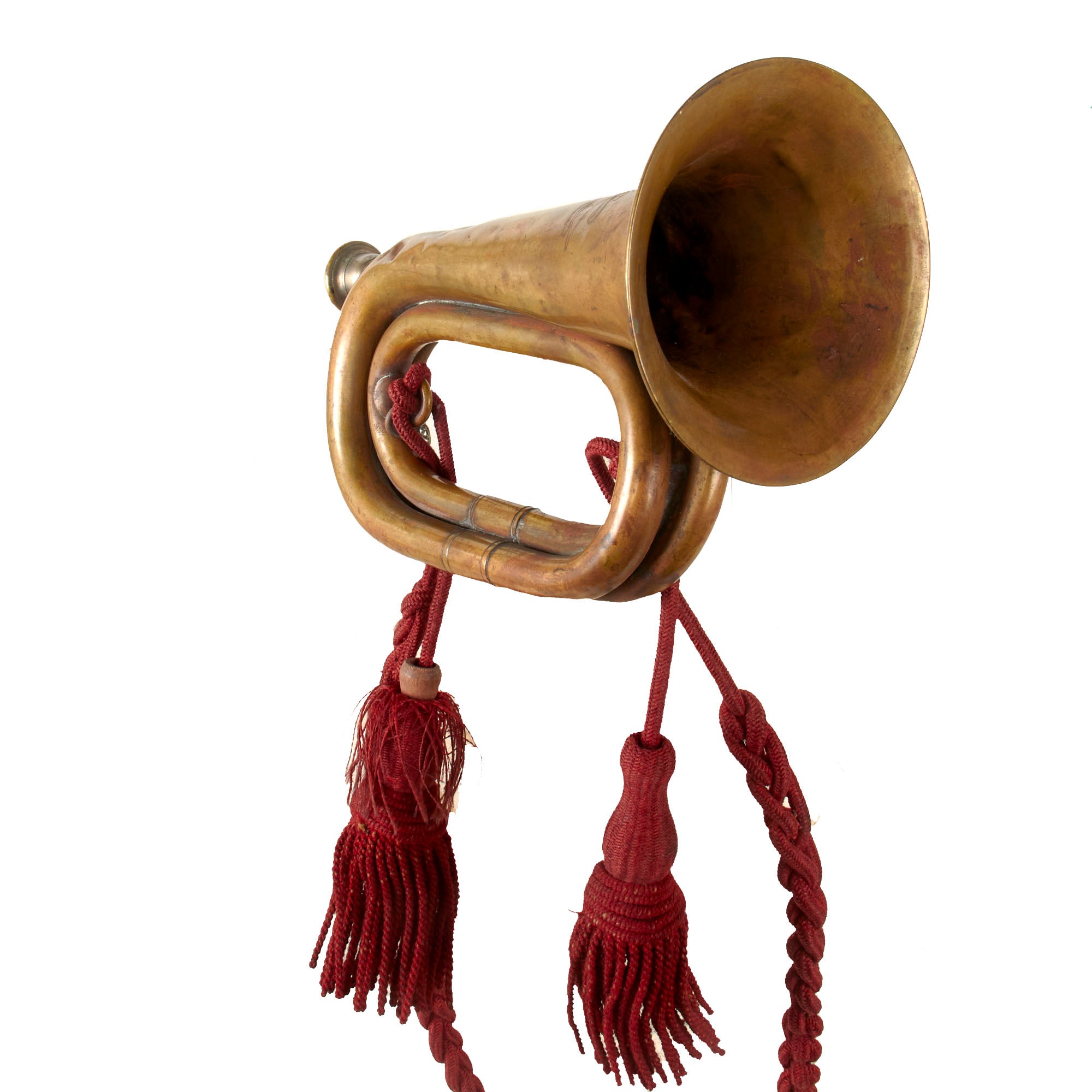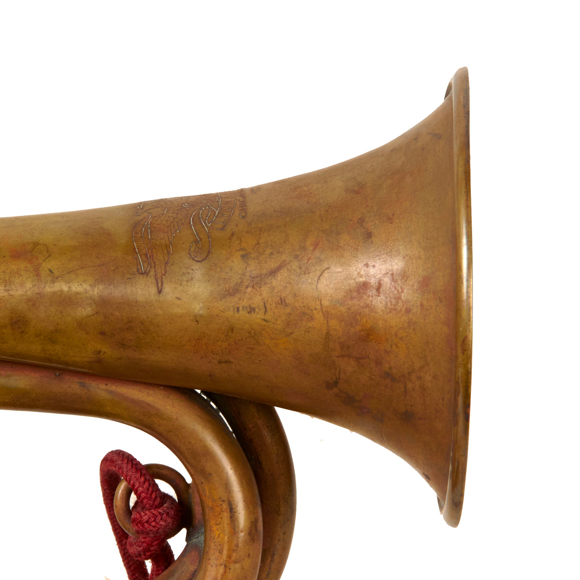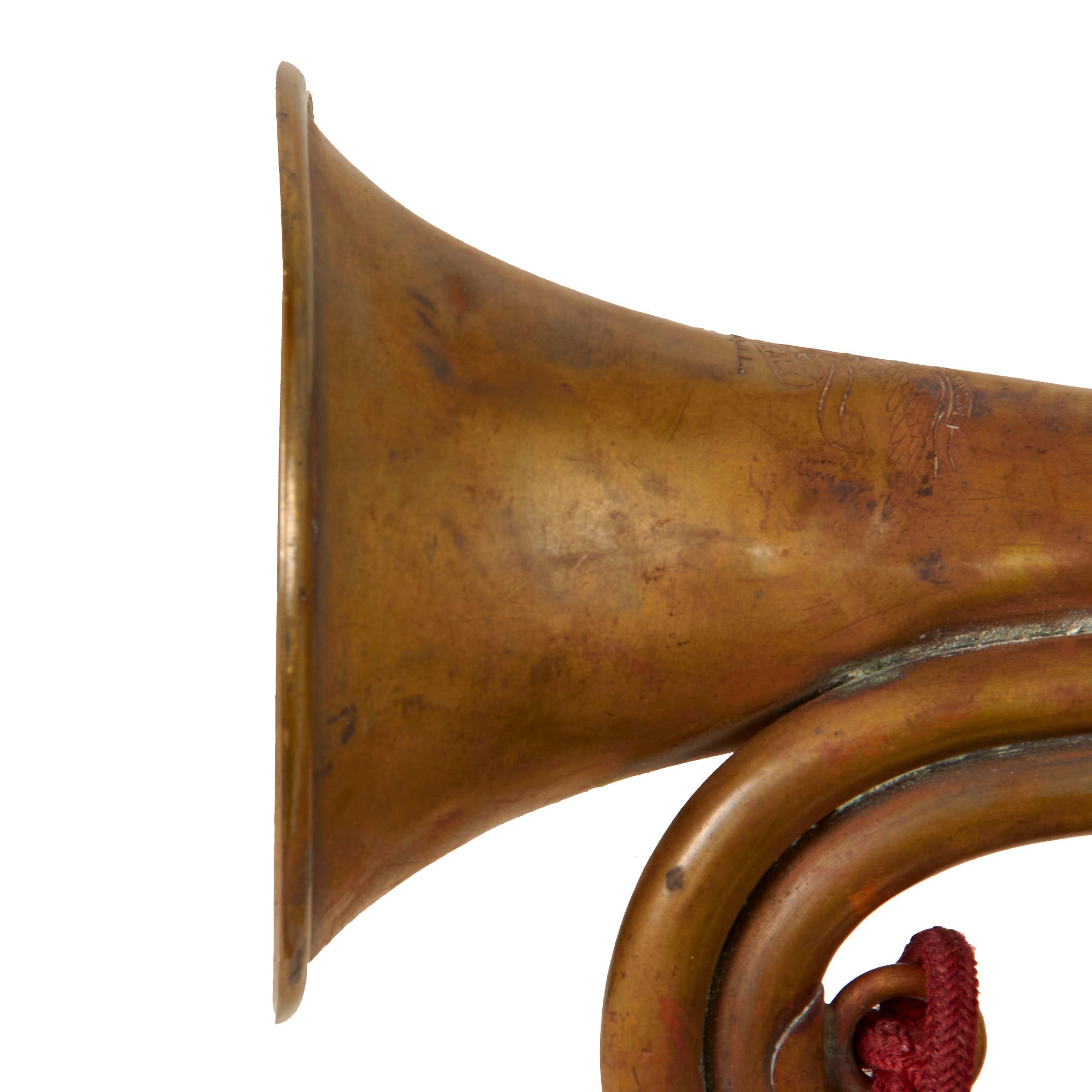 The bugle still retains a period red scarlett “Artillery” cord denoting the branch of service. There is fraying and material loss on the knots, but the cord is in great shape overall. The bugle is marked: