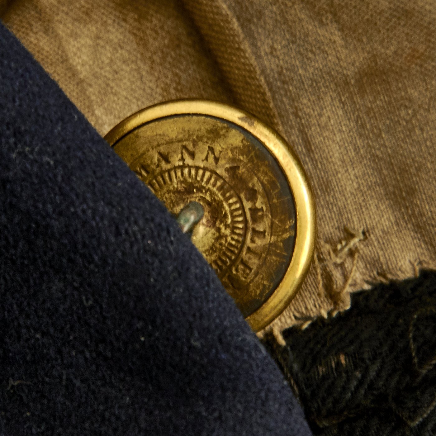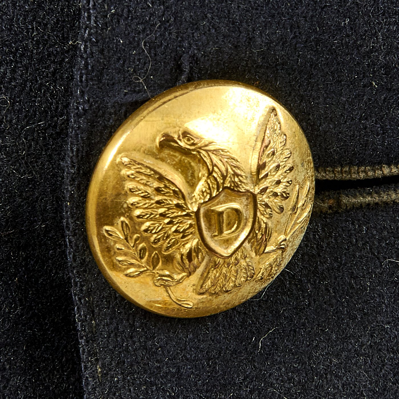 Coat cuffs display three small size, Eagle “Shield” brass buttons on each cuff. This single-breasted uniform coat features nine coat-size, Eagle “D” brass buttons arranged in one row down the front of the coat. All of the buttons are original and are in very fine condition. All coat buttons are backmarked with HORSTMANN. All the uniform buttons are attractive, undented and exhibit much gold gilt.