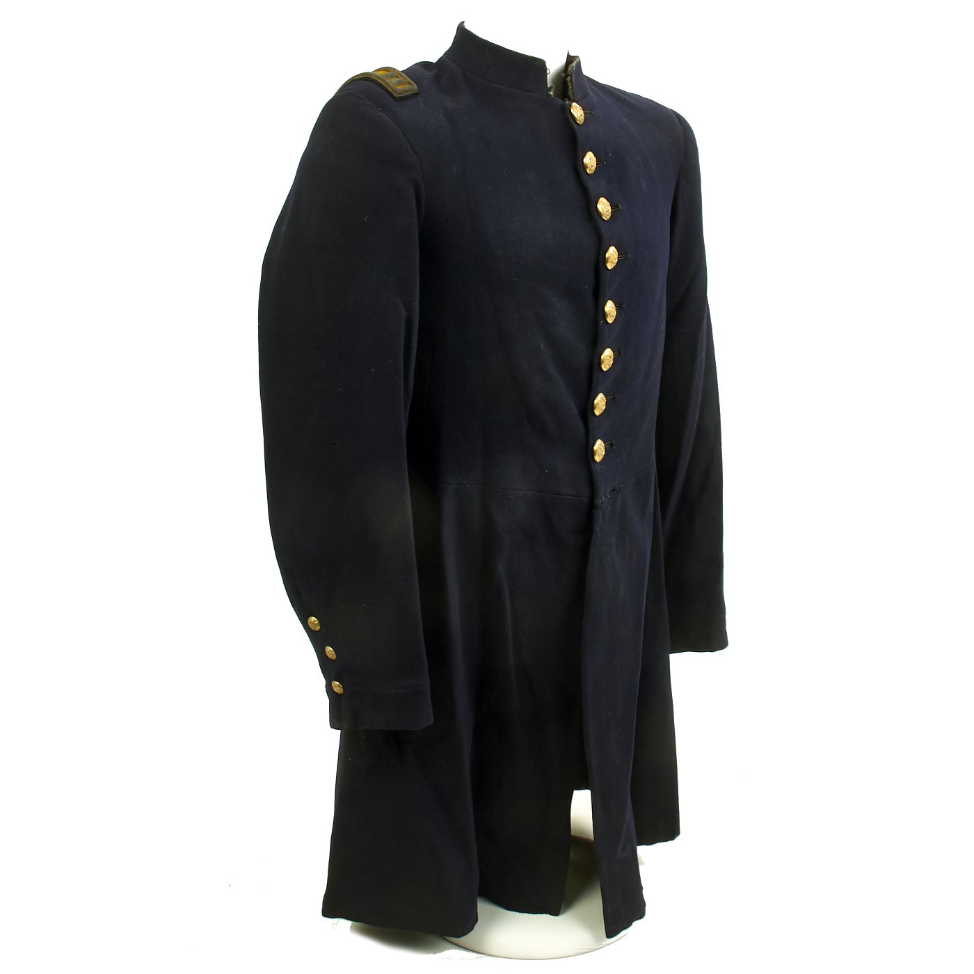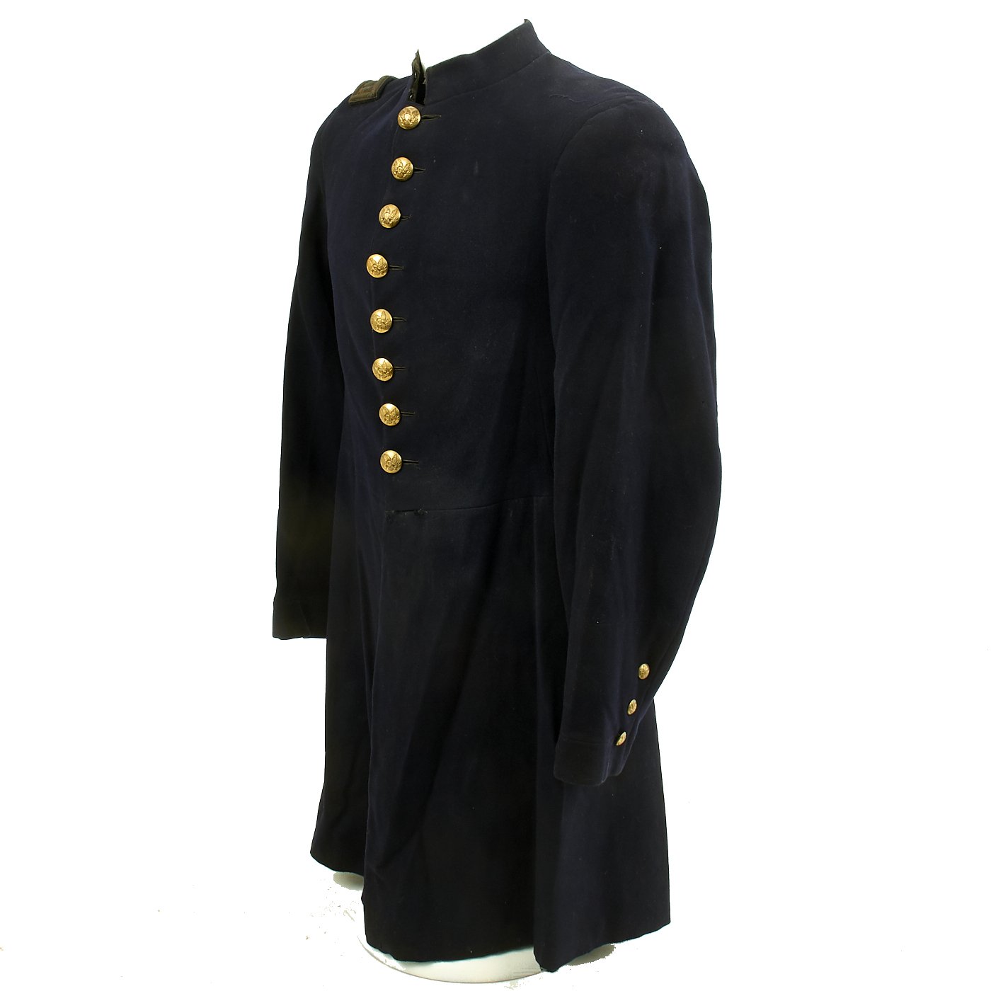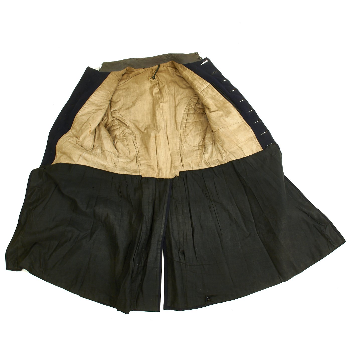 Original Item: Only One Available. This is a fantastic, Indian Wars (1880-1895) officer’s uniform frock coat complete with one original, quality Cavalry shoulder strap of a Captain. Well-constructed of rich, dark indigo-blue wool broadcloth, the uniform frock coat exhibits a six-piece main body, consisting of two front panels, two side panels and two back panels plus the skirts. Coat is in nice condition with just a handful of tiny moth nips and some seam splitting. Uniform has a two-piece standing interior collar of the same fine broadcloth material and is piped with black satin around the base. Interior collar exhibits minor repairs.