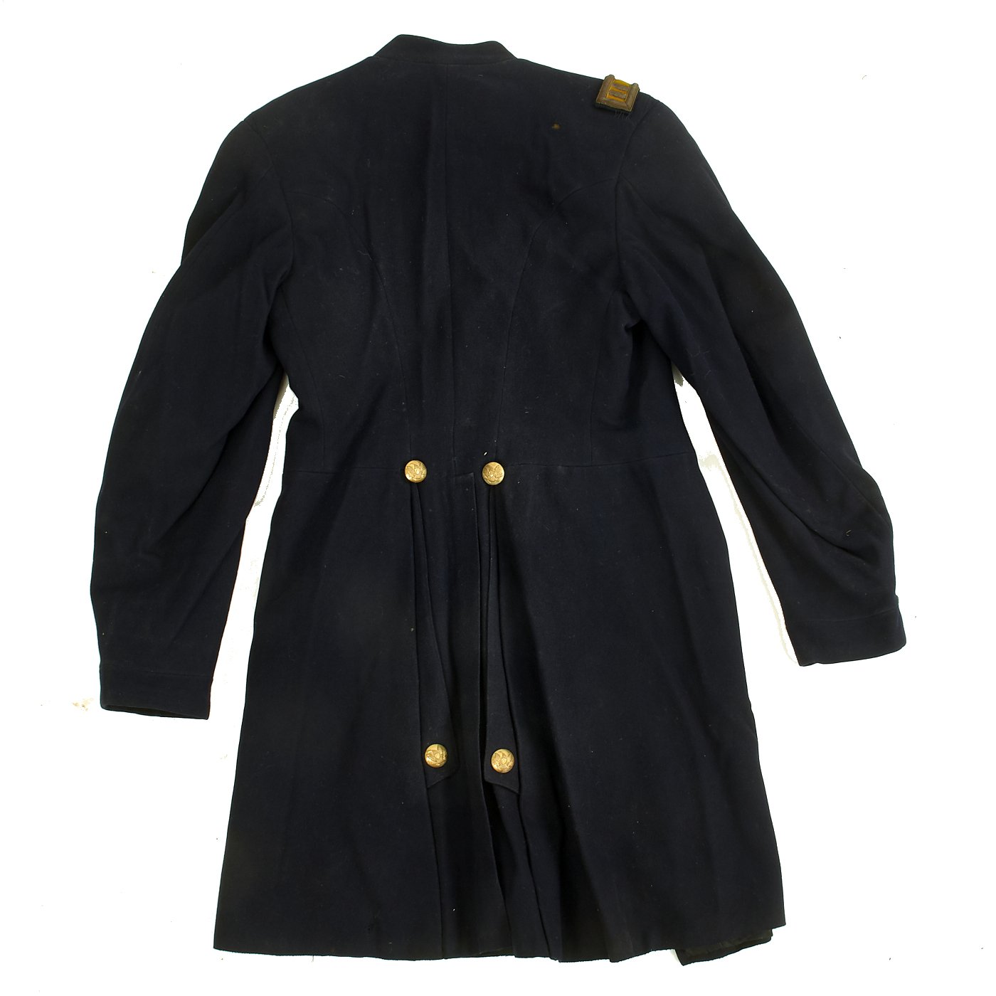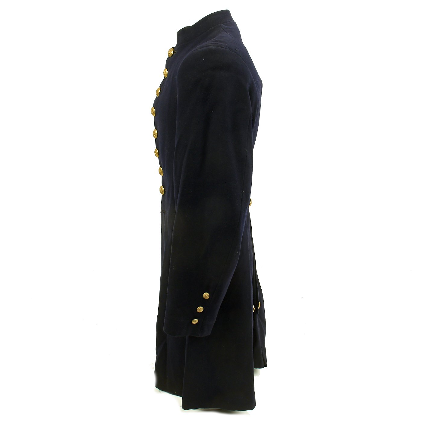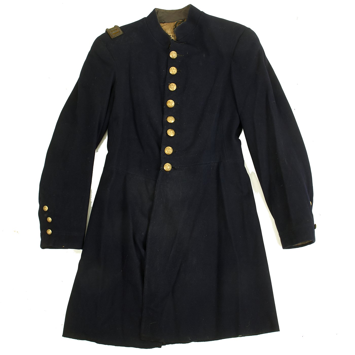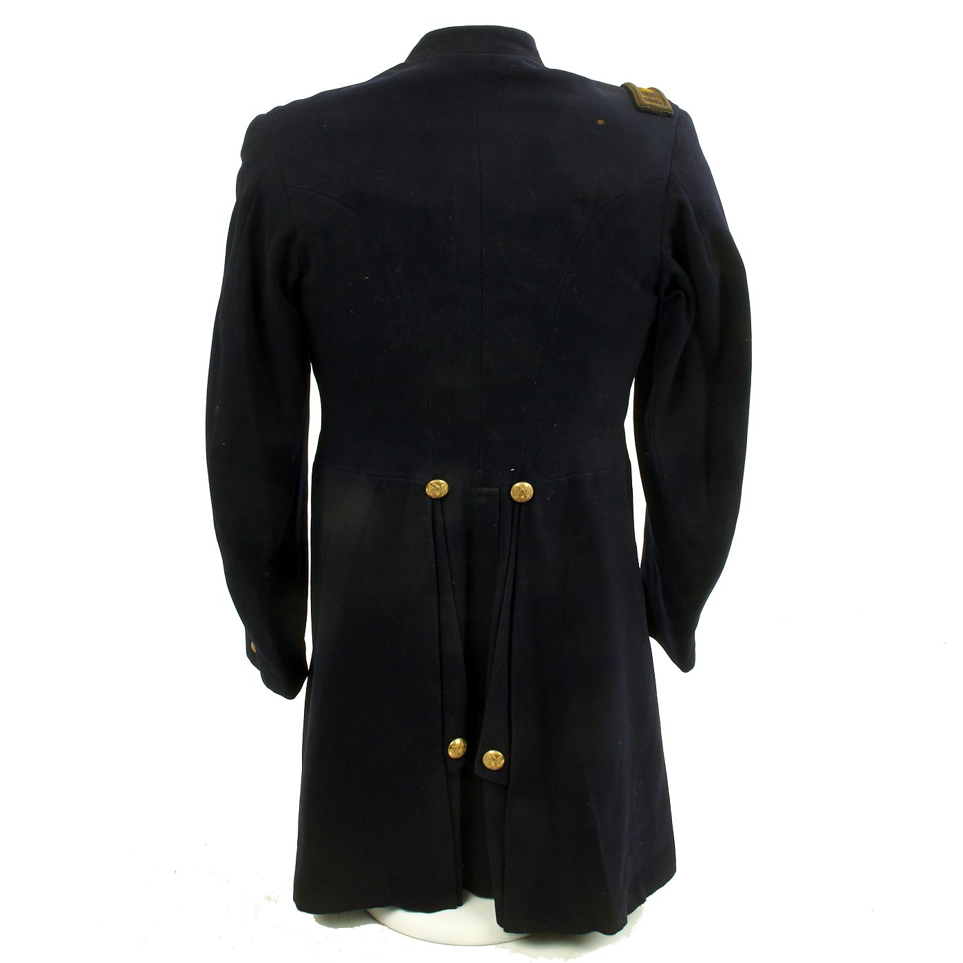Original Item: Only One Available. This is a fantastic, Indian Wars (1880-1895) officer’s uniform frock coat complete with one original, quality Cavalry shoulder strap of a Captain. Well-constructed of rich, dark indigo-blue wool broadcloth, the uniform frock coat exhibits a six-piece main body, consisting of two front panels, two side panels and two back panels plus the skirts. Coat is in nice condition with just a handful of tiny moth nips and some seam splitting. Uniform has a two-piece standing interior collar of the same fine broadcloth material and is piped with black satin around the base. Interior collar exhibits minor repairs.