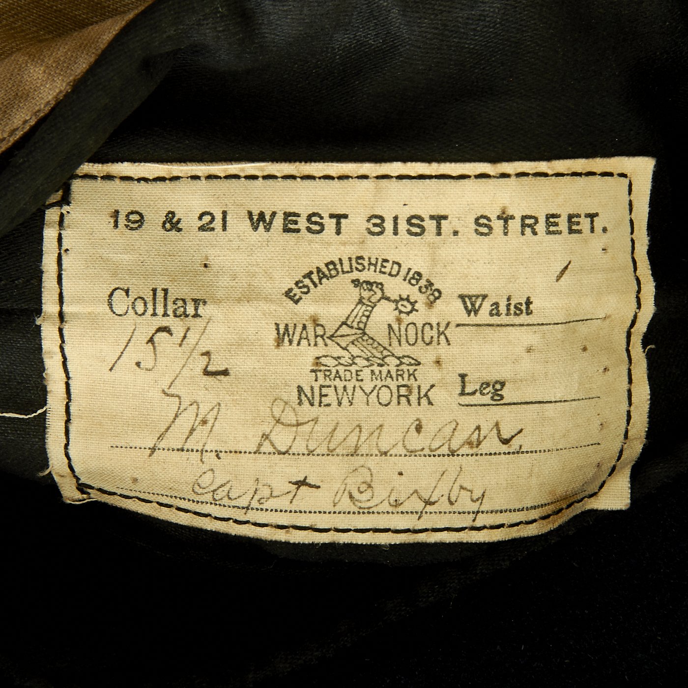 The interior body panel of the coat is lightly padded and lined with light cream-colored cotton. Sweat stains evident. Interior features an original tailor label that reads: