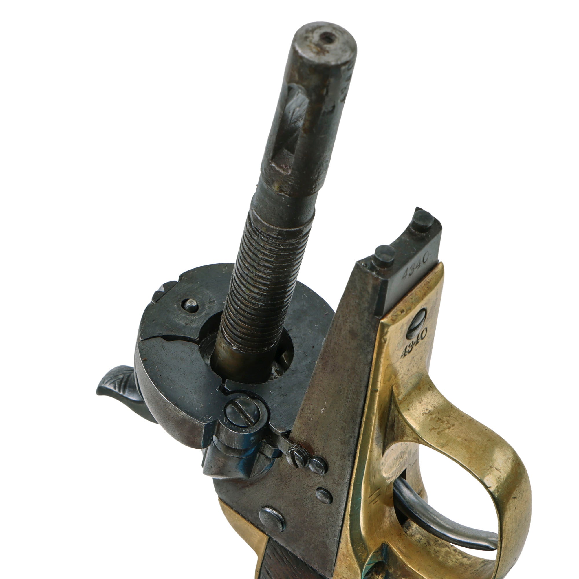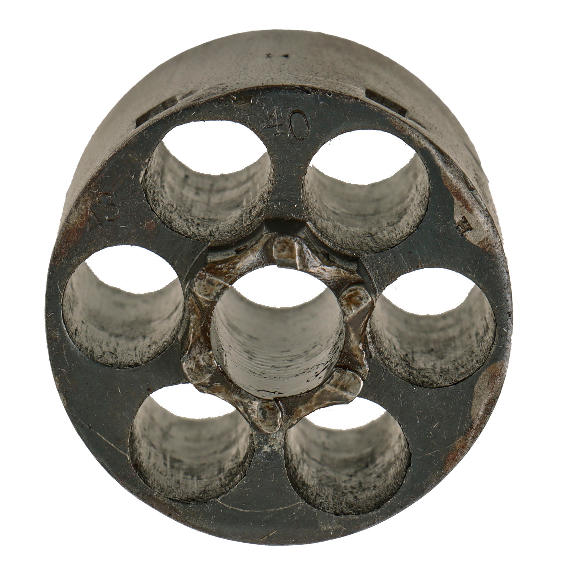 The revolver is still in lovely condition and looks great, with the finish mostly faded to a worn light gray patina, though there are some areas of the original bluing present in the recessed areas around the barrel. The brass grip frame and trigger guard do not have any of the original nickel plating, and show a beautiful aged brass patina. The grip does show wear, and is now a bit smaller than the grip frame, but it does not show any cracks or major damage. Functionally, the revolver cycles fantastically, with accurate indexing, a solid cylinder lockup, and a crisp dry fire. We did not notice any of the finicky behavior we often see on these old revolvers, so we really do not think it saw much use. The bore is in excellent condition, and does not look to have seen much use at all after being recut to use the .38 caliber cartridges. There is just a bit of past fouling and oxidation, now cleaned away. The loading gate opens easily, and the ejector is fully functional.