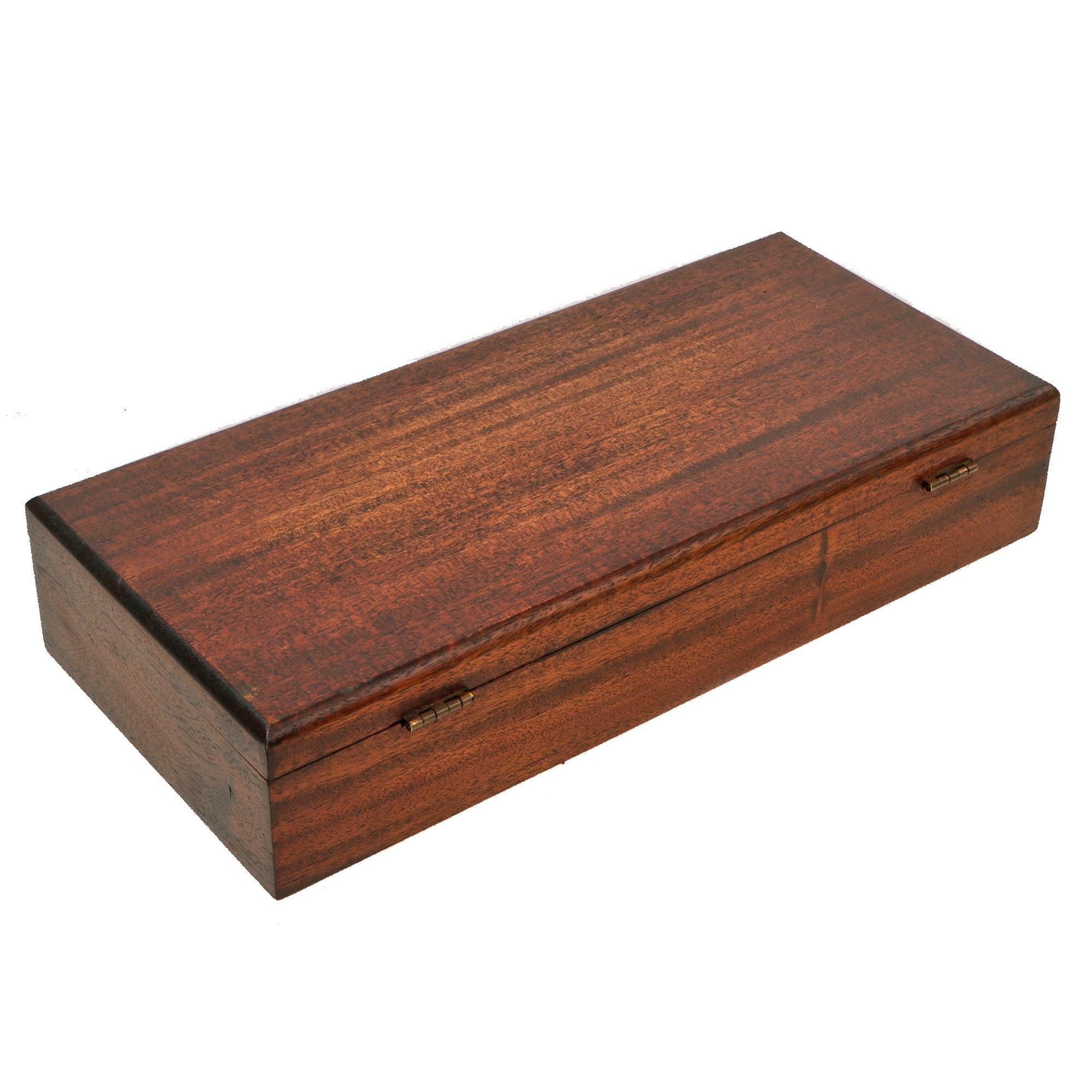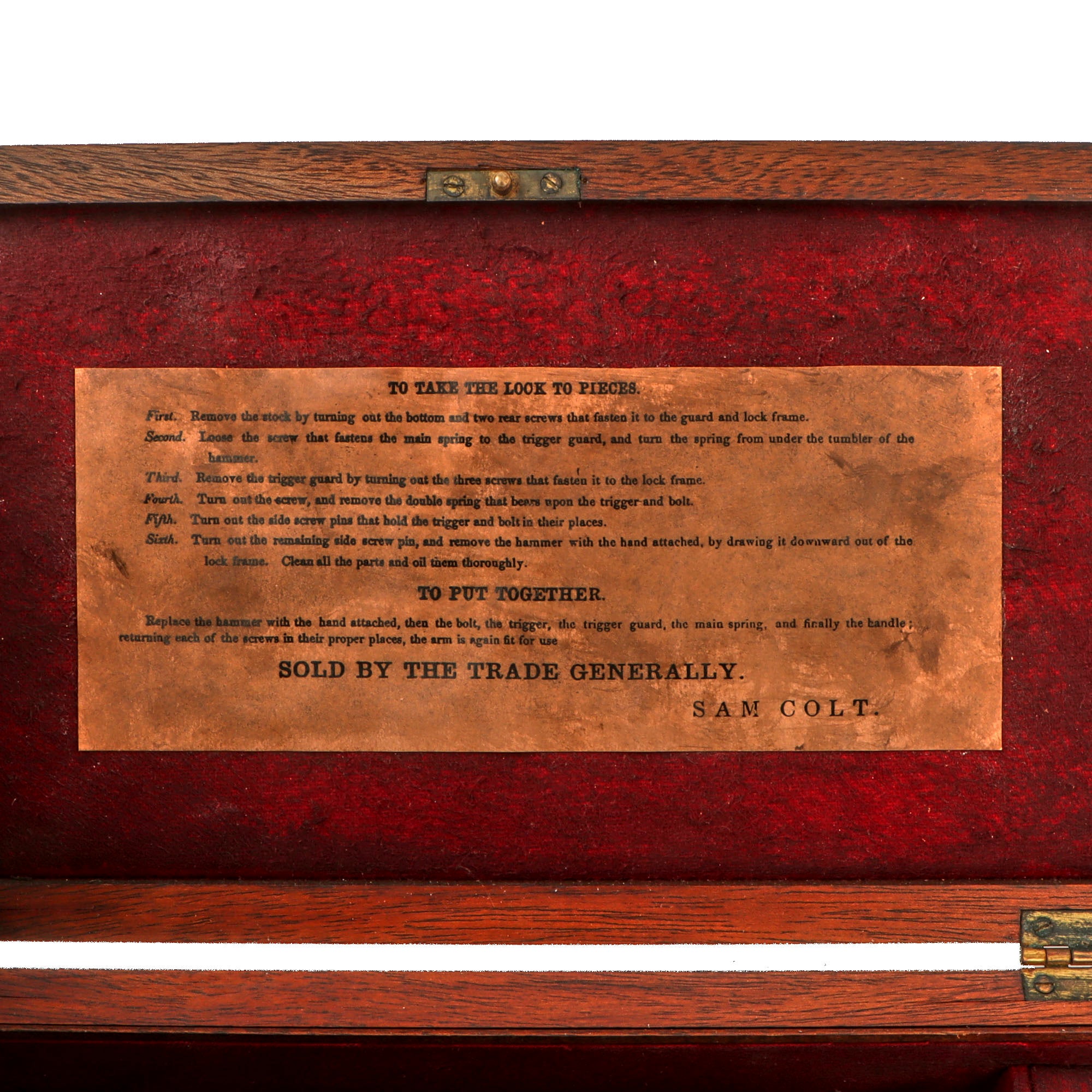 To make this offering even better, it came to us with a fantastic mid 20th Century custom wood case, which measures approximately 14 3/16" x 6 1/2" x 2 3/4", and has several compartments inside, all burgundy plush fabric lined. These are for accessories one might use with the revolver, and the bottom portion is full of inlets for 39 cartridges. There are also a copy of the original COLT instructions for disassembly of the "LOCK" of the revolver glued to the inside lid. The box has a lock and key, which is still fully functional! It really adds to the display potential of this very interesting revolver.