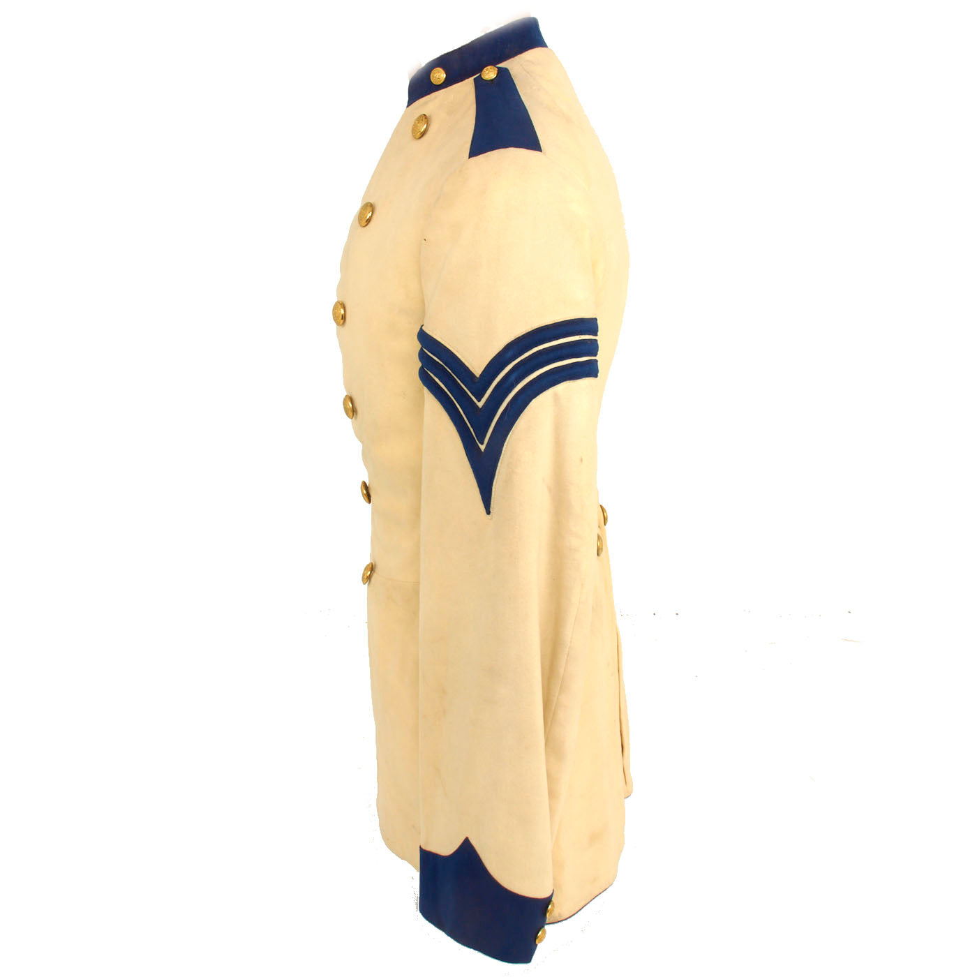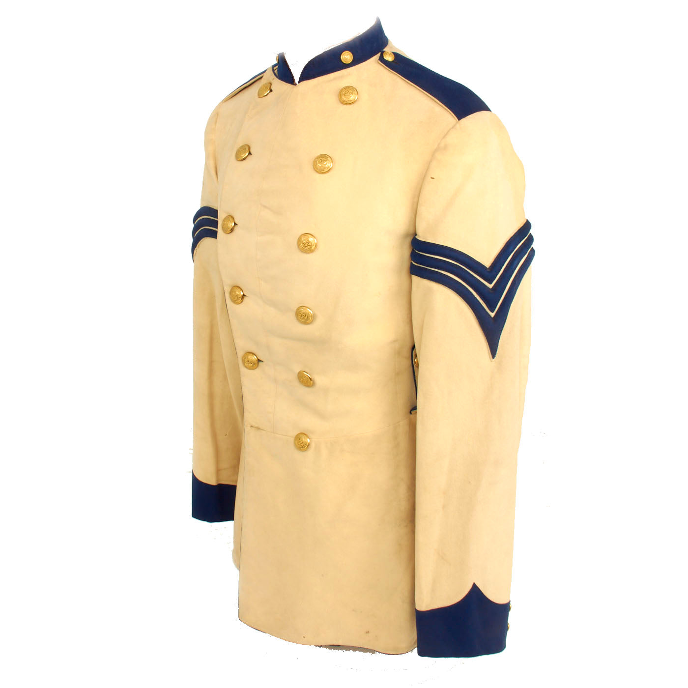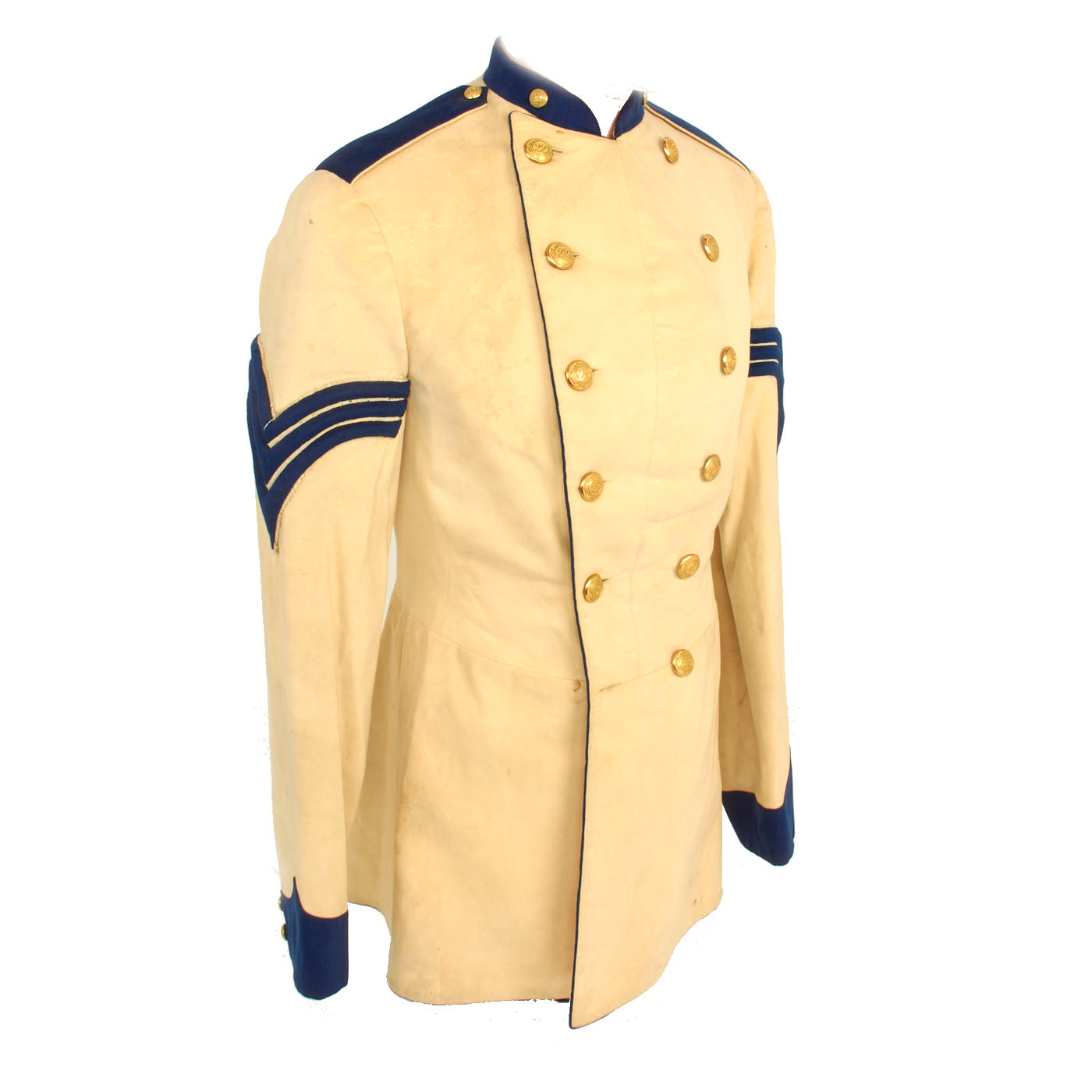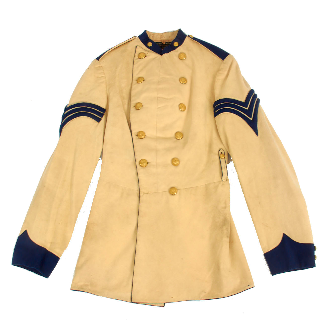 Original Item: Only One Available. Indian Wars/Spanish-American War Era white dress coat fitted with 22nd Regiment Militia numbers on the buttons. We have not been able to locate another example like this uniform. The only tag on the inside is a Brooks Brothers of Broadway tag on the inside back lining.