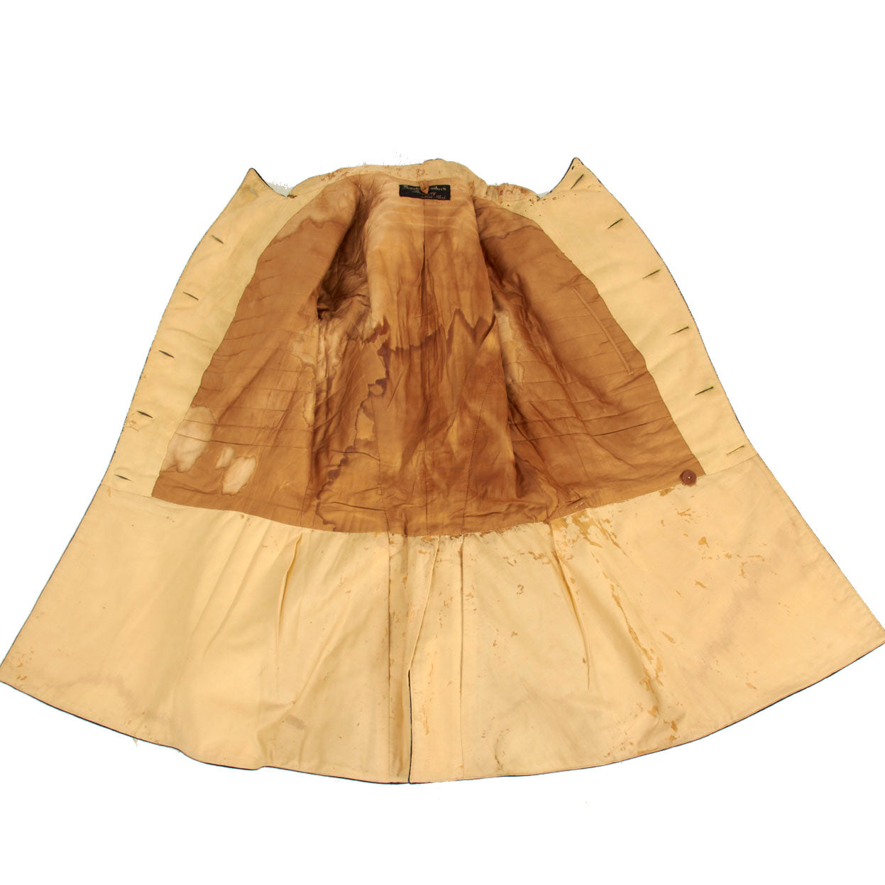 Coat features a 11 button double breasted front, with 2 small buttons on the reverse of each cuff. There are a few period repairs to the jacket, most notably on the left upper chest. The jacket is fully lined, with one interior pocket. A label for the manufacturer company is sewn to the nape of the neck. The coat does have some slight mothing here and there, as expected of a garment of this age.