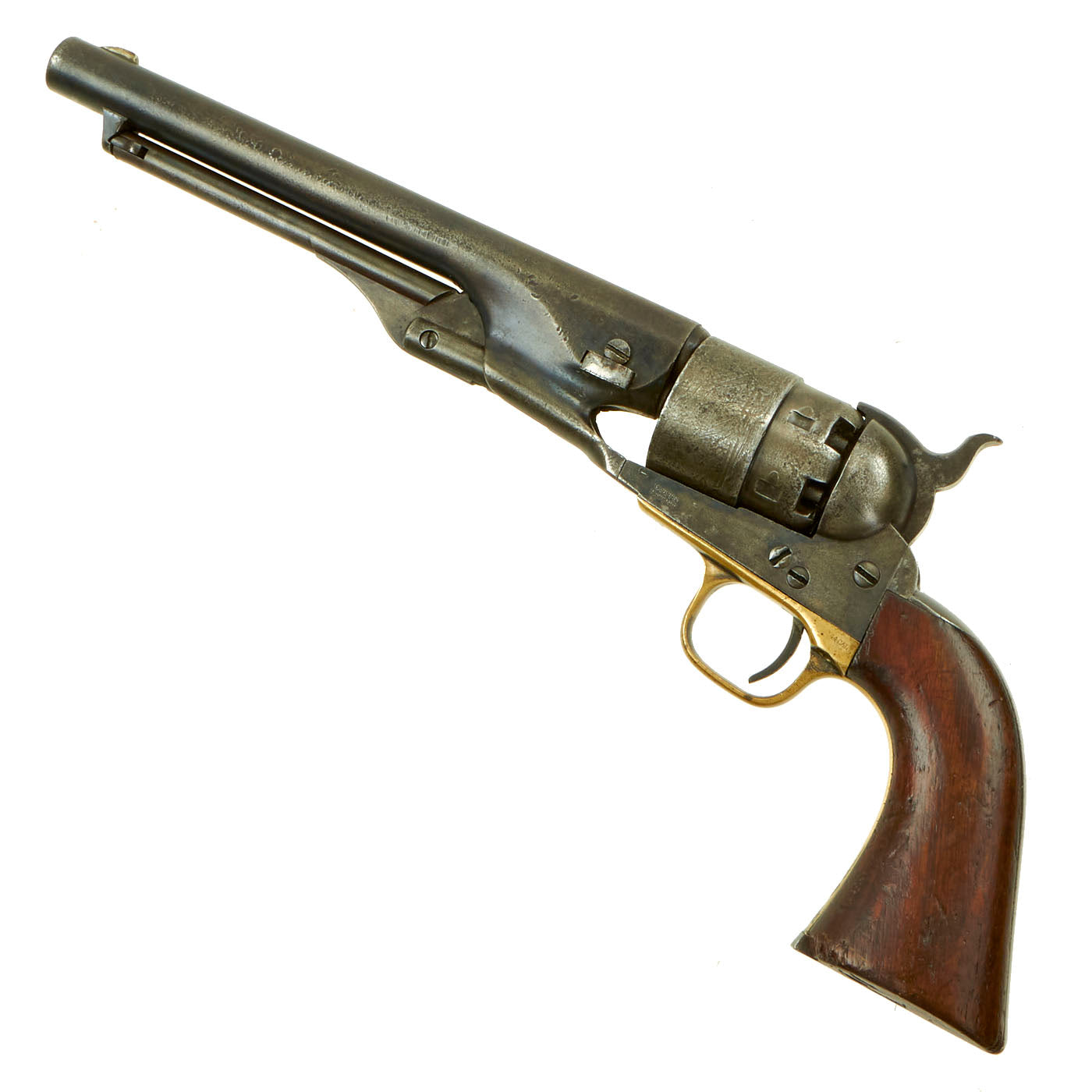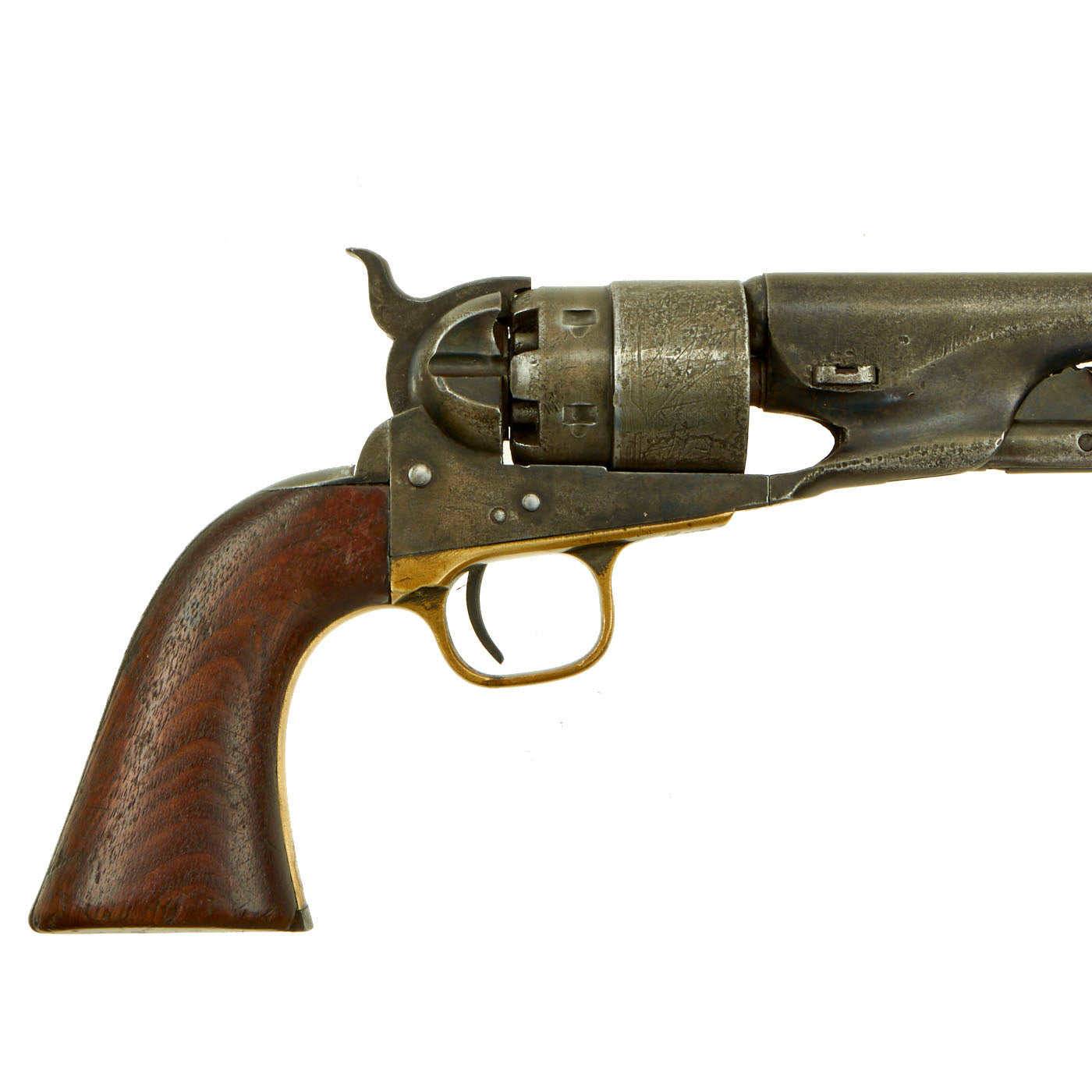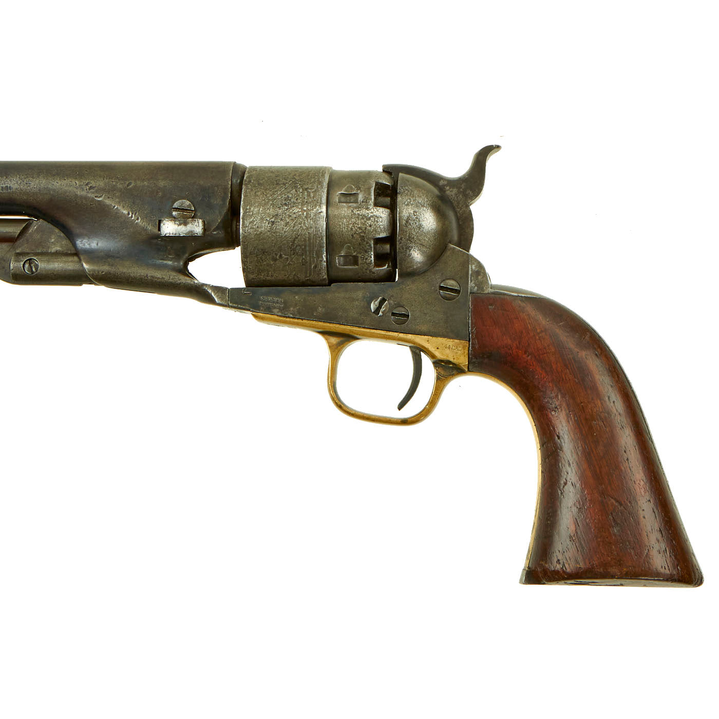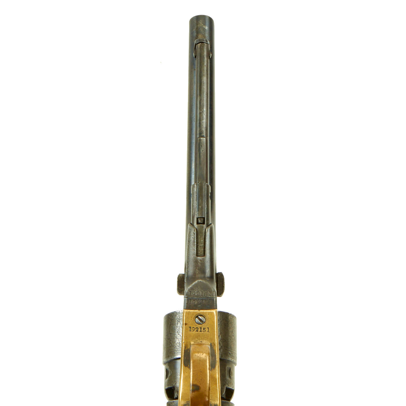 Original walnut grips are in very good condition, with a lovely color. They look to have been refinished at some point, which has unfortunately removed the inspection cartouches. The pistol is complete, and actually functions almost flawlessly. It has good indexing with a strong cylinder lockup, and a crisp dry fire. We did not notice any of the finicky behavior we often see from revolvers of this vintage. Please note that the main spring is quite strong. The bore shows strong lands and grooves with a mostly bright finish, which shows some past fouling, now cleaned away. The barrel - frame connection is wobble free. All of the cap nipples are present and clear, and only show light wear and oxidation from use.