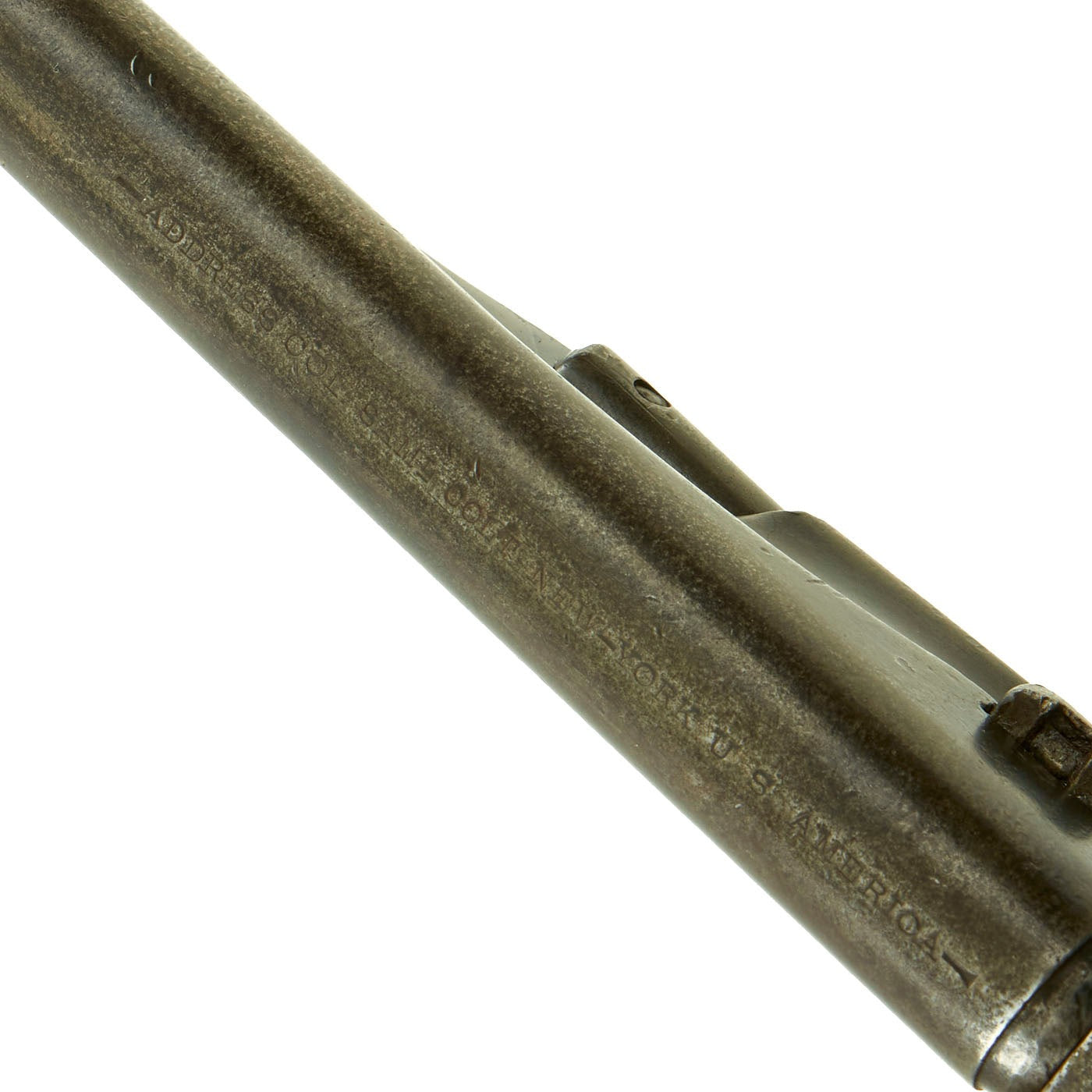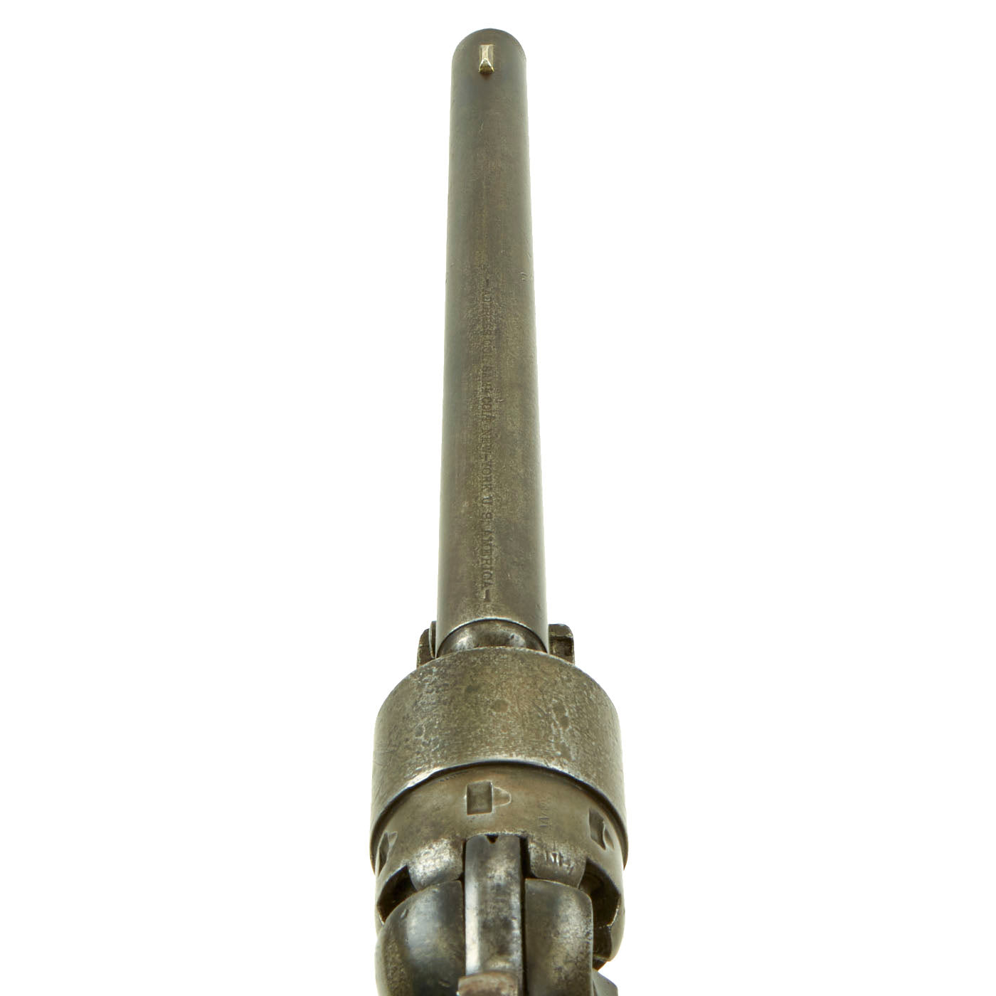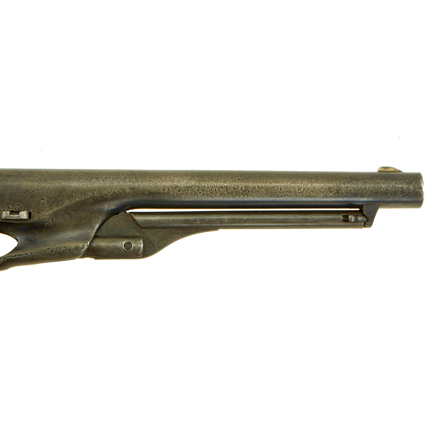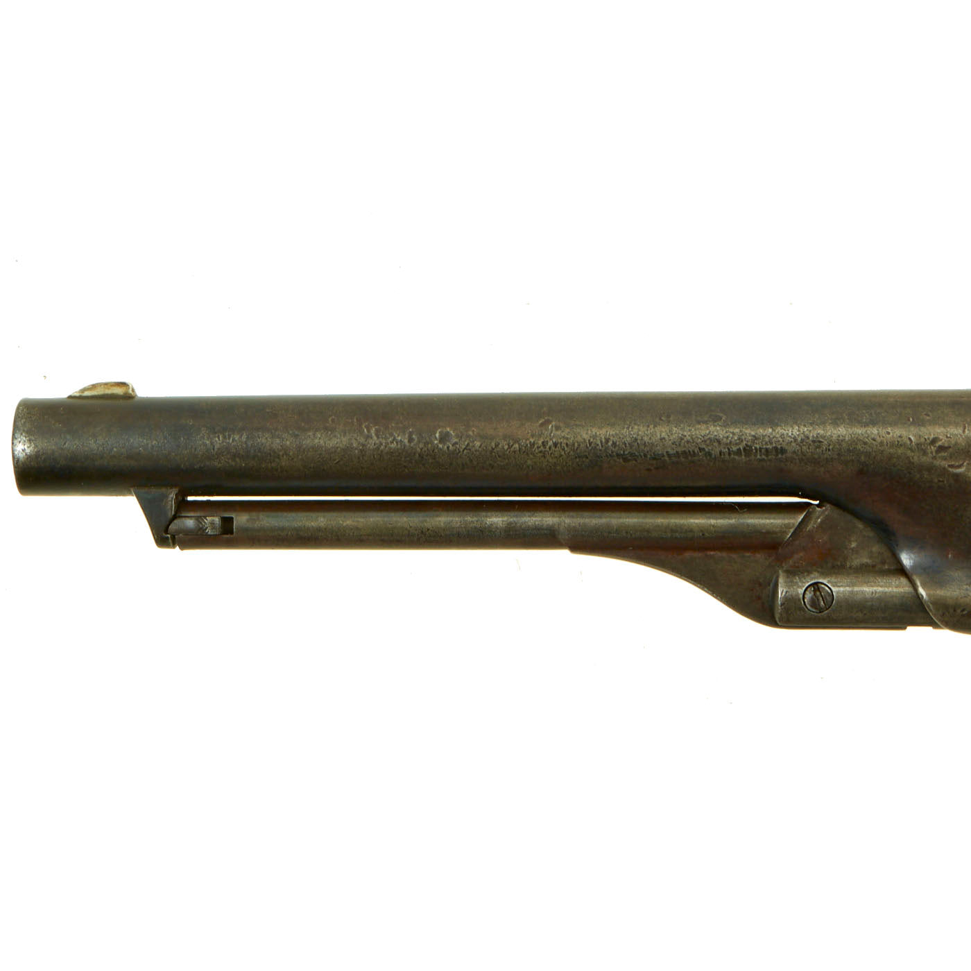 Original walnut grips are in very good condition, with a lovely color. They look to have been refinished at some point, which has unfortunately removed the inspection cartouches. The pistol is complete, and actually functions almost flawlessly. It has good indexing with a strong cylinder lockup, and a crisp dry fire. We did not notice any of the finicky behavior we often see from revolvers of this vintage. Please note that the main spring is quite strong. The bore shows strong lands and grooves with a mostly bright finish, which shows some past fouling, now cleaned away. The barrel - frame connection is wobble free. All of the cap nipples are present and clear, and only show light wear and oxidation from use.