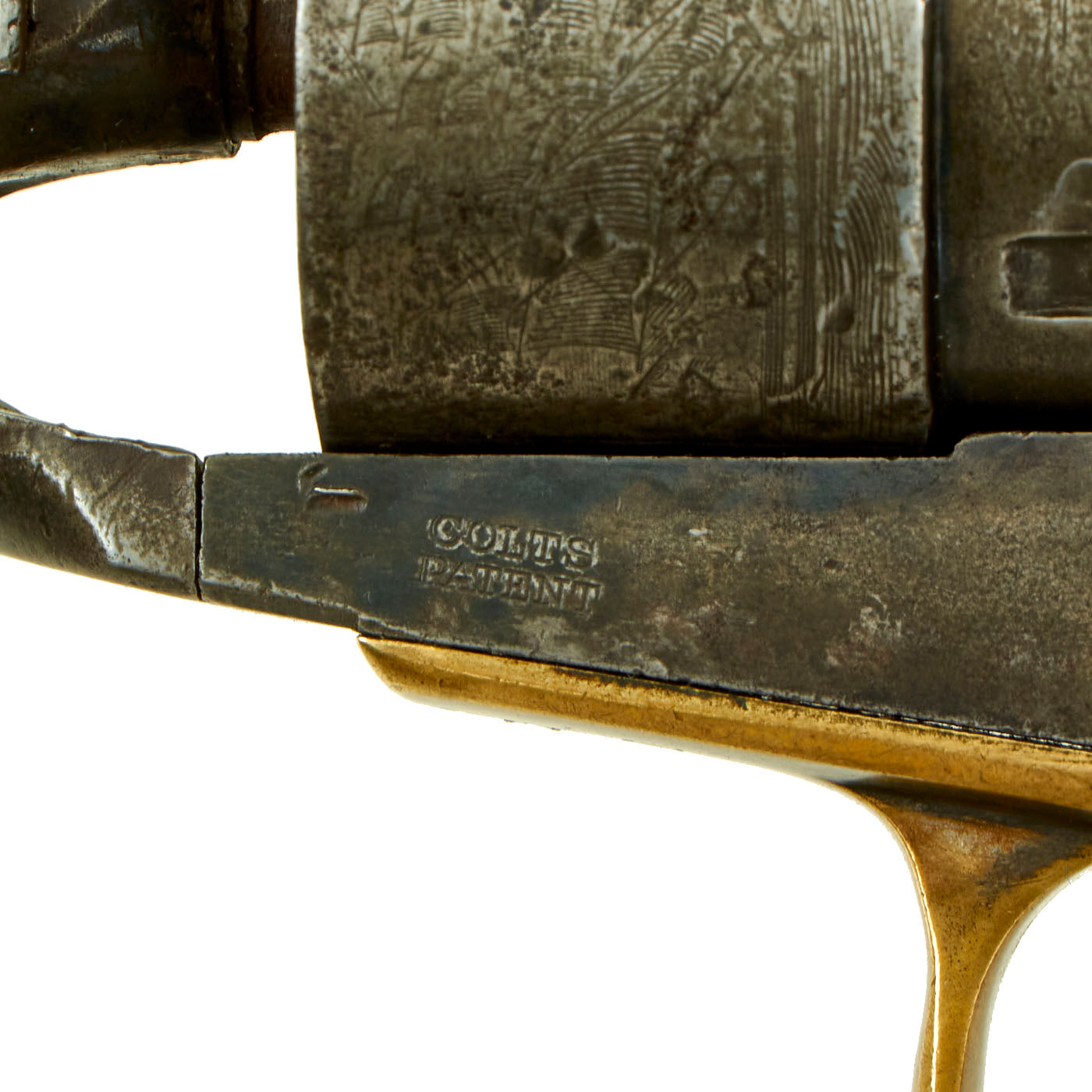 The COLT'S PATENT marking is still fully visible on the left side of the frame, and unlike most we see, it still has a clear COLT'S PATENT marking on the cylinder. More importantly, the "Naval Engagement" scene on the cylinder is about 75% complete! Most of these that we see only have traces of the scene left, and many have none left at all!