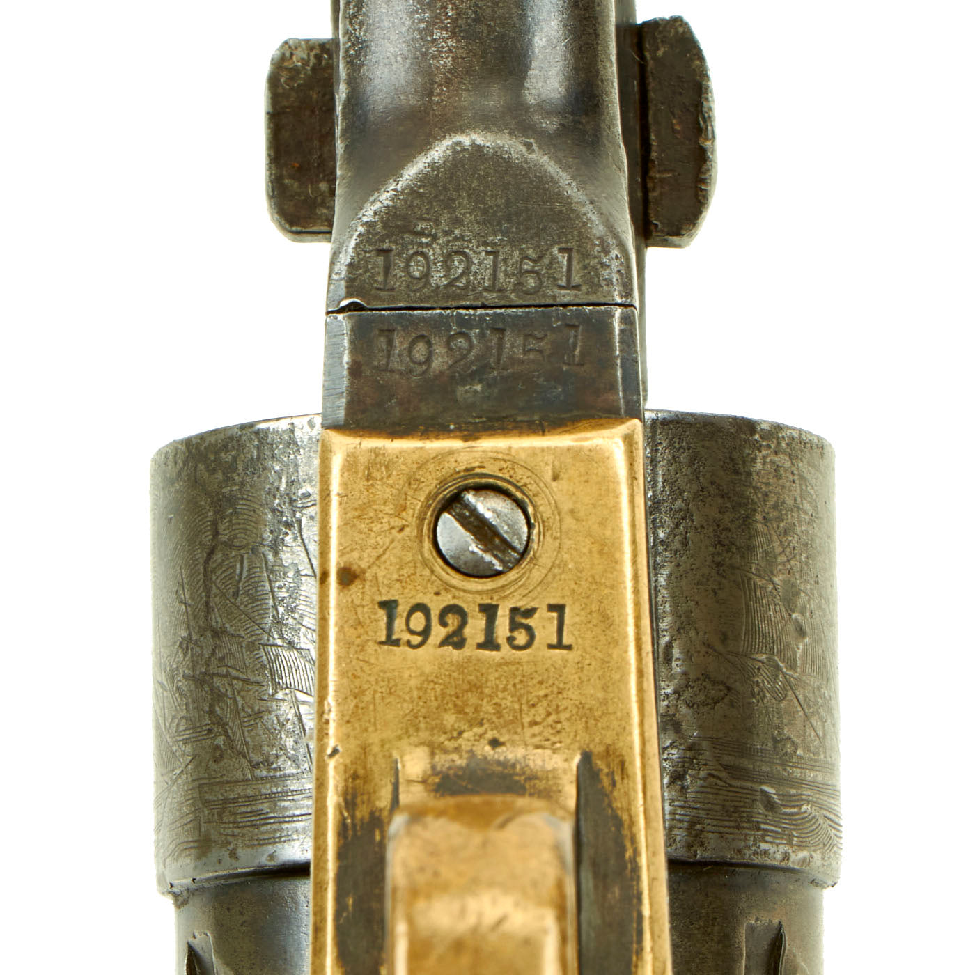 The pistol has a nice worn oxidized finish, and does not look to have been refurbished at any time. The barrel, frame, trigger guard, grip frame all bear matching serial number 192151, denoting year of manufacture as 1871. The cylinder arbor pin is marked with shortened number 2151, while the cylinder is marked with 151. The barrel wedge is an unmarked arsenal replacement.