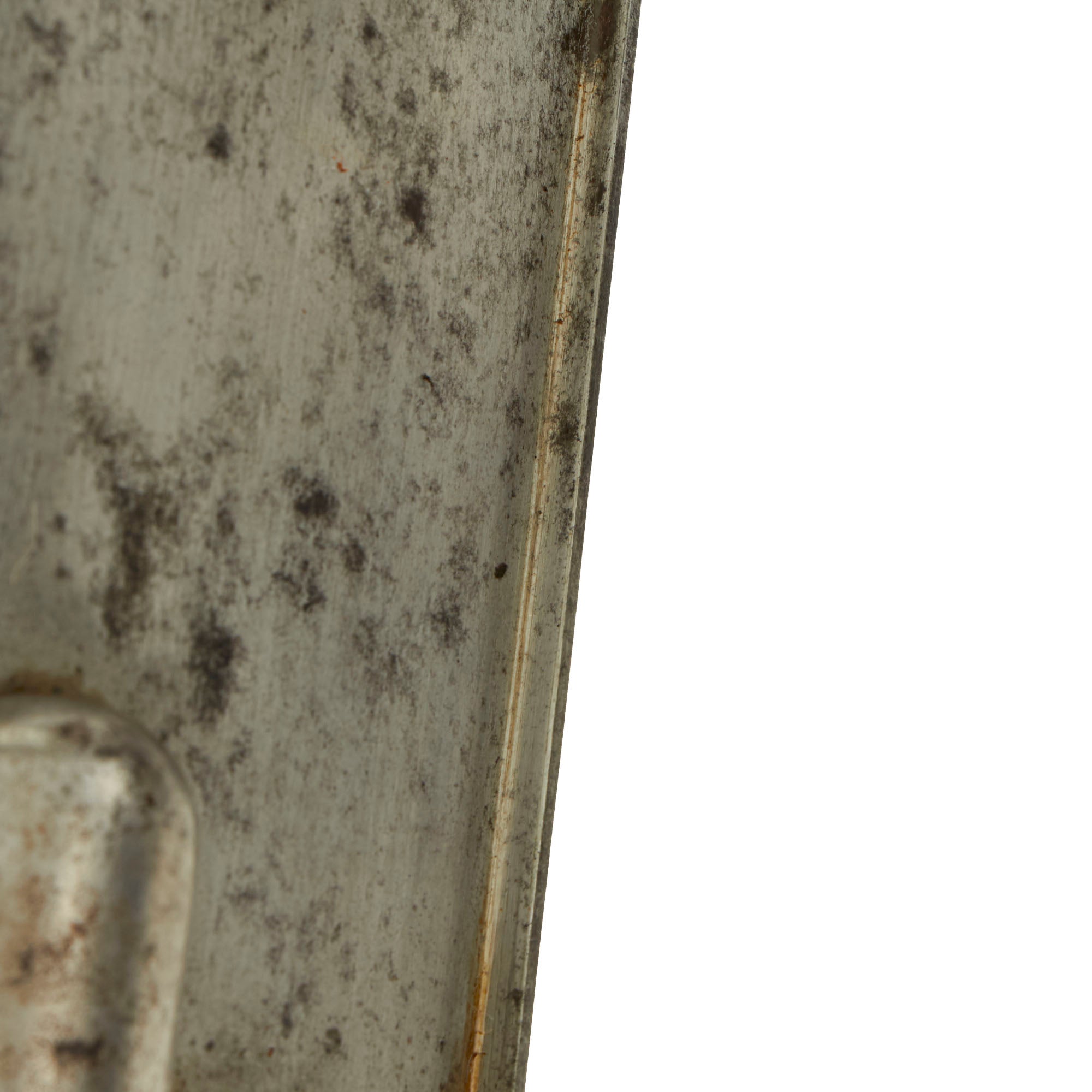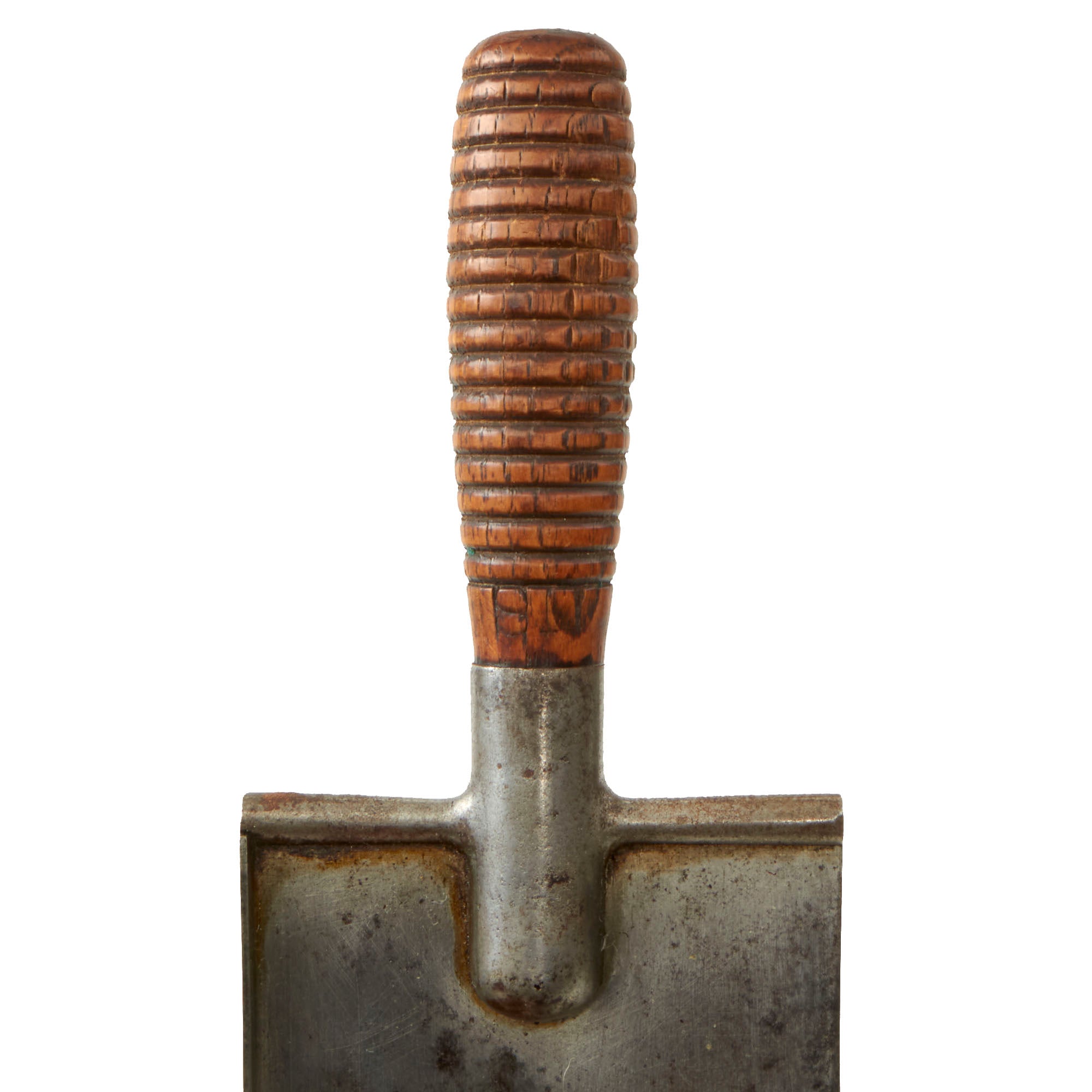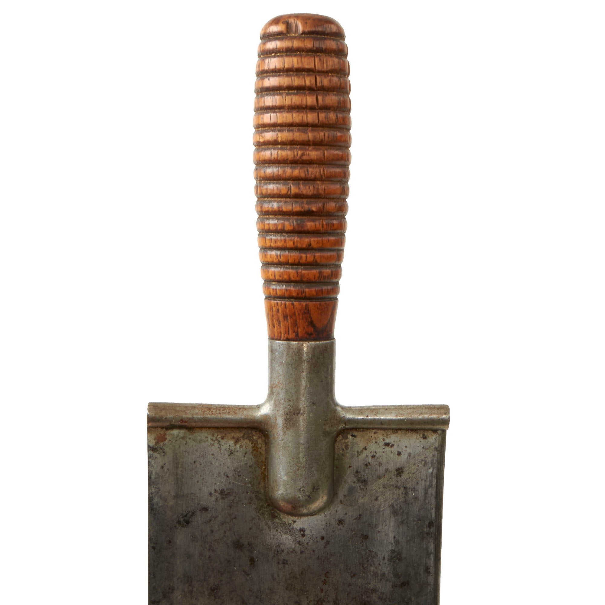 The entrenching tool and scabbard are in good condition for their age. The “blade” is in great condition with a majority of the metal still exhibiting its bright polished finish with only a few isolated spots of surface rust and staining. The ribbed wood handle is in excellent condition with all of the factory ribbing still intact and minor cracking present. The top of the handle, towards the “crossguard” section of the E-Tool still retains a lovely “U S” marking.