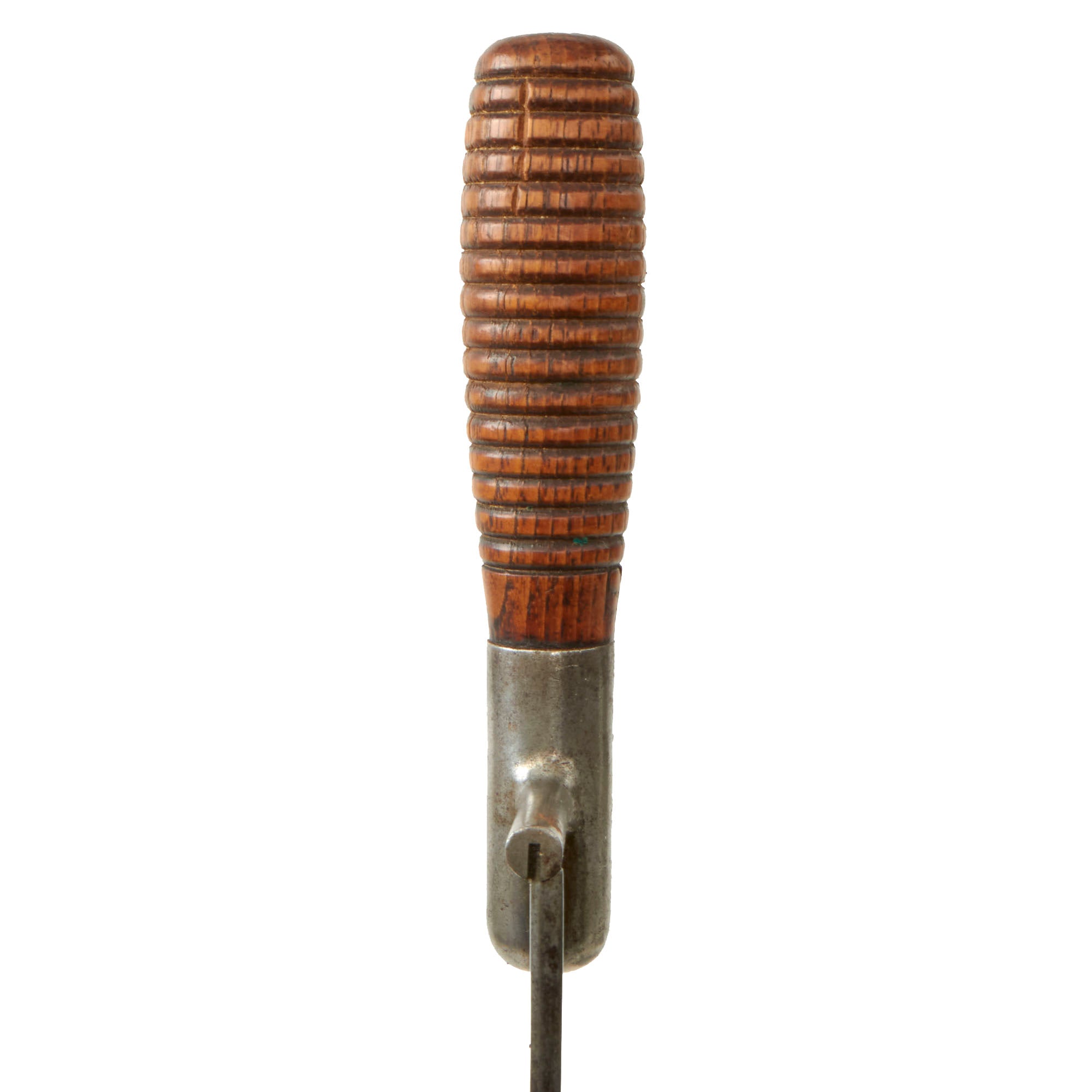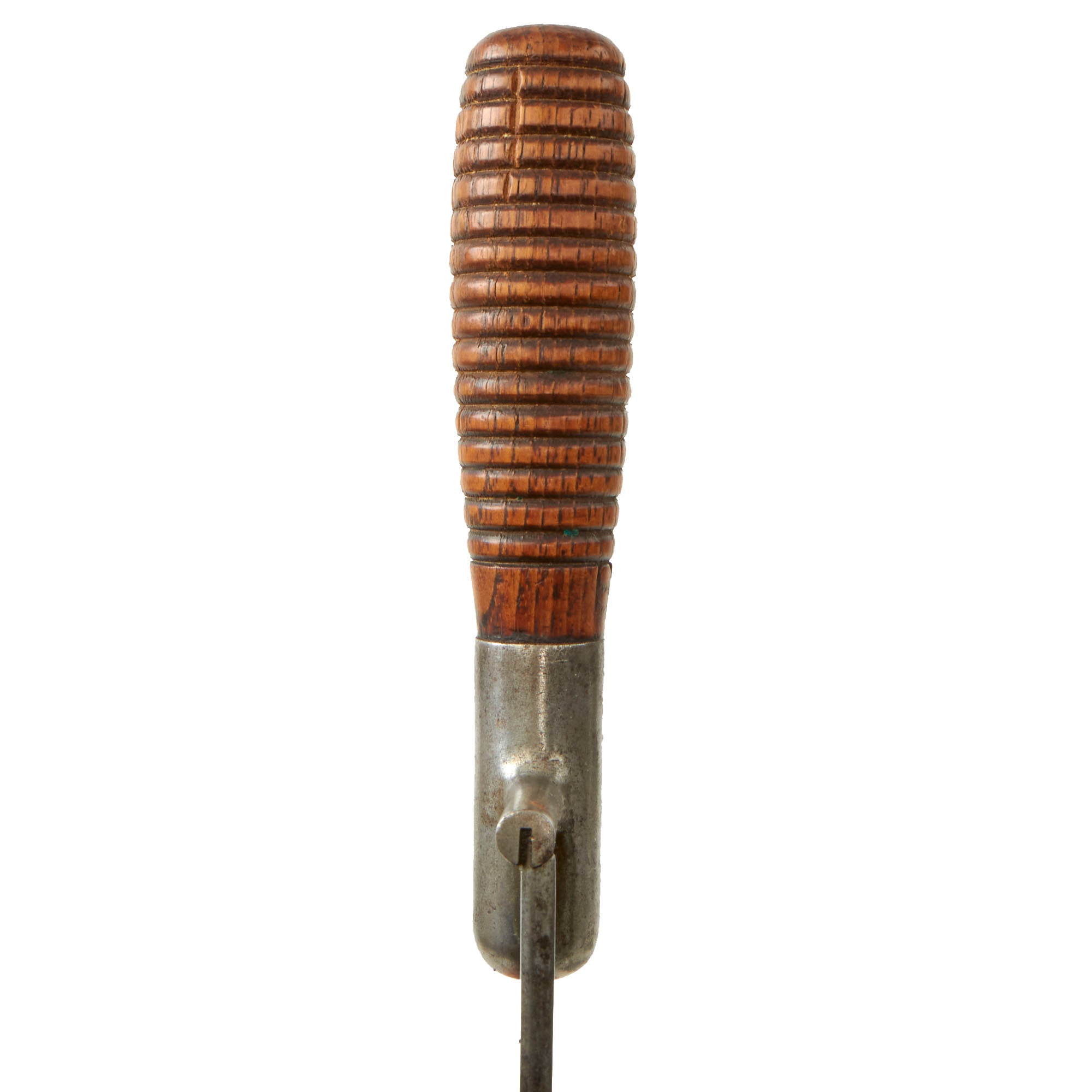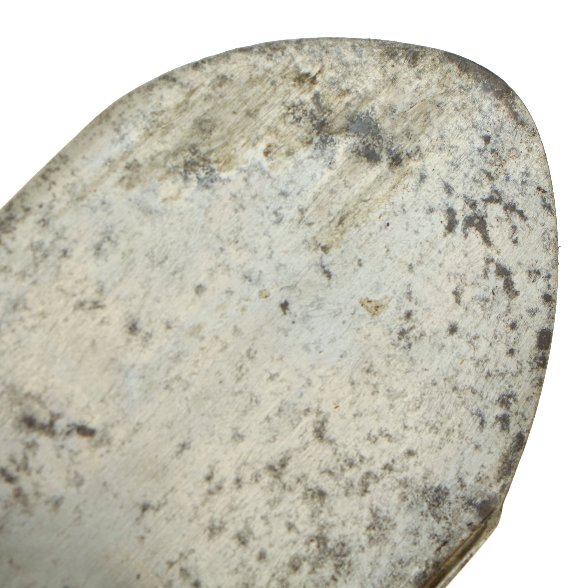 The entrenching tool and scabbard are in good condition for their age. The “blade” is in great condition with a majority of the metal still exhibiting its bright polished finish with only a few isolated spots of surface rust and staining. The ribbed wood handle is in excellent condition with all of the factory ribbing still intact and minor cracking present. The top of the handle, towards the “crossguard” section of the E-Tool still retains a lovely “U S” marking.