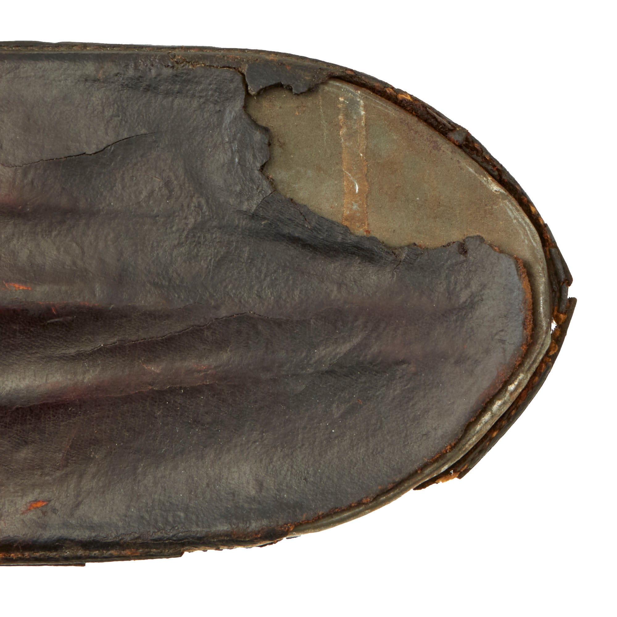 The leather scabbard is in beautiful condition, still exhibiting a gorgeous original russet color to the boiled leather scabbard. The leather portion is unfortunately quite worn with stitching loss as well as material loss, now exposing the bottom of the inner sheet steel. Remarkably, the leather is not dry at all but it still has a delicate feel to it. The top left of the face of the scabbard still has a visible and lovely US stamp present. The brass hardware is mostly complete though is missing the back suspension ring and has a beautiful aged patina to it.