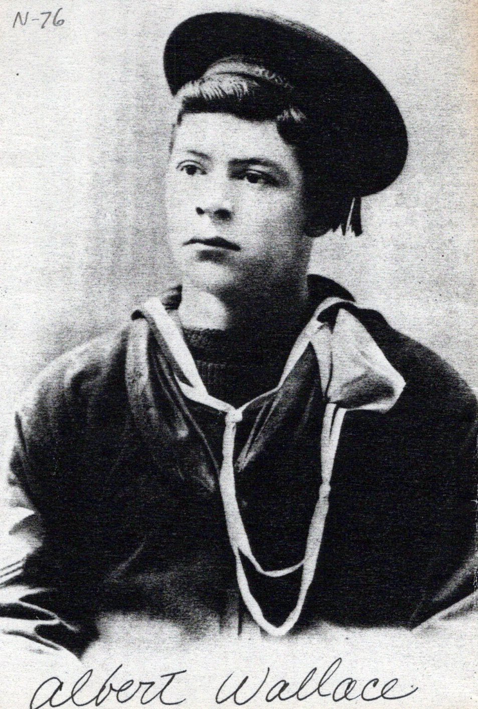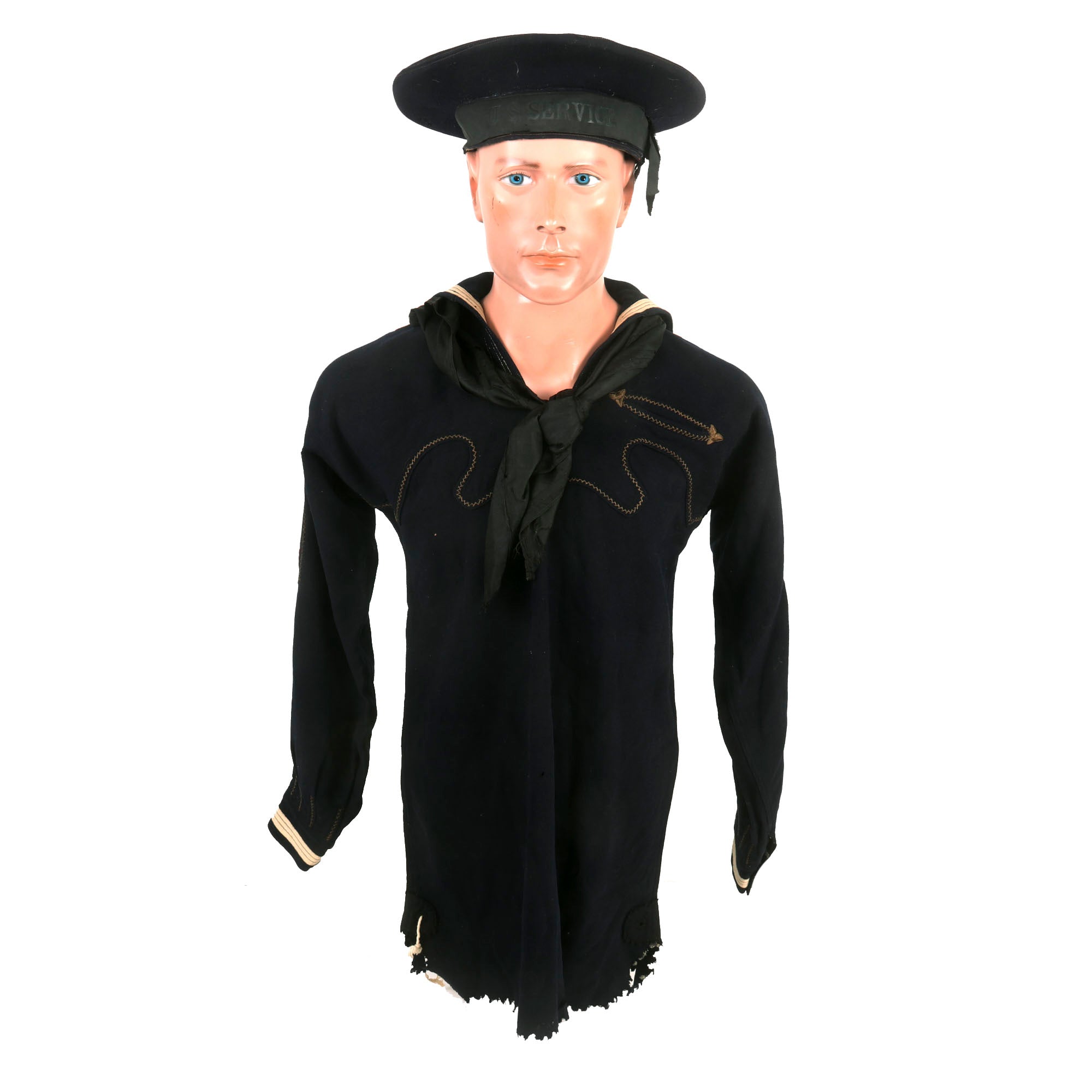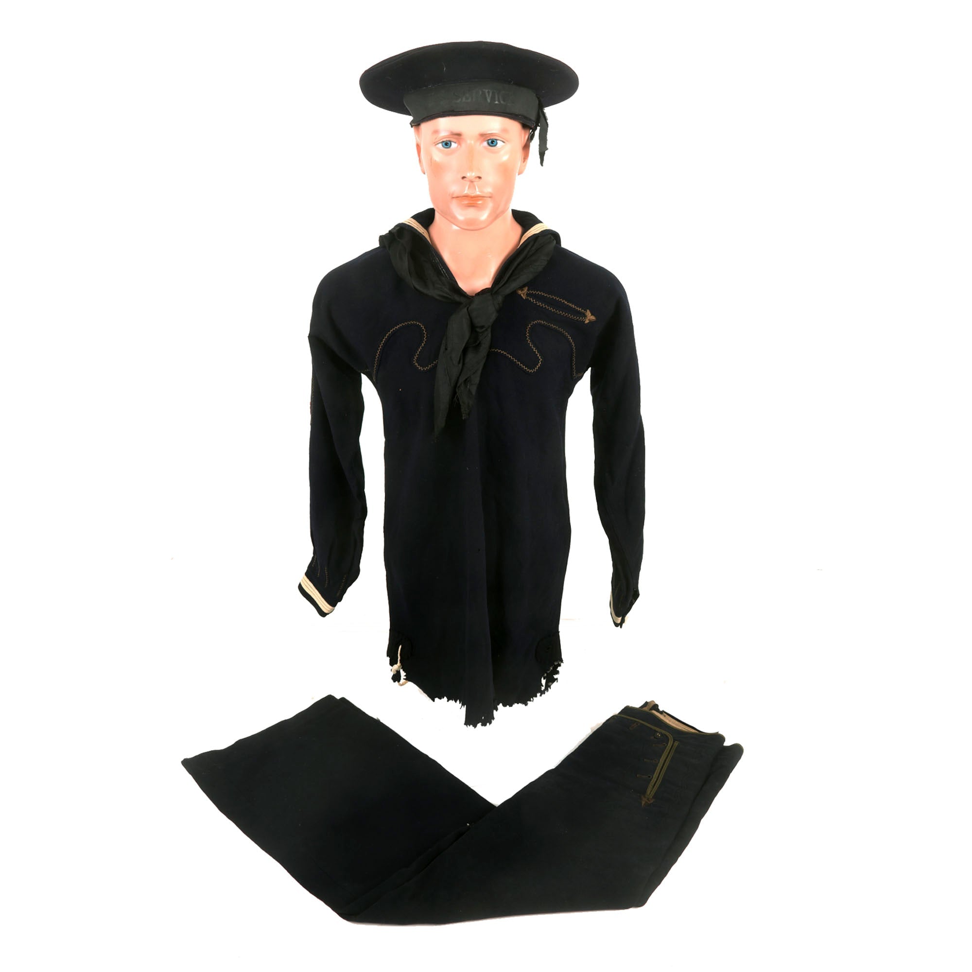 Original Set. One-of-a-Kind. This is one of the most tremendous Naval uniforms we have offered at IMA, a gorgeously sewn jumper & trousers to Machinist’s Mate Albert Wallace, who served in the U.S. Navy in the late 19th century. The grouping includes his Navy jumper & trousers, which are uniquely designed and stitched with gorgeous patterns and fringed edges, along with a custom-stitched navy rate on the sleeve. The grouping also includes his flat cap, his black neckerchief, and a copy of a photograph of him with his name written at the bottom.