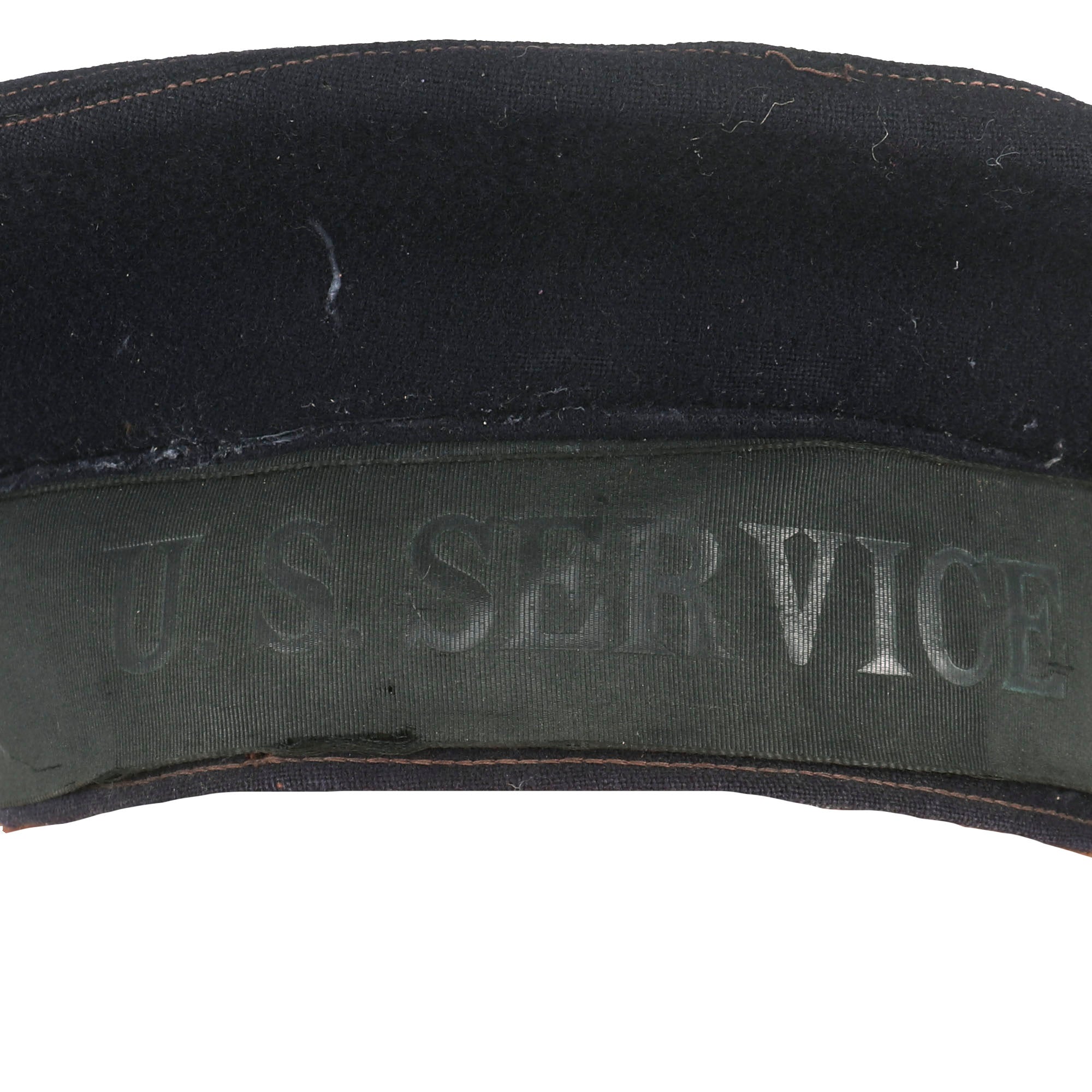 The flat cap in this group bears a cap tally reading U.S. SERVICE in gray lettering which is in line with late 19th century flat cap tallies. The cap is secured to the head via a lace which is tightened in the back of the cap, the laces secured within small metal grommets. The cap retains its leather sweatband which is very old and delicate. There is scattered mothing across the cap.