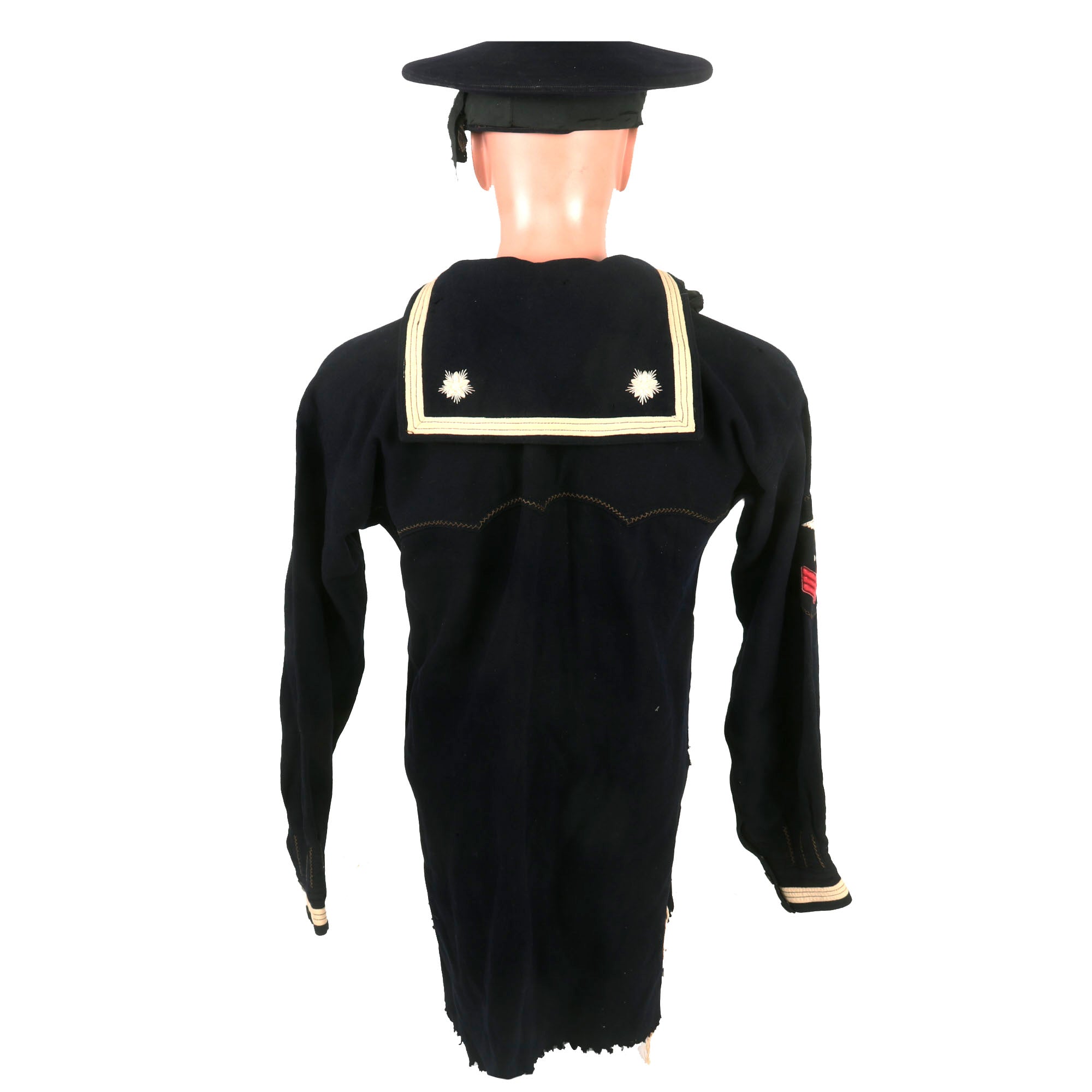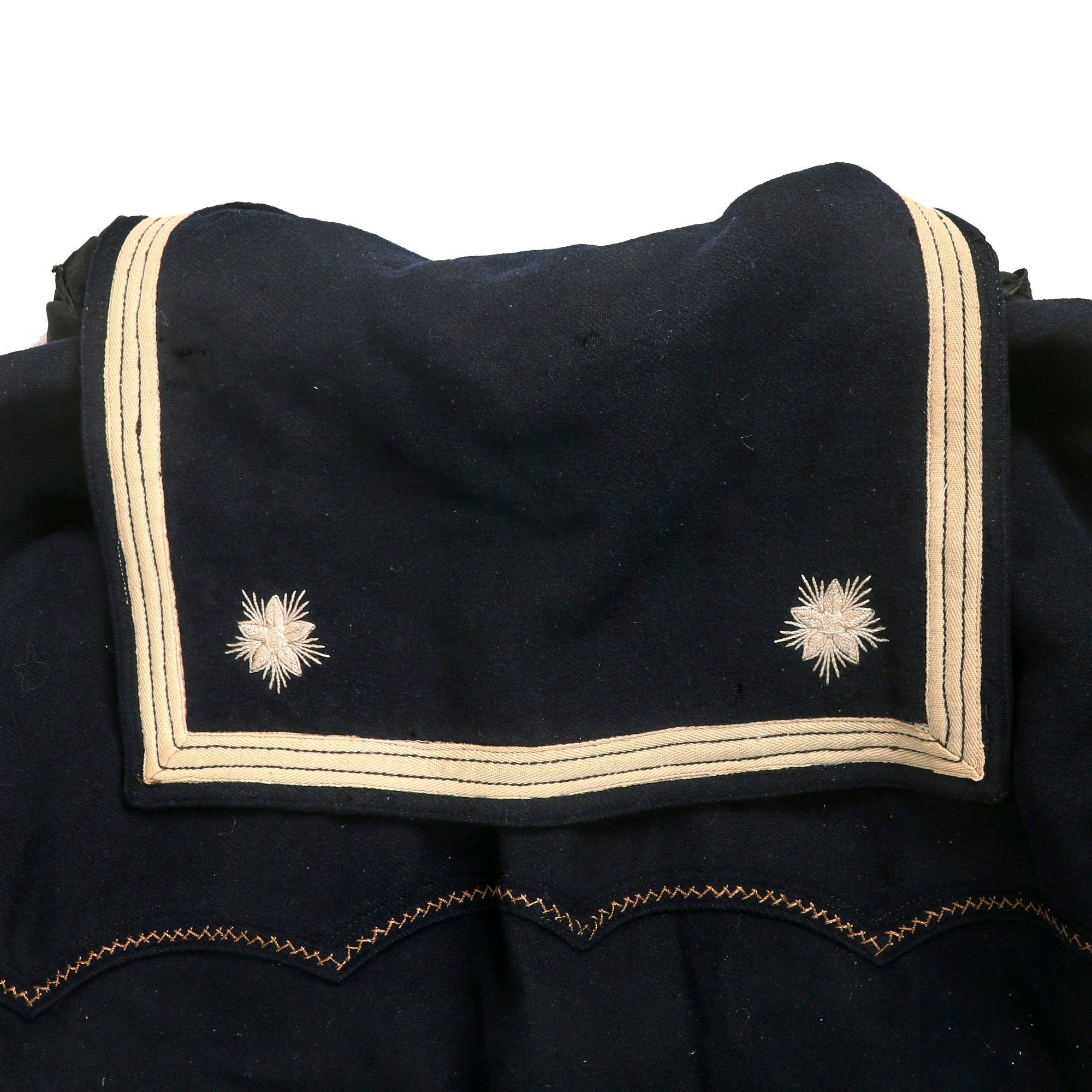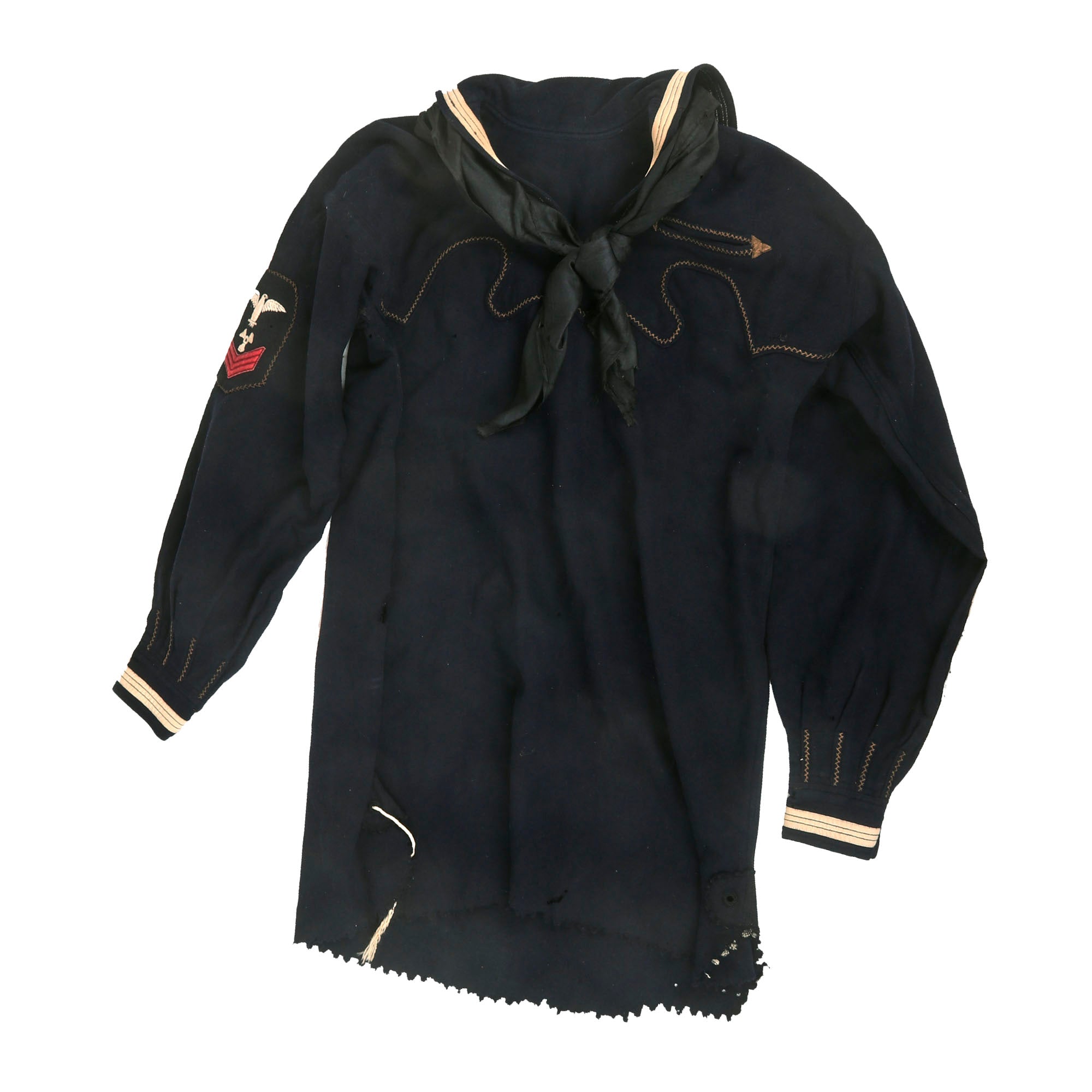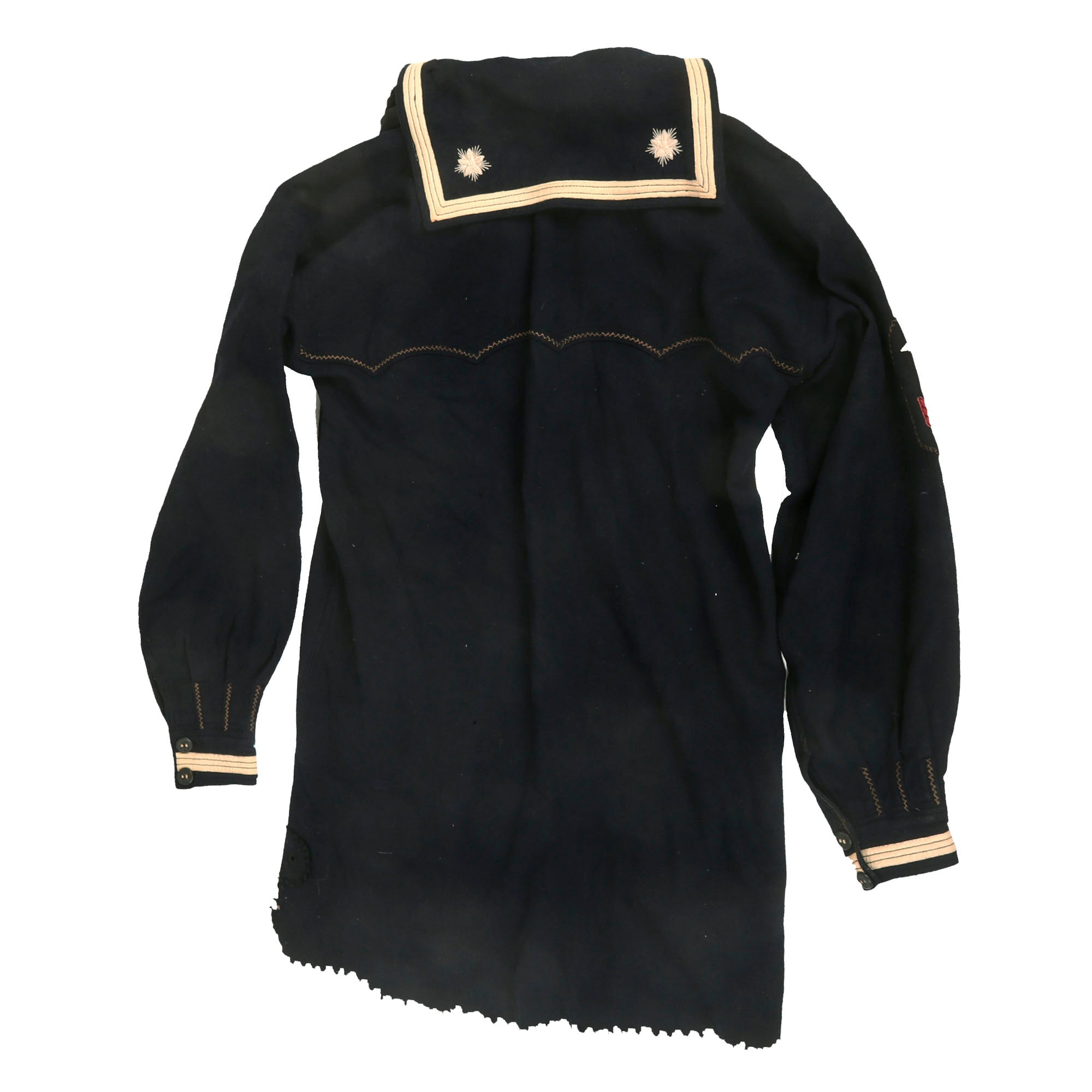 The jumper is modeled based off of the 1886 Navy Regulations,. The breast of the jumper bears a very unique stitching pattern which is also found on the breast pocket. The bottom edges of the jumper are fringed in a zig-zag pattern, with this pattern also found on the small holes to each seam, one of which has a white string for tightening. The right sleeve bears a cross-stitched rate for Machinist’s Mate 1st Class which is handmade according to the 1886 Regulations. The cuffs bear receding stitch patterns in the same style. The back flap of the uniform, which normally bears two stitched stars, bears two flowers, with a wavy stitch pattern below the flap. There is scattered mothing across the jumper. The jumper is complete with its original black neckerchief which shows very heavy use with some tears throughout.