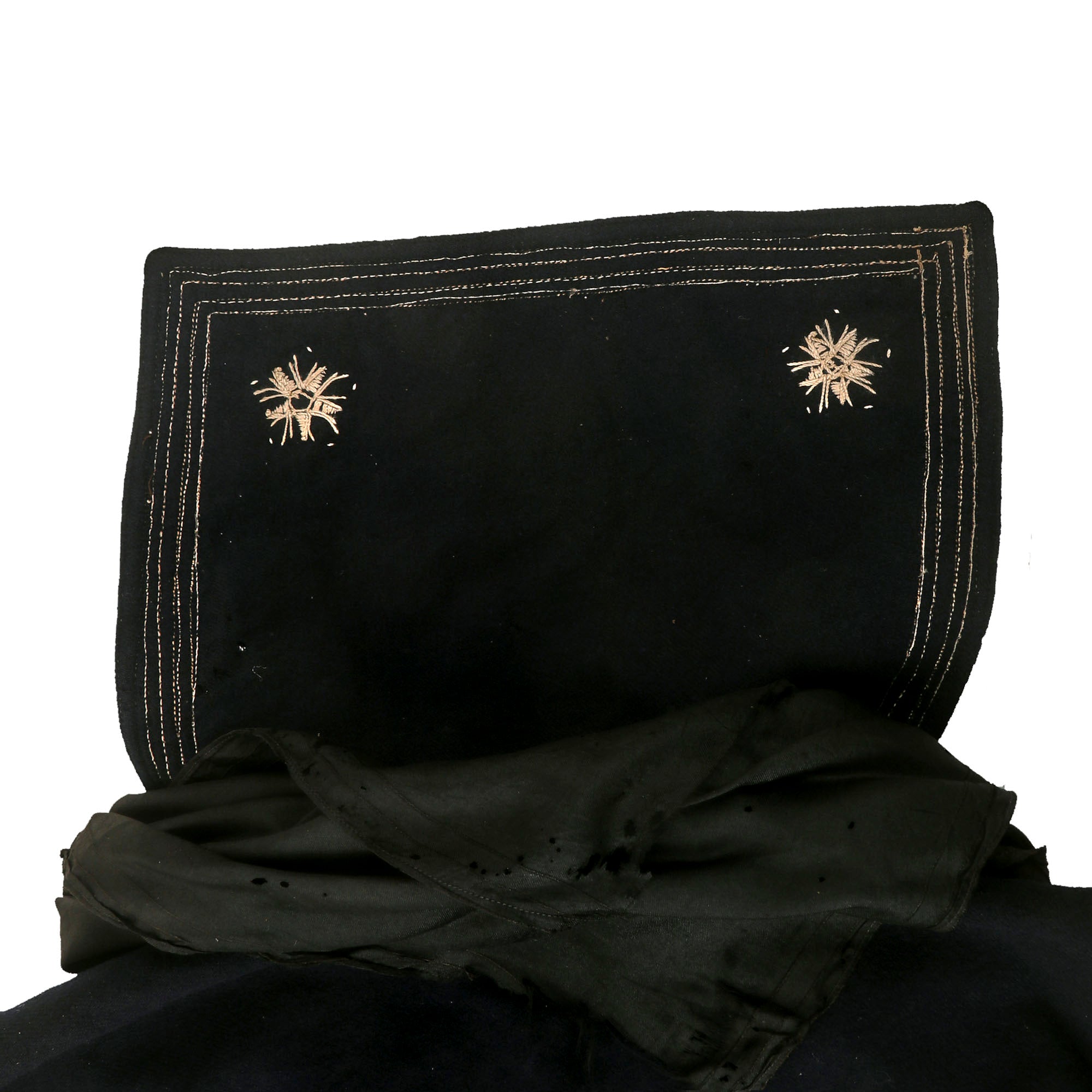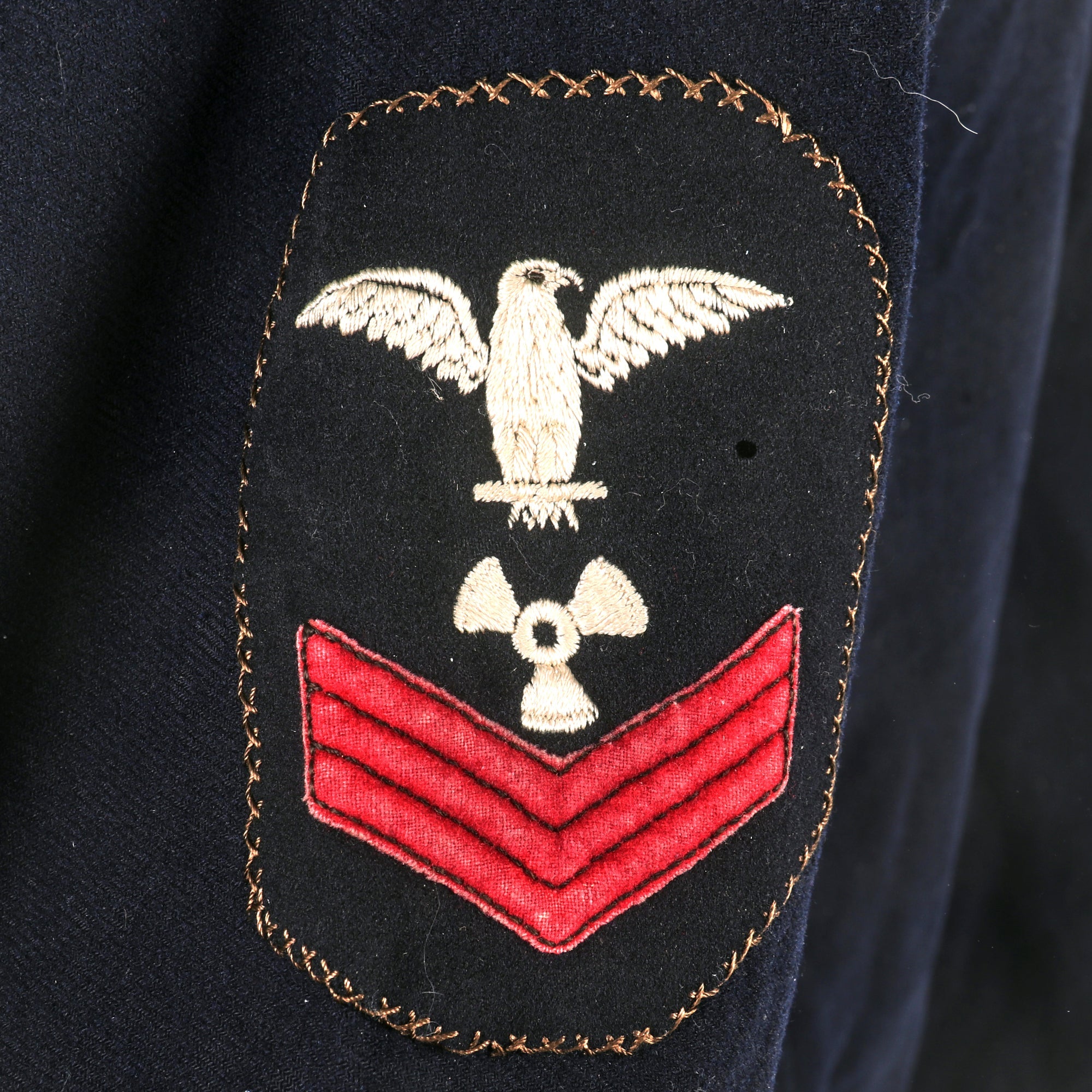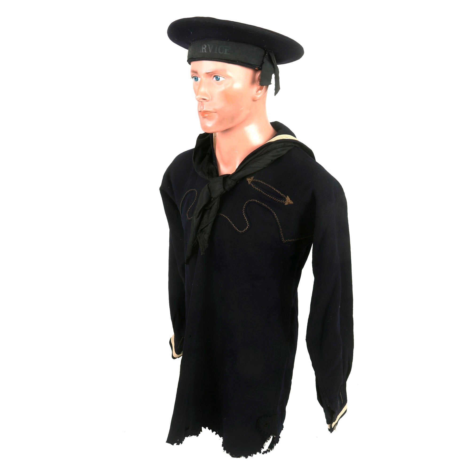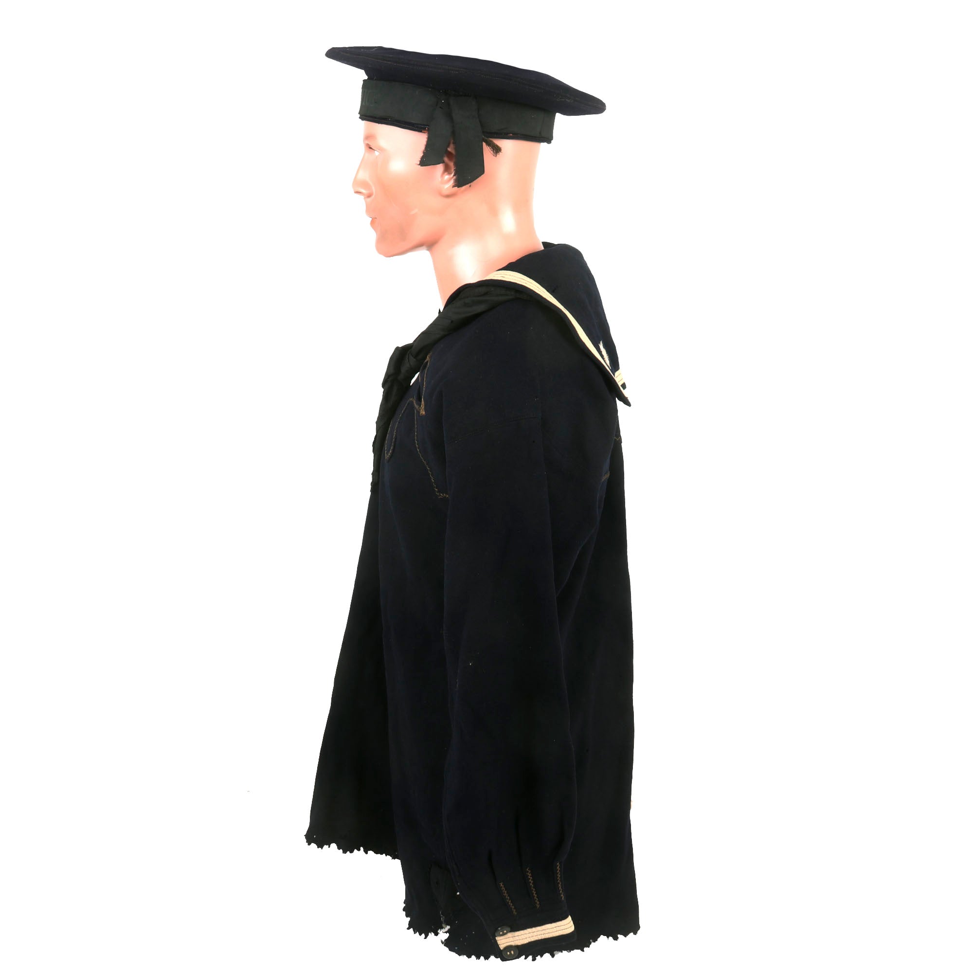 The jumper is modeled based off of the 1886 Navy Regulations,. The breast of the jumper bears a very unique stitching pattern which is also found on the breast pocket. The bottom edges of the jumper are fringed in a zig-zag pattern, with this pattern also found on the small holes to each seam, one of which has a white string for tightening. The right sleeve bears a cross-stitched rate for Machinist’s Mate 1st Class which is handmade according to the 1886 Regulations. The cuffs bear receding stitch patterns in the same style. The back flap of the uniform, which normally bears two stitched stars, bears two flowers, with a wavy stitch pattern below the flap. There is scattered mothing across the jumper. The jumper is complete with its original black neckerchief which shows very heavy use with some tears throughout.