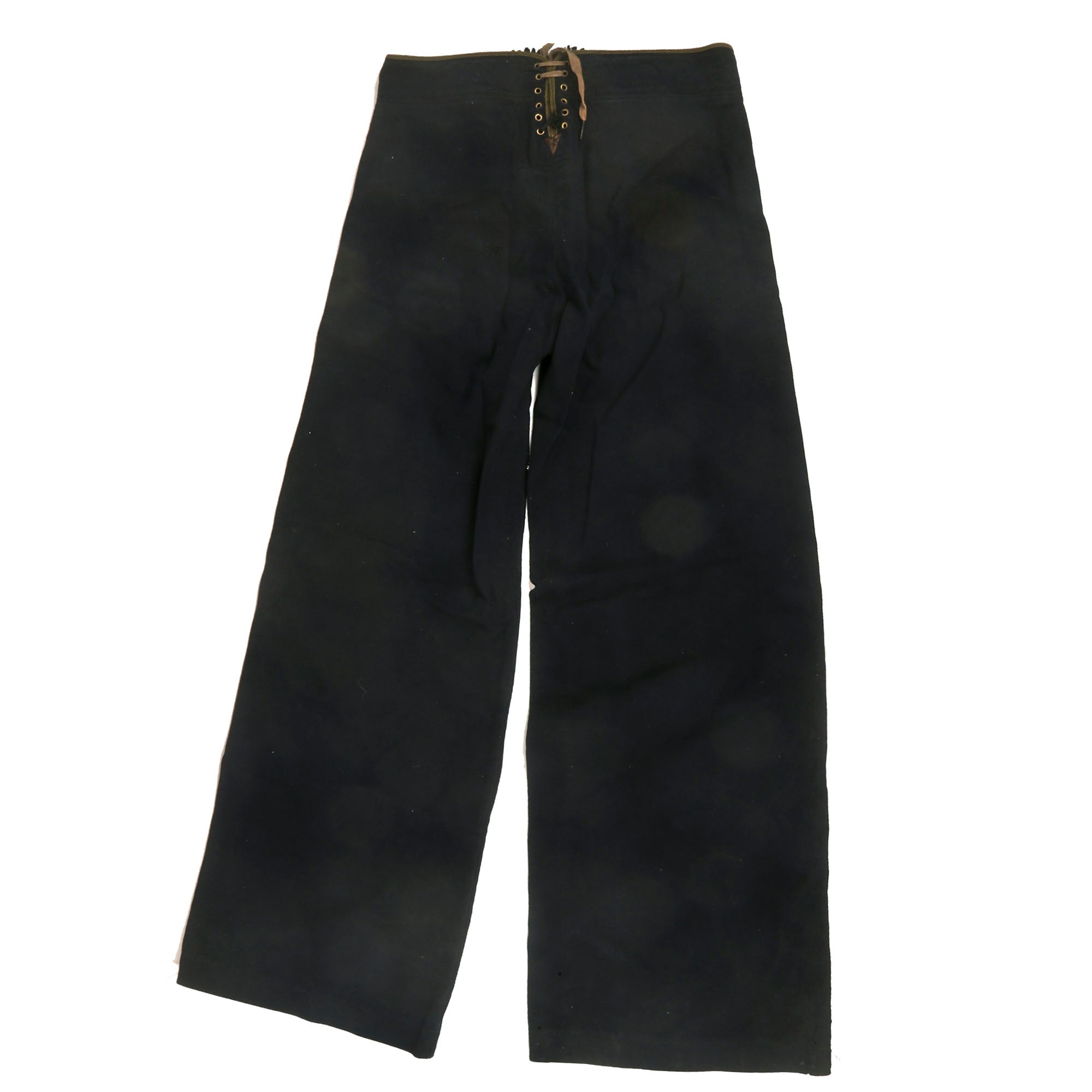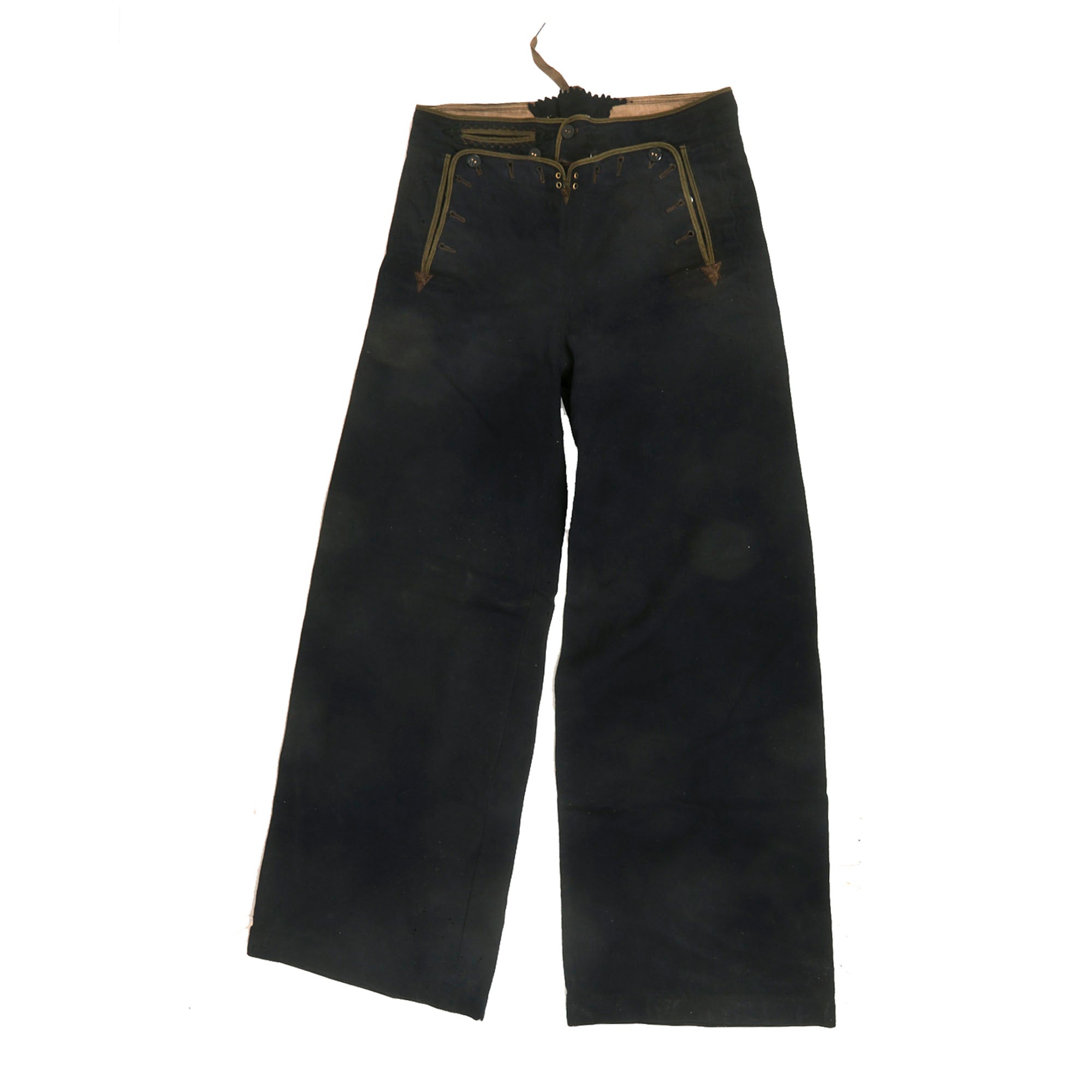 The trousers are equally as gorgeous, with even more ornate & meticulous stitching patterns integrated into the “butt flap”. The uniform bears the 1886 regulation navy buttons, featuring an anchor with four small holes for stitching. There is a gorgeous wavy stitch pattern around the edges of the flap with an extra-reinforced back pocket. The pants are in fantastic shape with just light mothing. Pieces of the interior also bear the zig-zag fringing pattern.