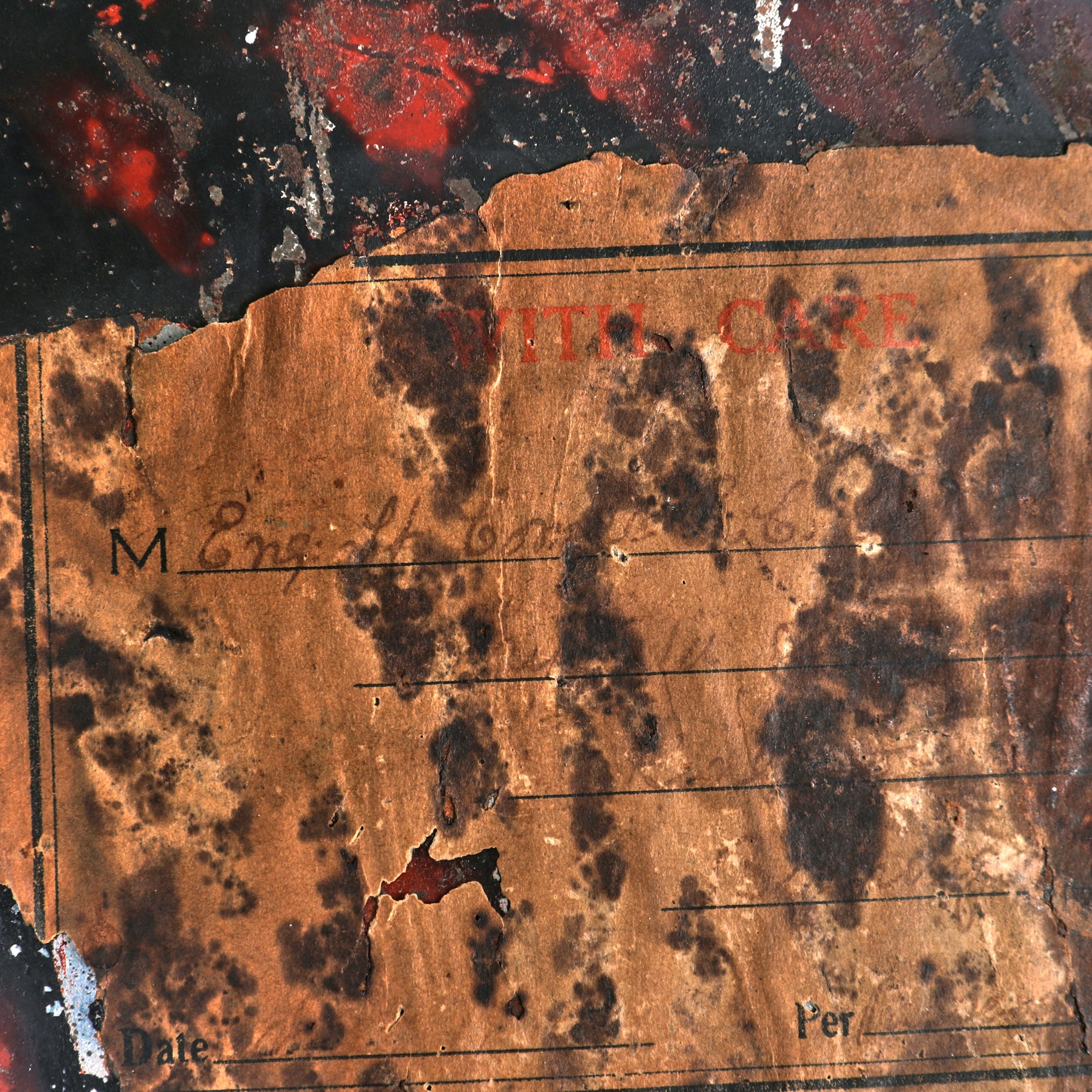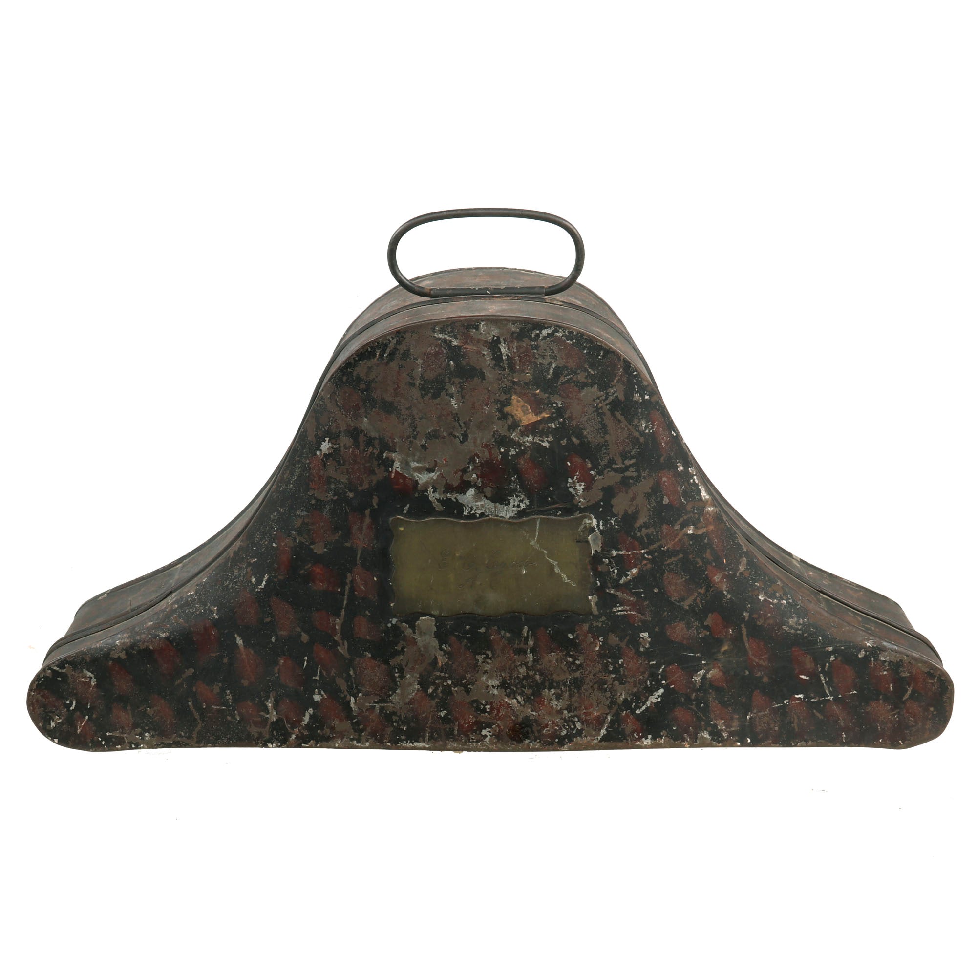The lining is torn down the center from years of being folded and unfolded which made the label only partially readable. The feathering on the top is unfortunately detached in areas and falling down the sides. There is fur loss on the body which is unfortunately noticeable on the front. The bullion cockade is present as described but there is color and material loss. The tin container is still very solid with great paint and partial paper labels. The front has a plaque reserved for the name of the owner. This example reads as E. C. Crow though we have not been able to locate any service information on him.