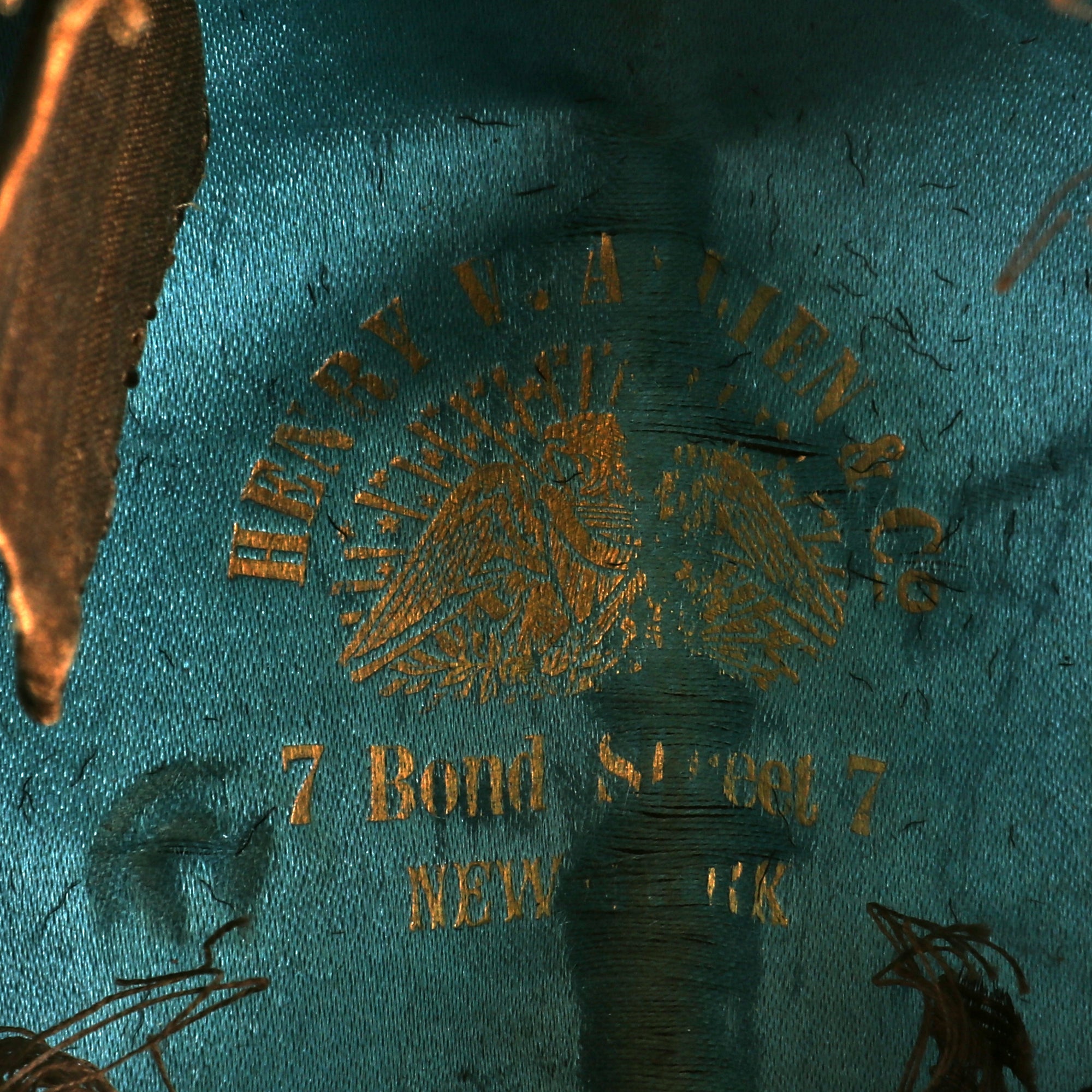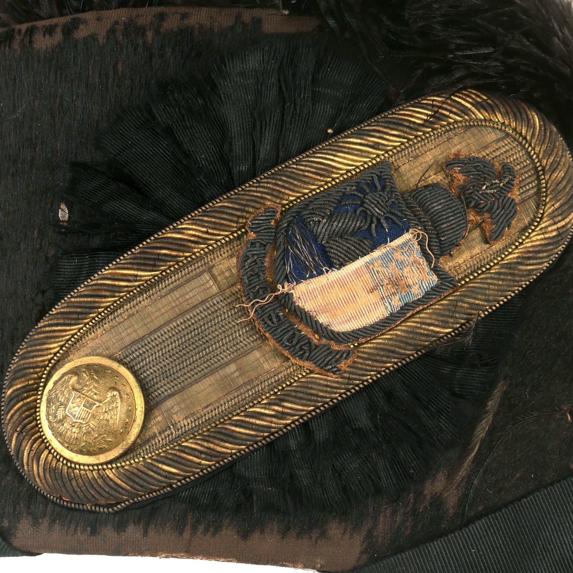 The hat features a gilt cockade with gilt wire bullion embroidered spread wing federal eagle. Of note is that the Federal Shield on the body of the bullion eagle is hand embroidered in full color (normally the shield is solid gold bullion). These Caps were universal, with the only distinction being the branch of service button affixed to the cockade on the right side of the cap or the insignia much like this one, which is the standard New York “Excelsior” crest.