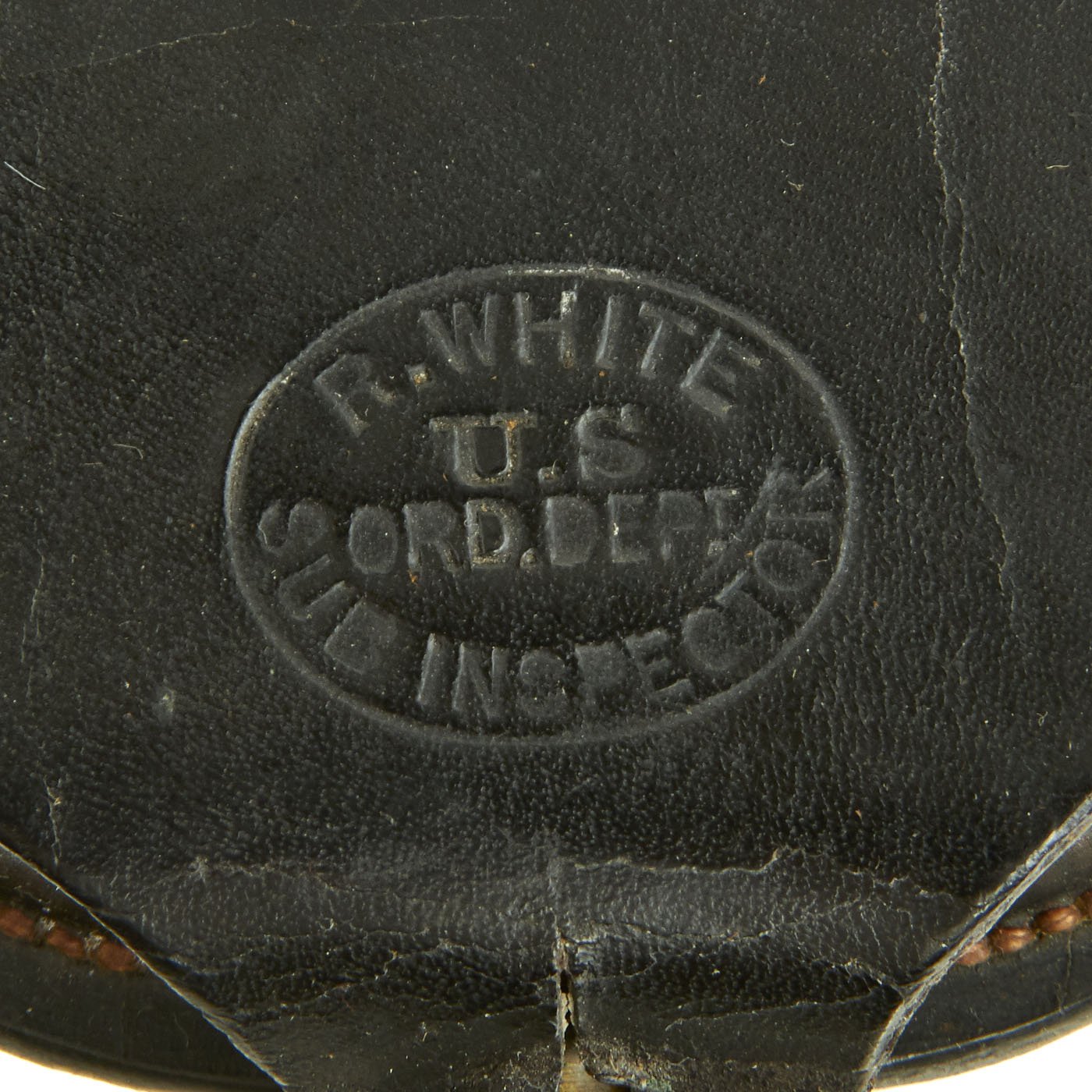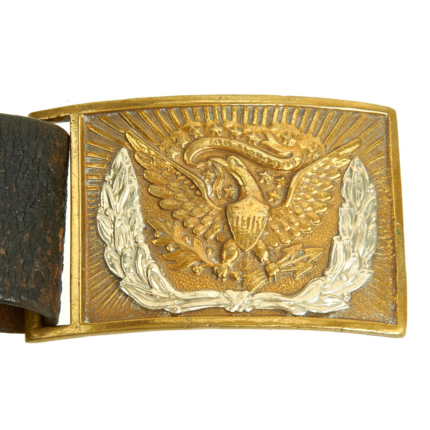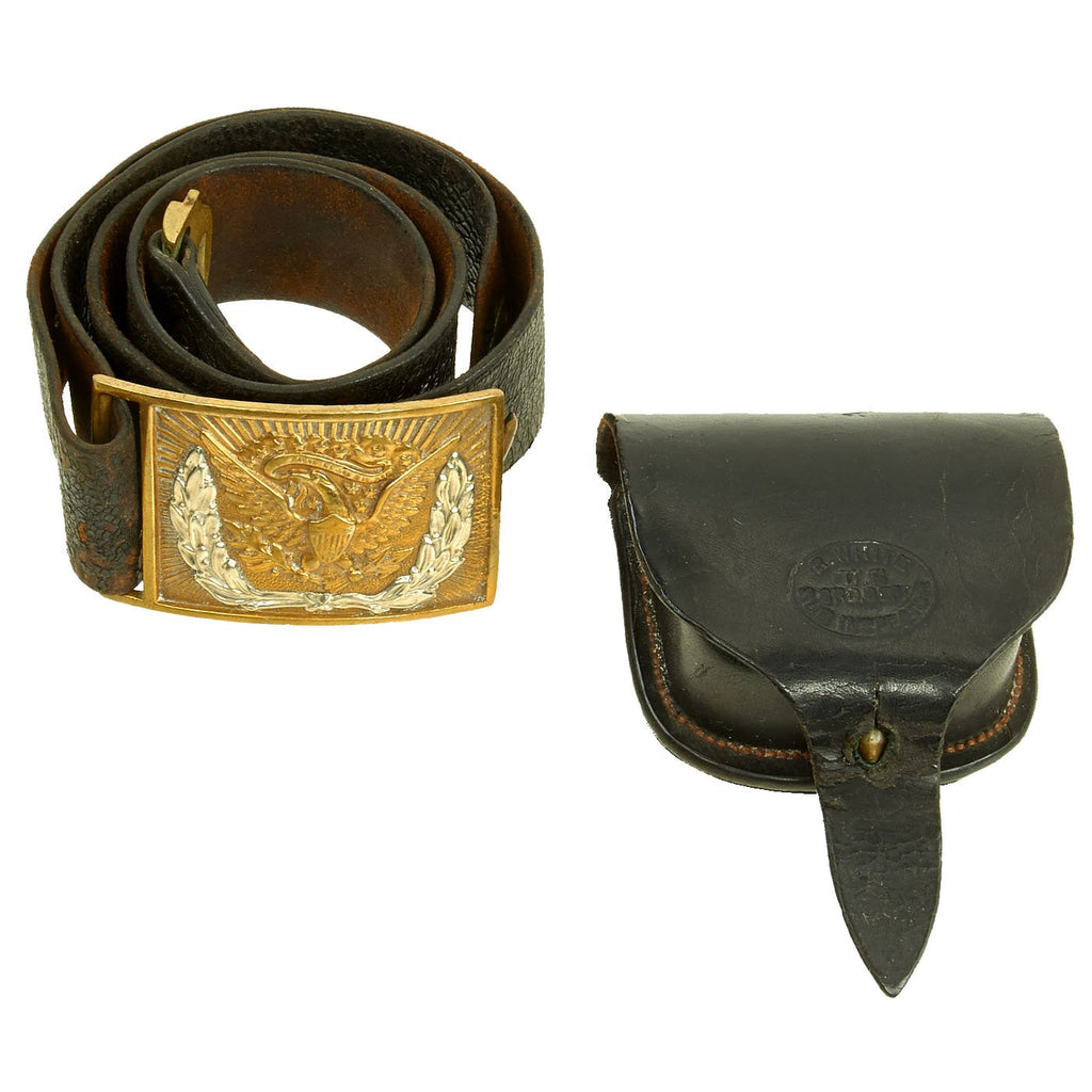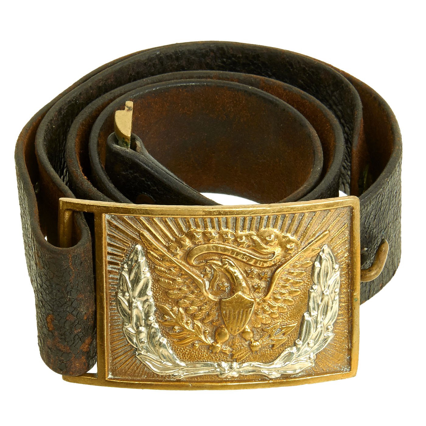 Original Item: Only One Available. This is an 1890s high quality brass eagle plate with silvered laurels and cast eagle. The buckle measures 2 14" x 3 1/4 and has been mounted to a 40 inch by 1 5/8 leather officer waist belt. The leather is sound and pliable displaying normal age and wear. Overall very good condition. Also included is a leather cap box with very nice R. WHITE U.S. ORDNANCE DEPT. Inspection stamp. Box still retains the internal wool padding and has maker stamp from Newark, New Jersey. Offered in excellent condition.