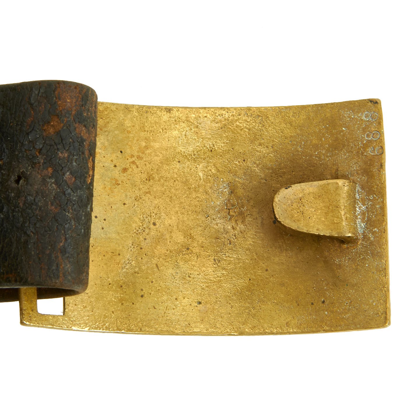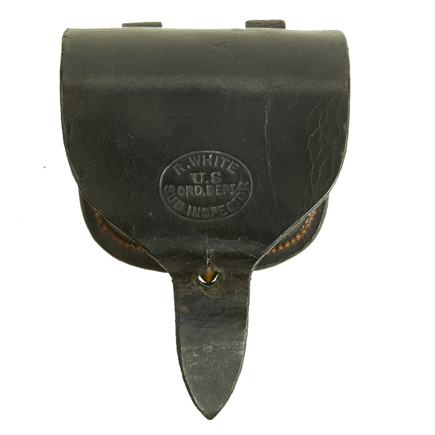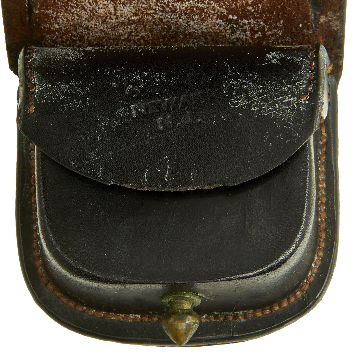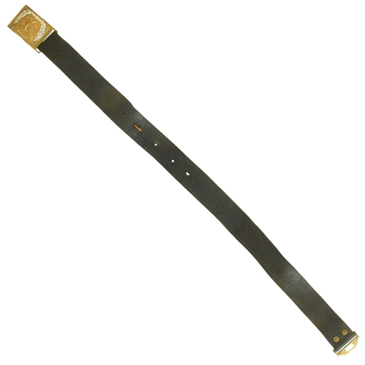 Original Item: Only One Available. This is an 1890s high quality brass eagle plate with silvered laurels and cast eagle. The buckle measures 2 14" x 3 1/4 and has been mounted to a 40 inch by 1 5/8 leather officer waist belt. The leather is sound and pliable displaying normal age and wear. Overall very good condition. Also included is a leather cap box with very nice R. WHITE U.S. ORDNANCE DEPT. Inspection stamp. Box still retains the internal wool padding and has maker stamp from Newark, New Jersey. Offered in excellent condition.
