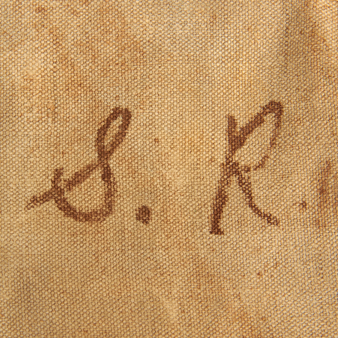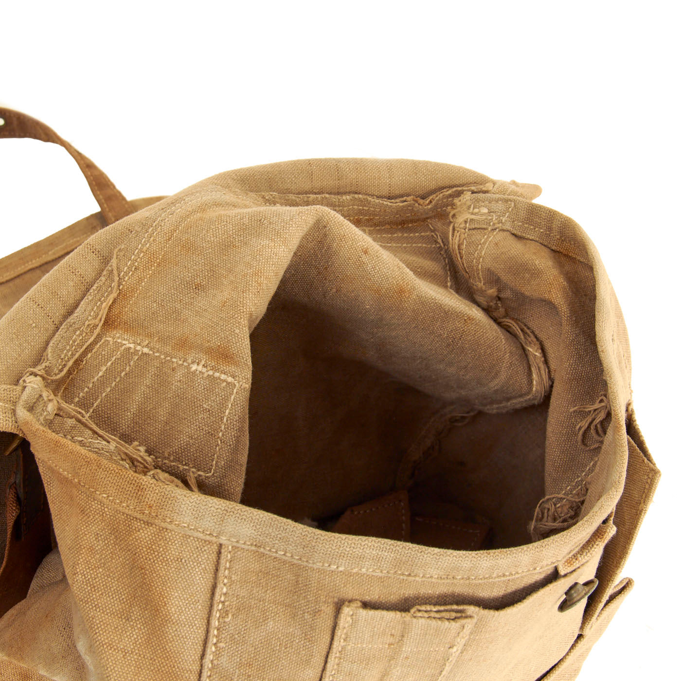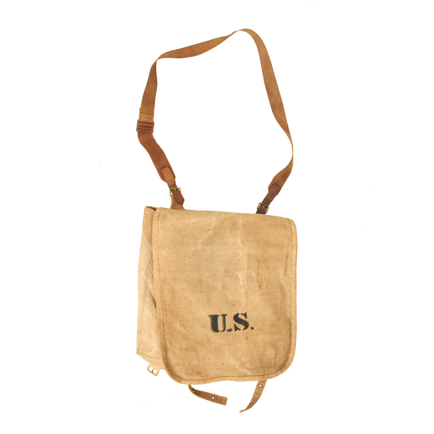 This haversack is in exceptional condition and does not appear to have seen much use. The outside flap still displays the US stamp, however, the stamp appears to have been redone at least 3 times. The leather pieces are dried and cracked but nothing too damaging is present. There are two small white linen bags that can be found on the inside which is appropriate for the model of haversack.