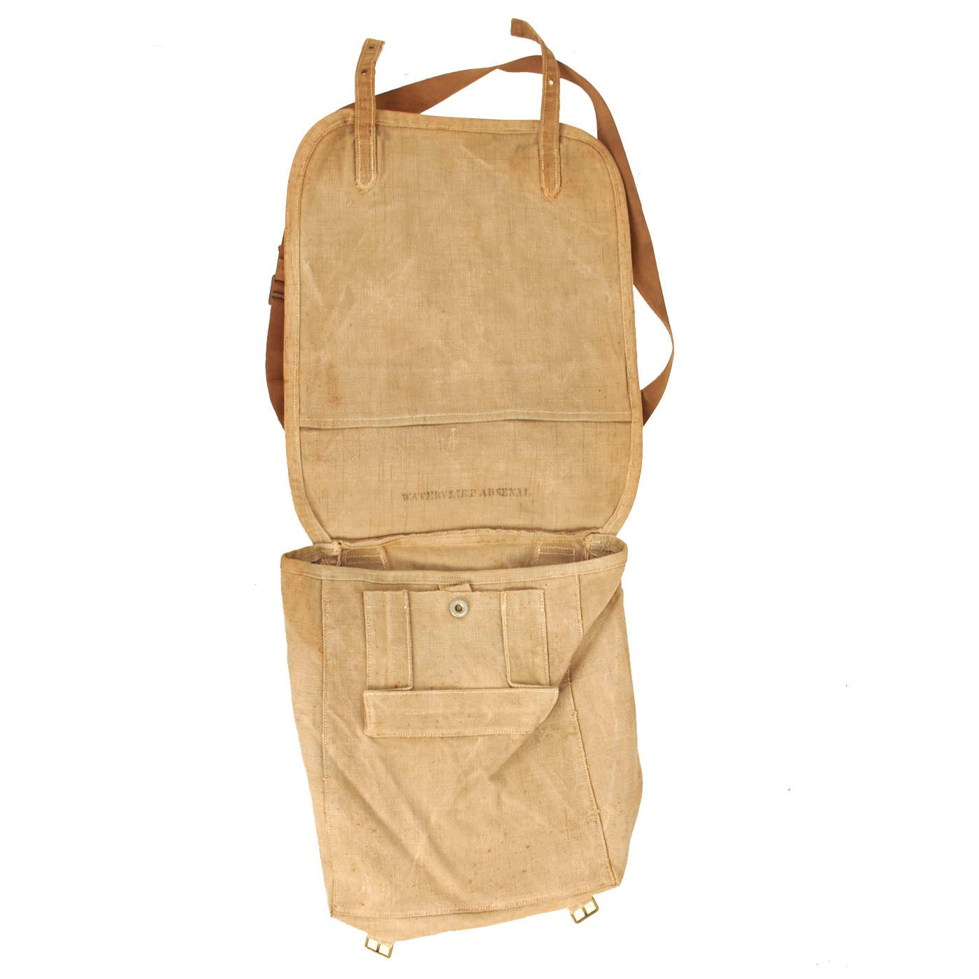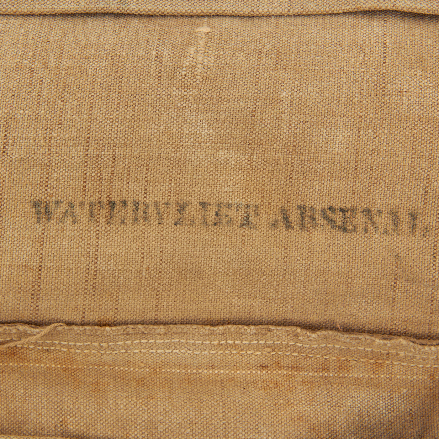 In the fall of 1877 the Army modified the haversack by replacing all of the leather items with canvas, and replacing the rubberized flap with a double canvas one with a compartment for the meat can. The principle manufacturer was Watervliet Arsenal and the stamping on this one can be found on the inside flap.
