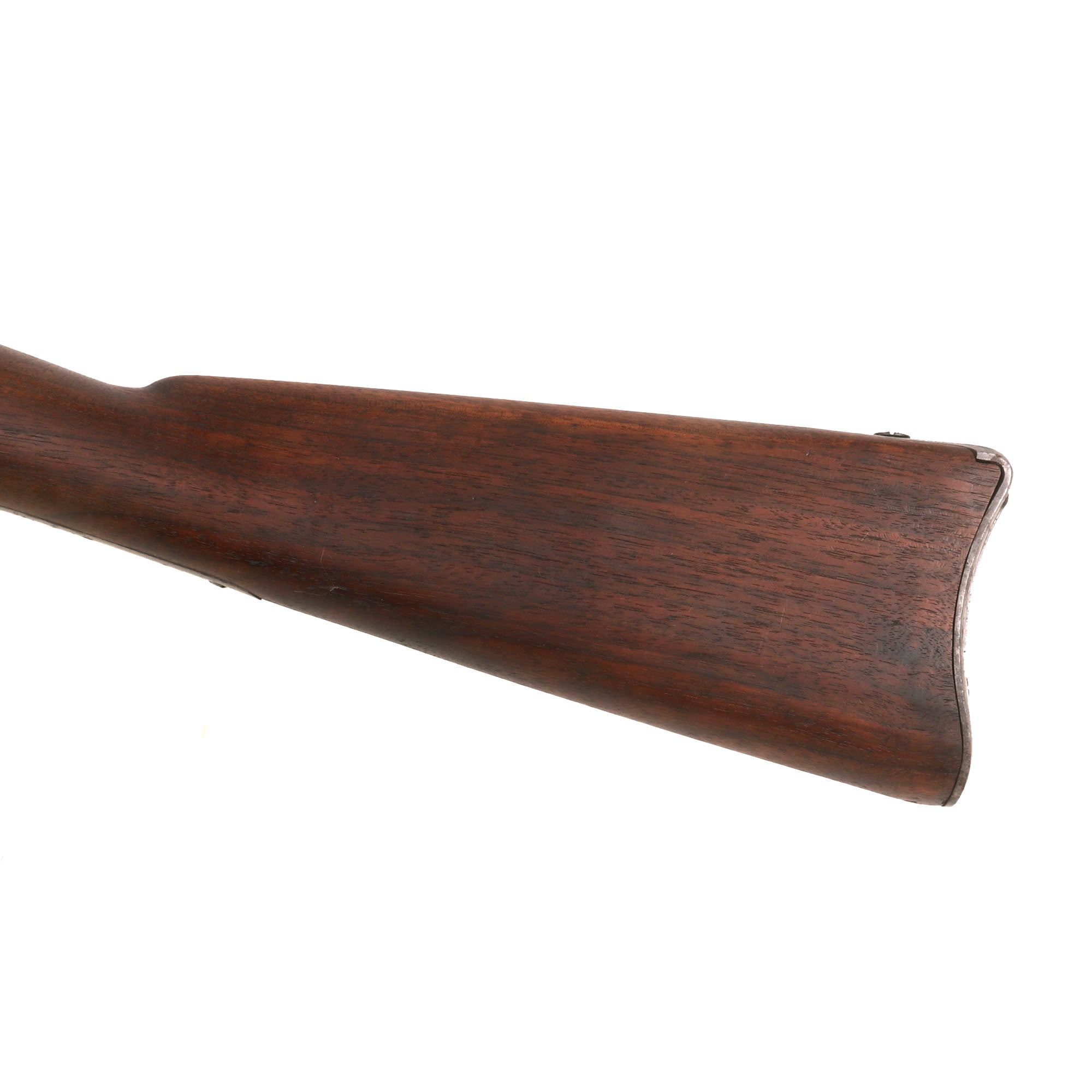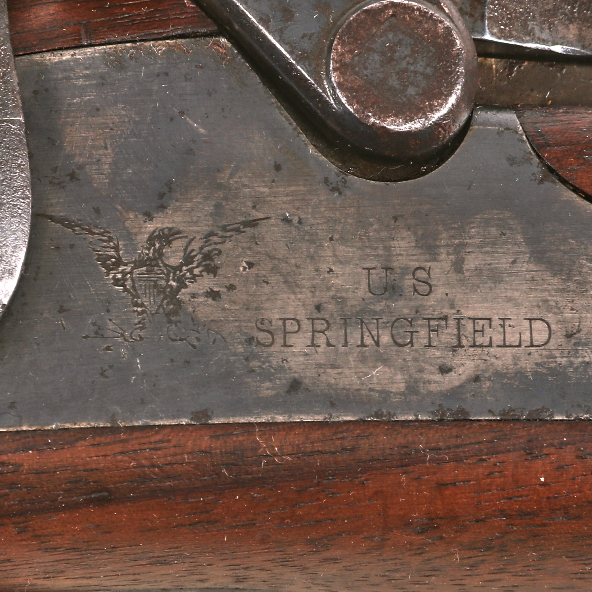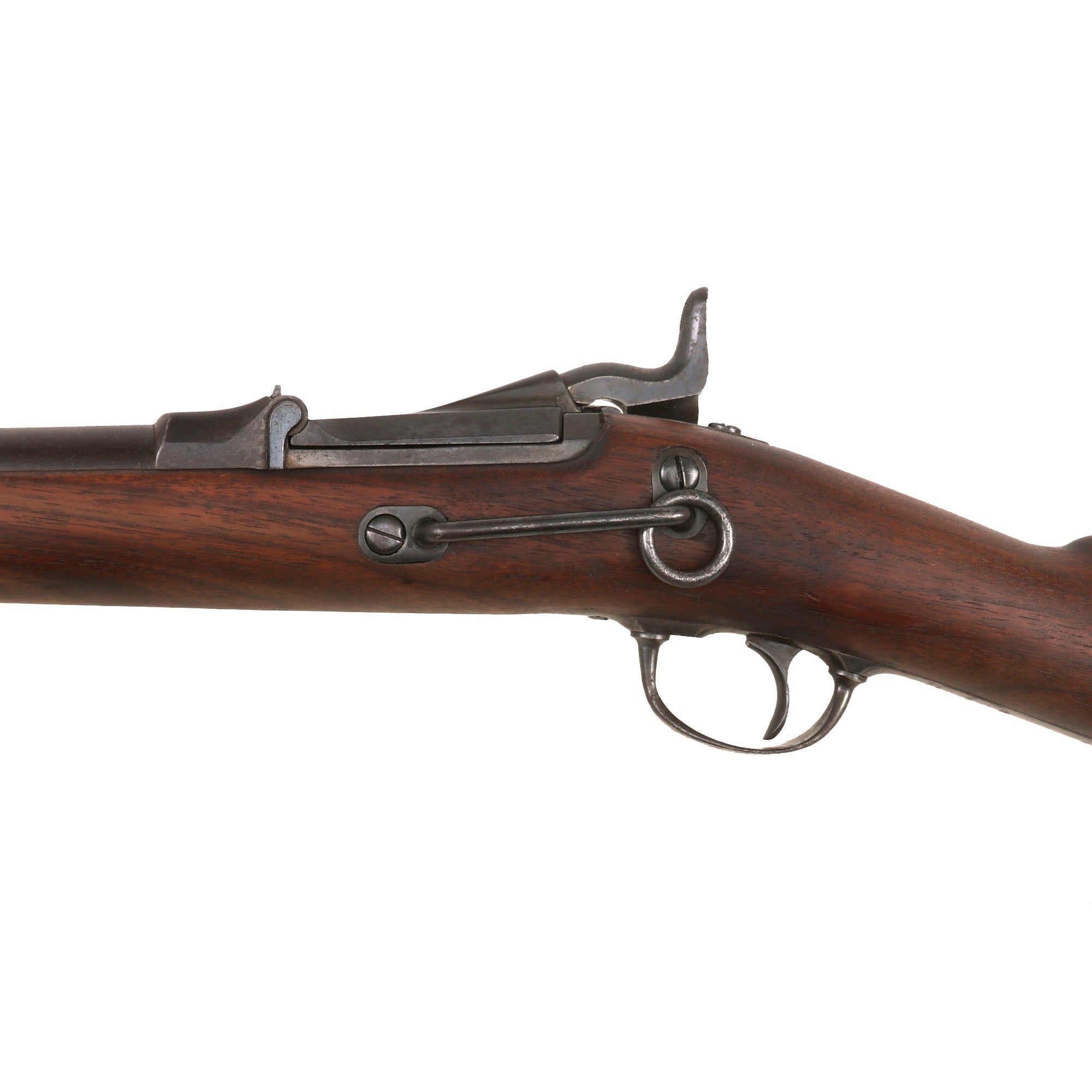 The butt plate is faintly marked U.S. and the front band is U marked. The metalwork is in very nice condition for the most part, though the butt plate does show past peppering particularly on the tang portion. The barre shows light overall past oxidation, now cleaned away, and we are not able to see any proofs near the chamber, which seems to be correct for very early Trapdoors. Center fire breechloader, .45 cal., single band, saddle-ring on sliding bar, and a working carbine M1879 rear ladder sight. Lock is marked with an eagle and U.S. / SPRINGFIELD, manufactured at the United States Armory and Arsenal at Springfield, in Springfield, Massachusetts. The upper right corner of the M1879 standard sliding sight leaf and the left side of the ramp are marked C to indicate that the sight graduations are for a rifle and not a carbine.