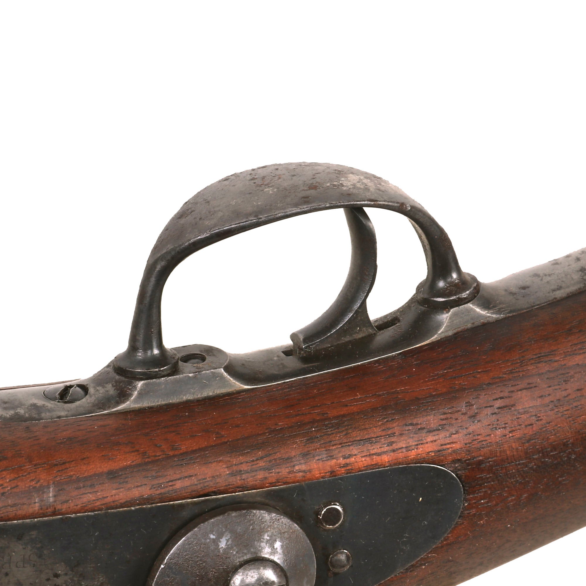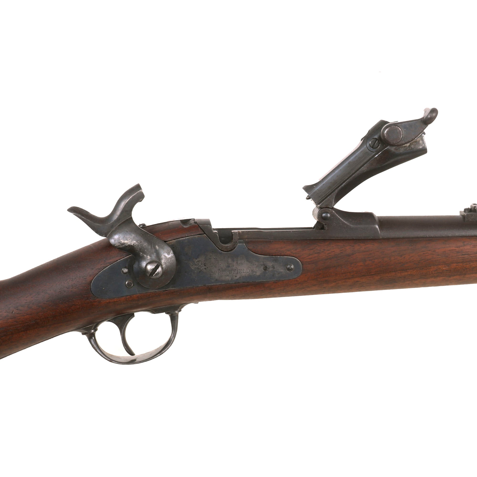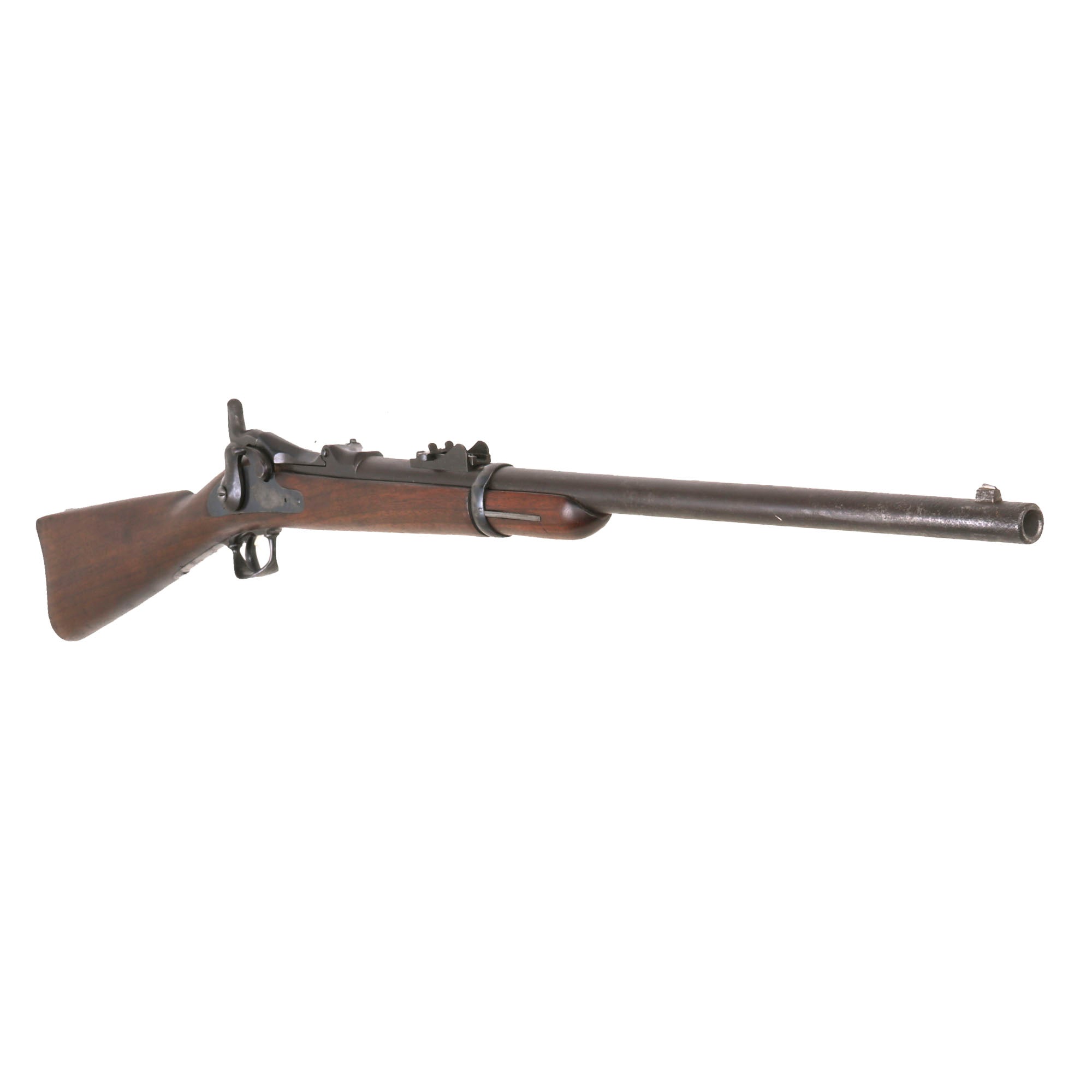 The butt plate is faintly marked U.S. and the front band is U marked. The metalwork is in very nice condition for the most part, though the butt plate does show past peppering particularly on the tang portion. The barre shows light overall past oxidation, now cleaned away, and we are not able to see any proofs near the chamber, which seems to be correct for very early Trapdoors. Center fire breechloader, .45 cal., single band, saddle-ring on sliding bar, and a working carbine M1879 rear ladder sight. Lock is marked with an eagle and U.S. / SPRINGFIELD, manufactured at the United States Armory and Arsenal at Springfield, in Springfield, Massachusetts. The upper right corner of the M1879 standard sliding sight leaf and the left side of the ramp are marked C to indicate that the sight graduations are for a rifle and not a carbine.