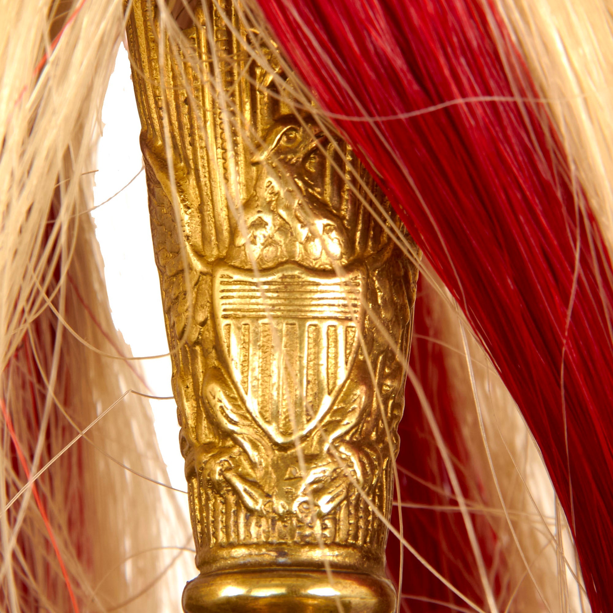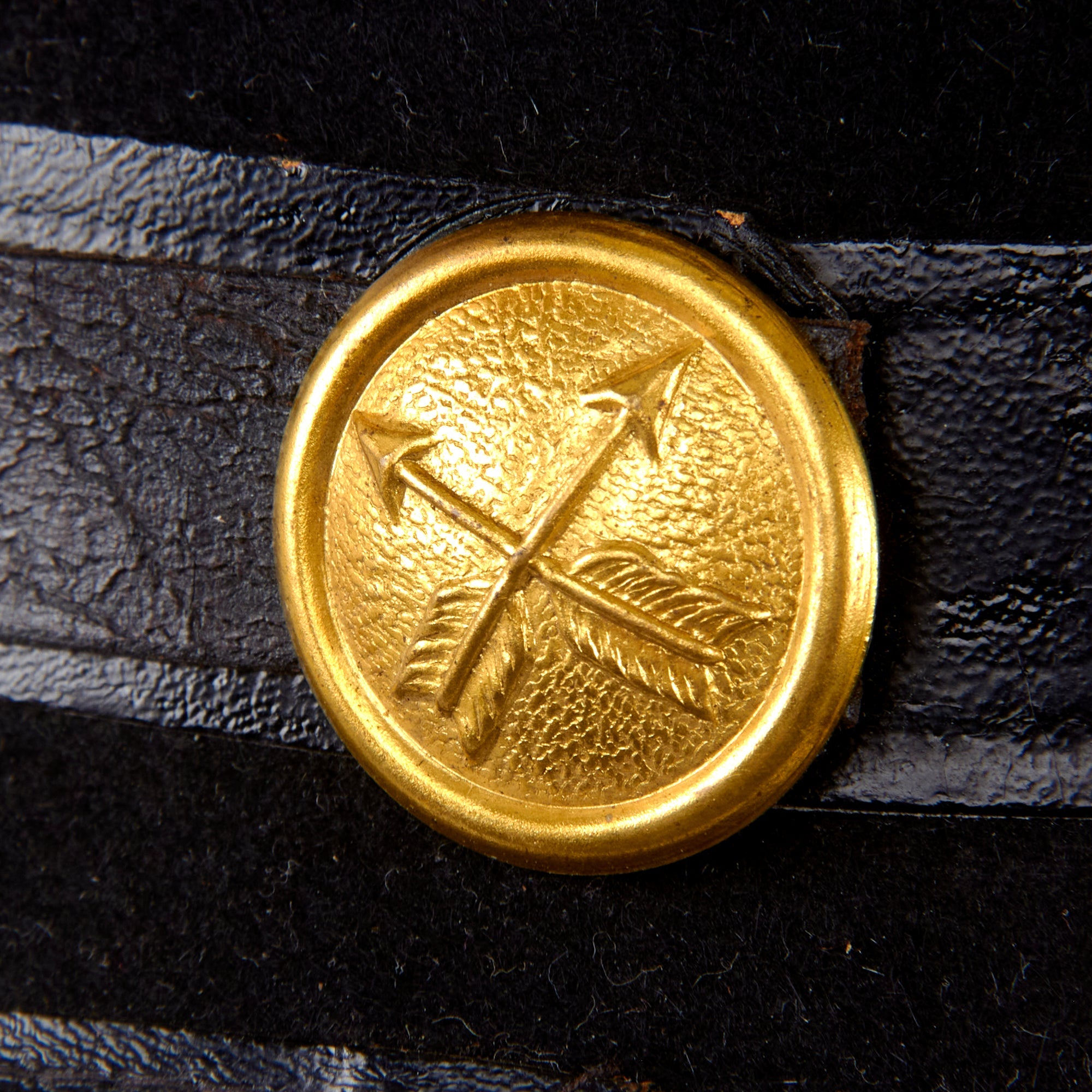 The Helmet plate displays the Great Seal of the United States, with the American Eagle with a banner in its beak stating: E PLURIBUS UNUM. The "crossed arrows" on the shield indicate that it is for an Indian Scouts unit. From the looks of the front plate, it is the original plate to the helmet and was not switched like ones we have seen in the past. The crossed arrow cavalry side buttons are still present.