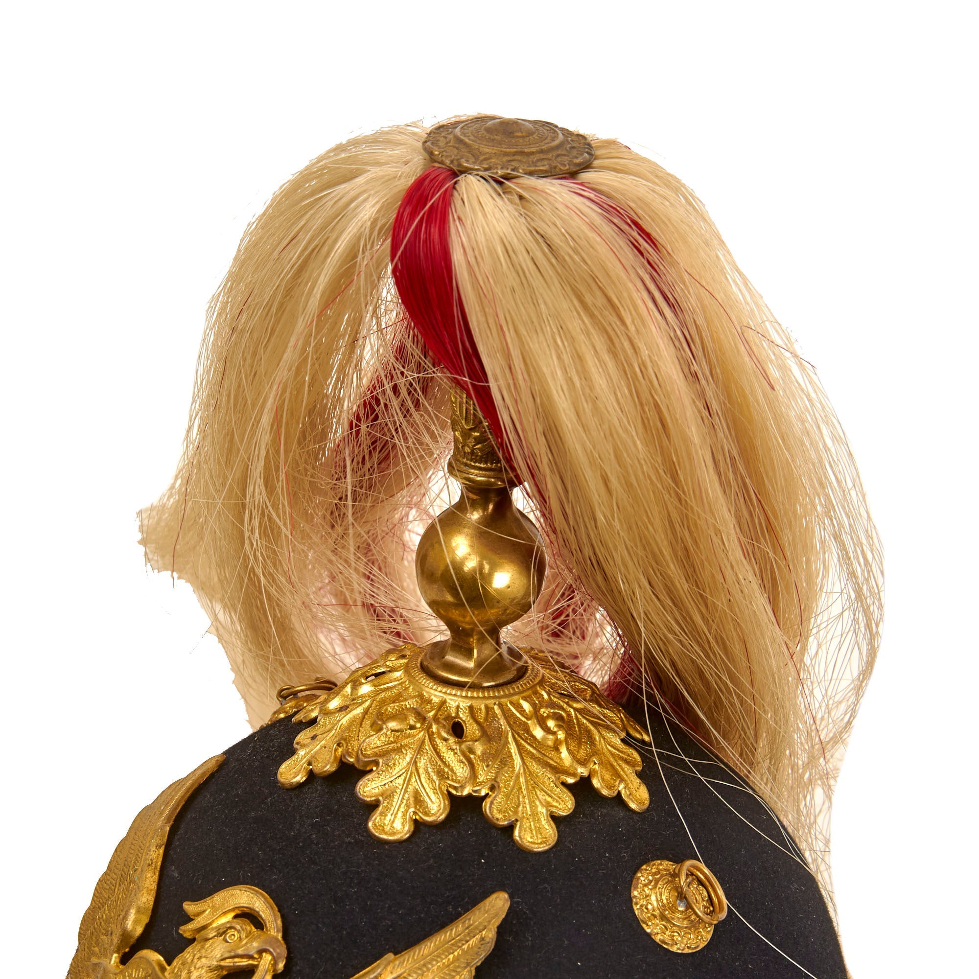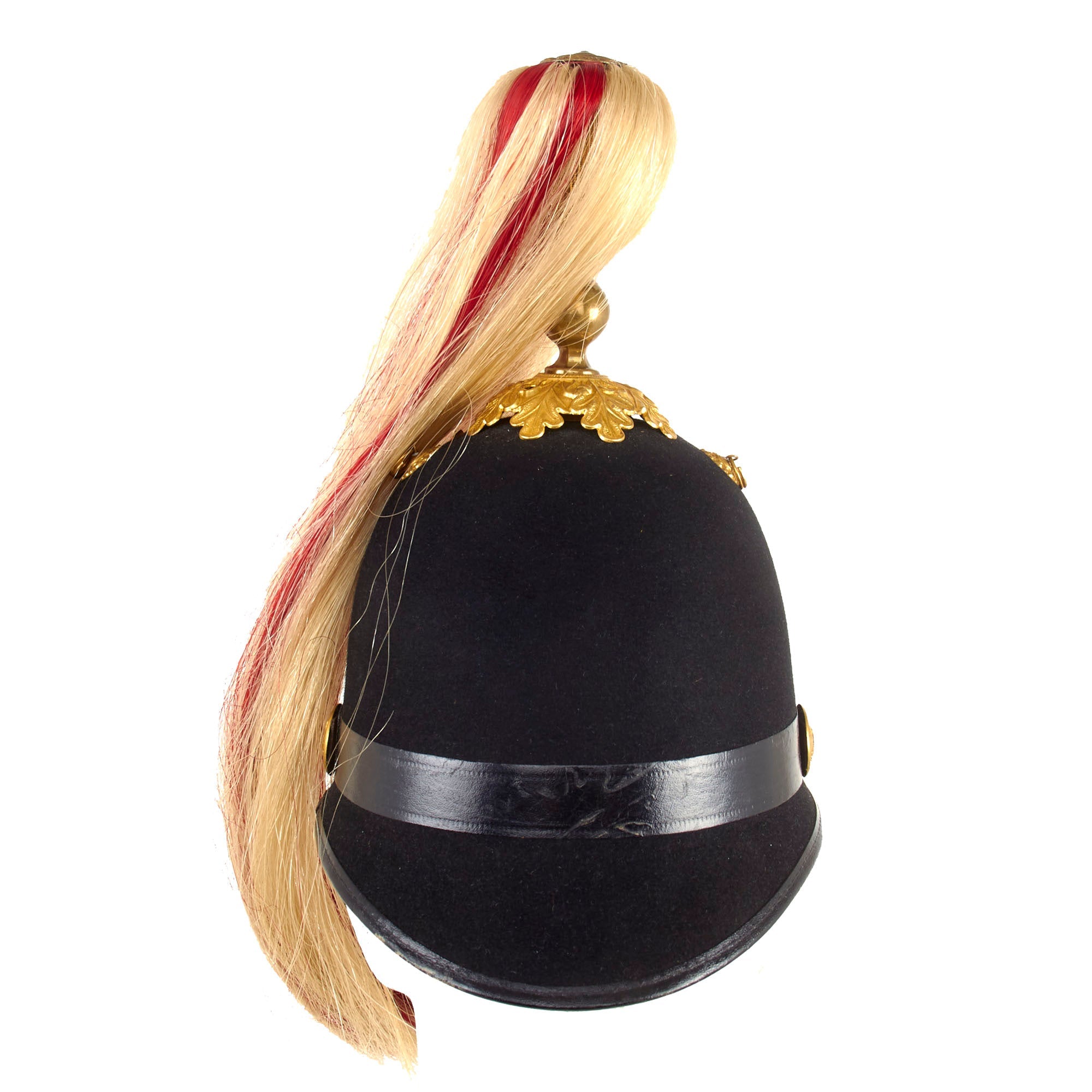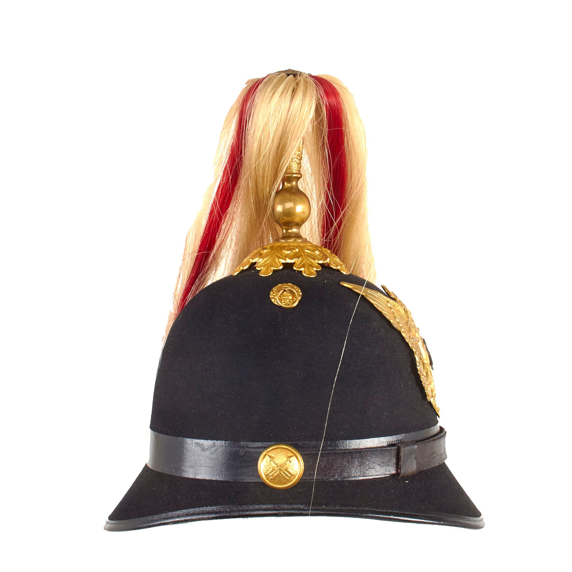 This helmet dates to the late 1880s to early 1890s, and it really is quite striking. This is not the type of helmet that was worn in the field, but instead one intended for use with the "dress" uniform for ceremonial occasions. It is beautifully made from cork covered with brown fabric but missing a legible maker’s label.