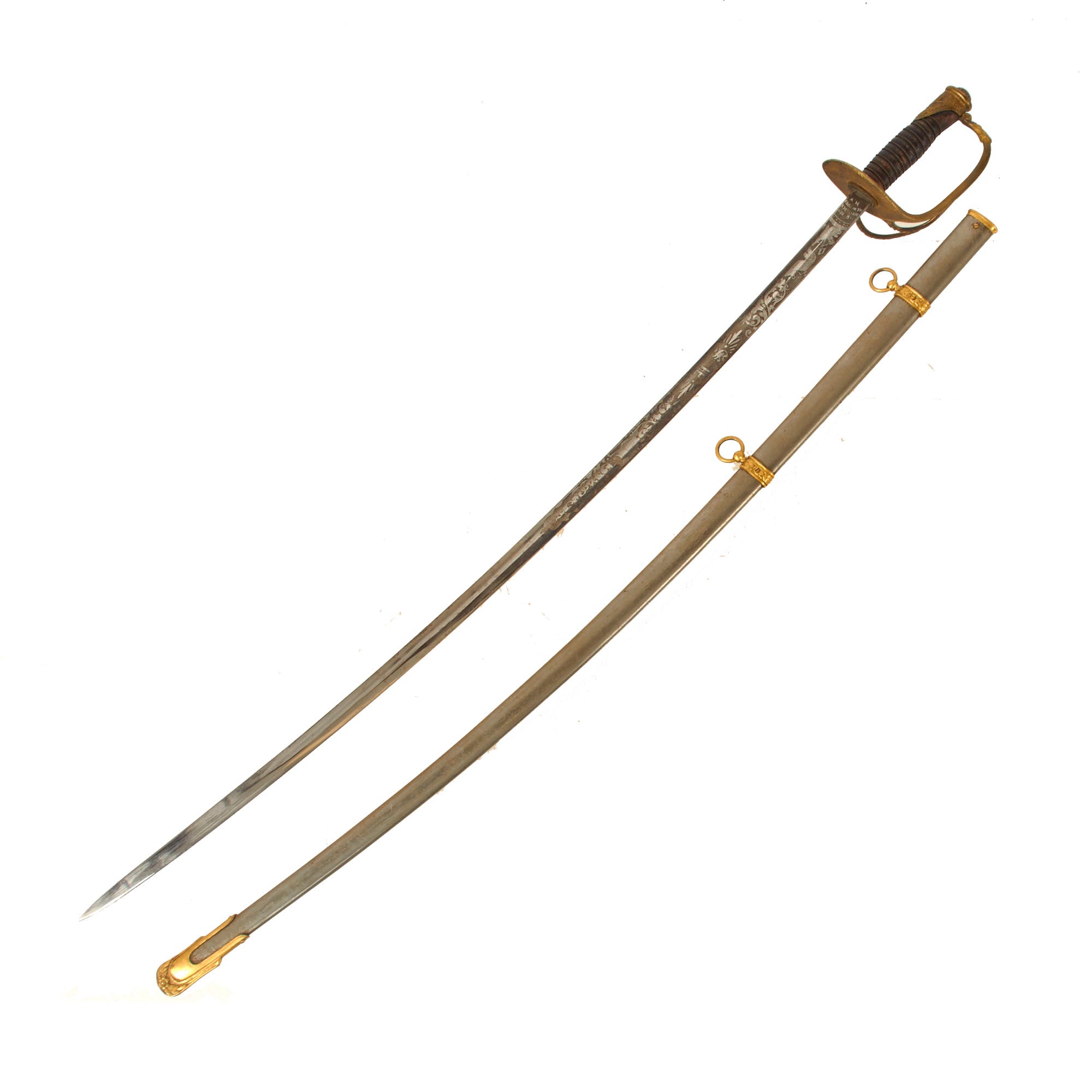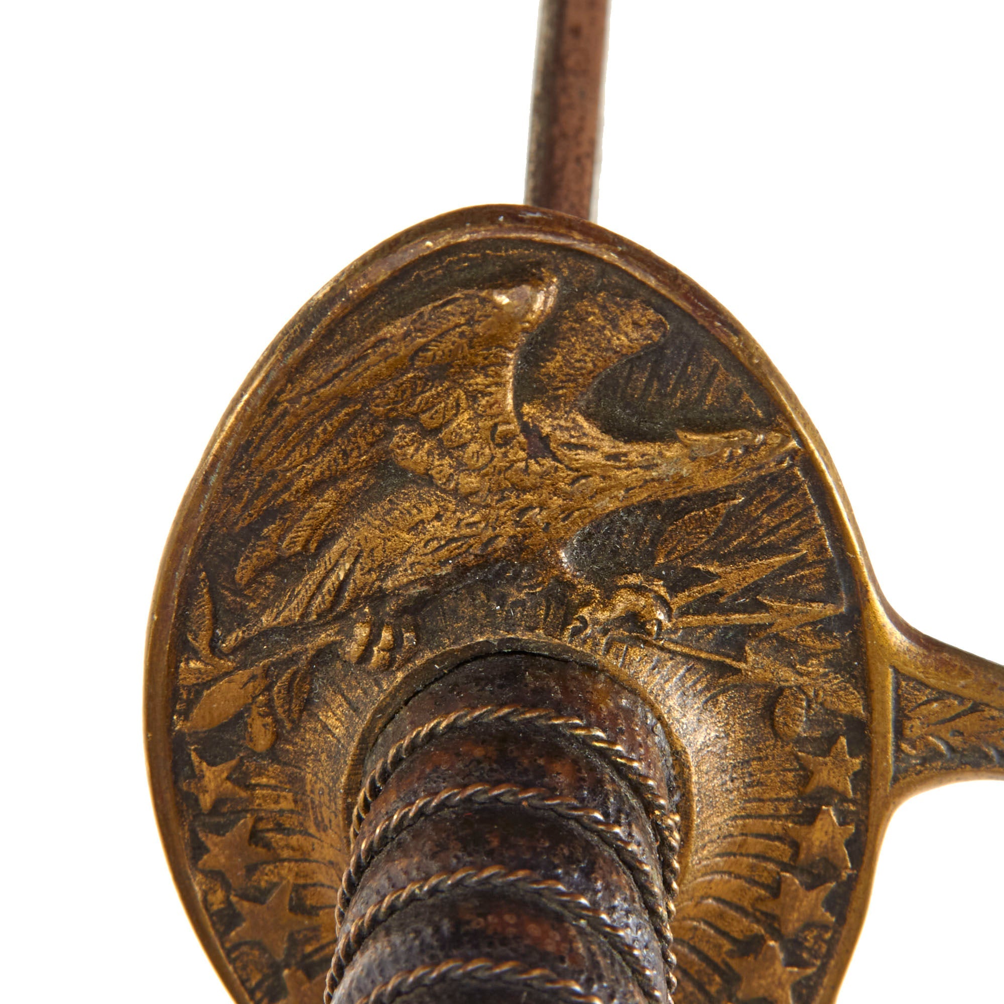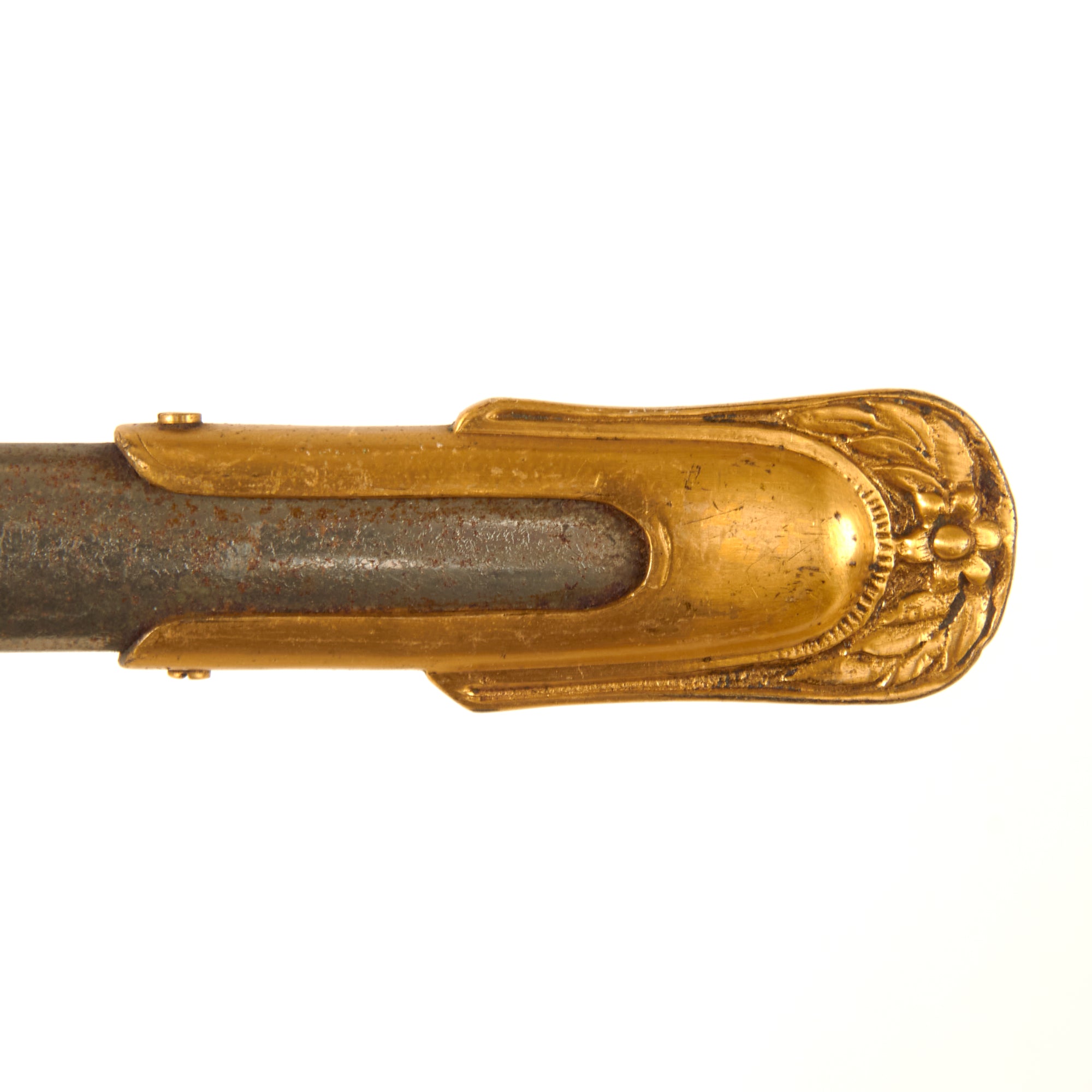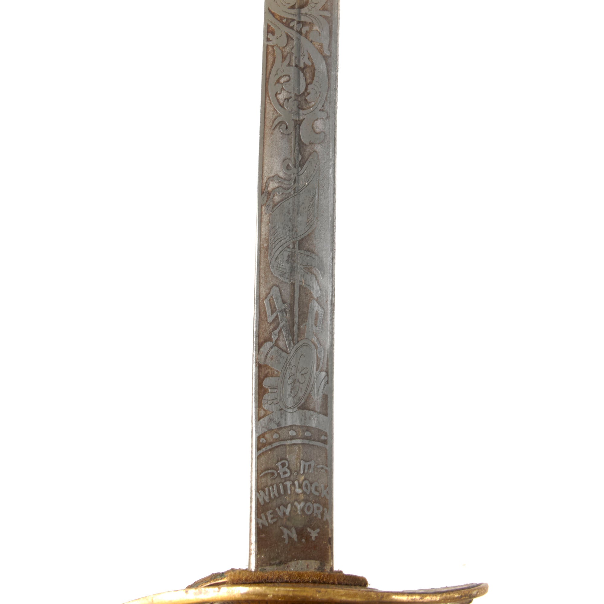 This 39 ½ Inch long example is good with some heavy wear and the expected patina of age. The curved 34 inch nickel-plated blade is in good condition, and has lovely etched designs on both sides, showing standard foliate and military motifs. One side has O.A. Glazebrook., while the other side has U. S. marked, both in lovely Gothic script. The edge has not been sharpened, correct for a dress sword, though there is a bit of denting. The plating is well retained, showing some minor flaking and oxidation to the steel base metal. The blade is marked on the ricasso with the maker / distributer:
