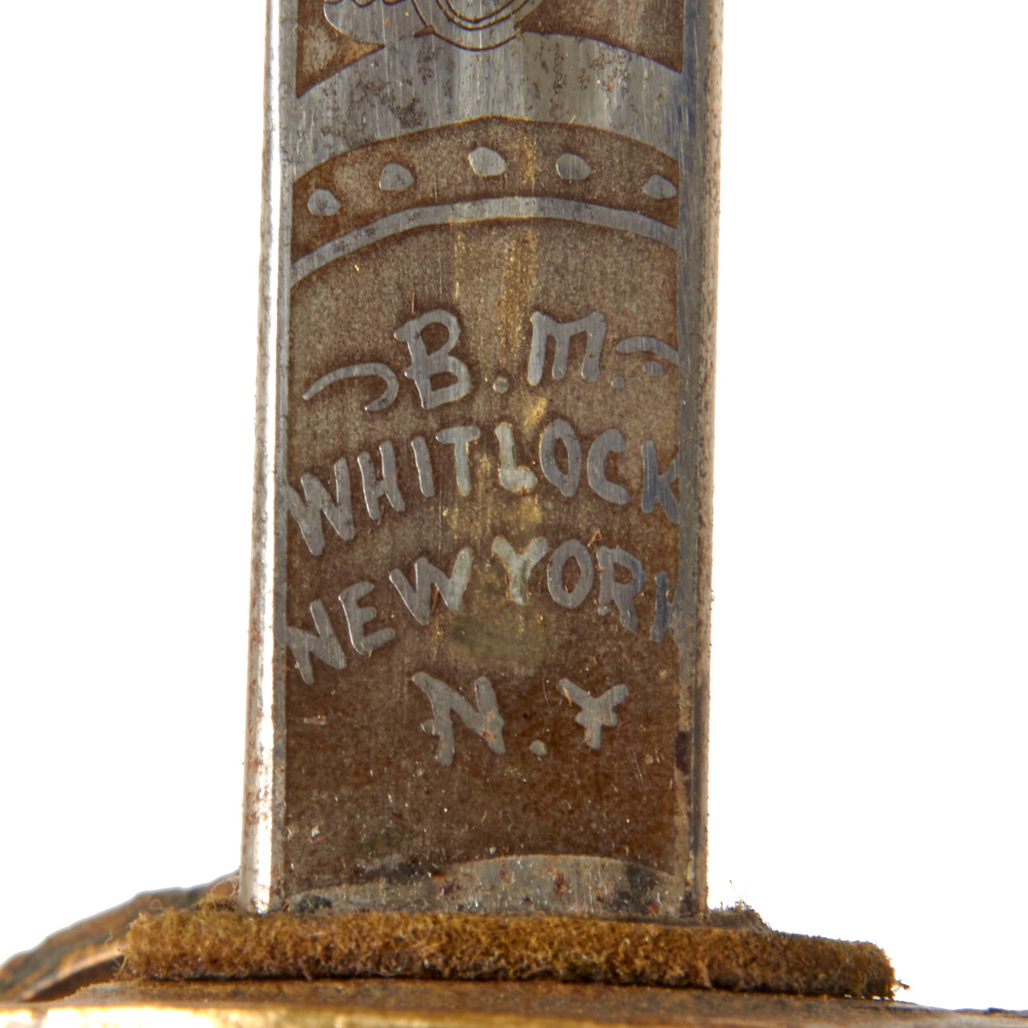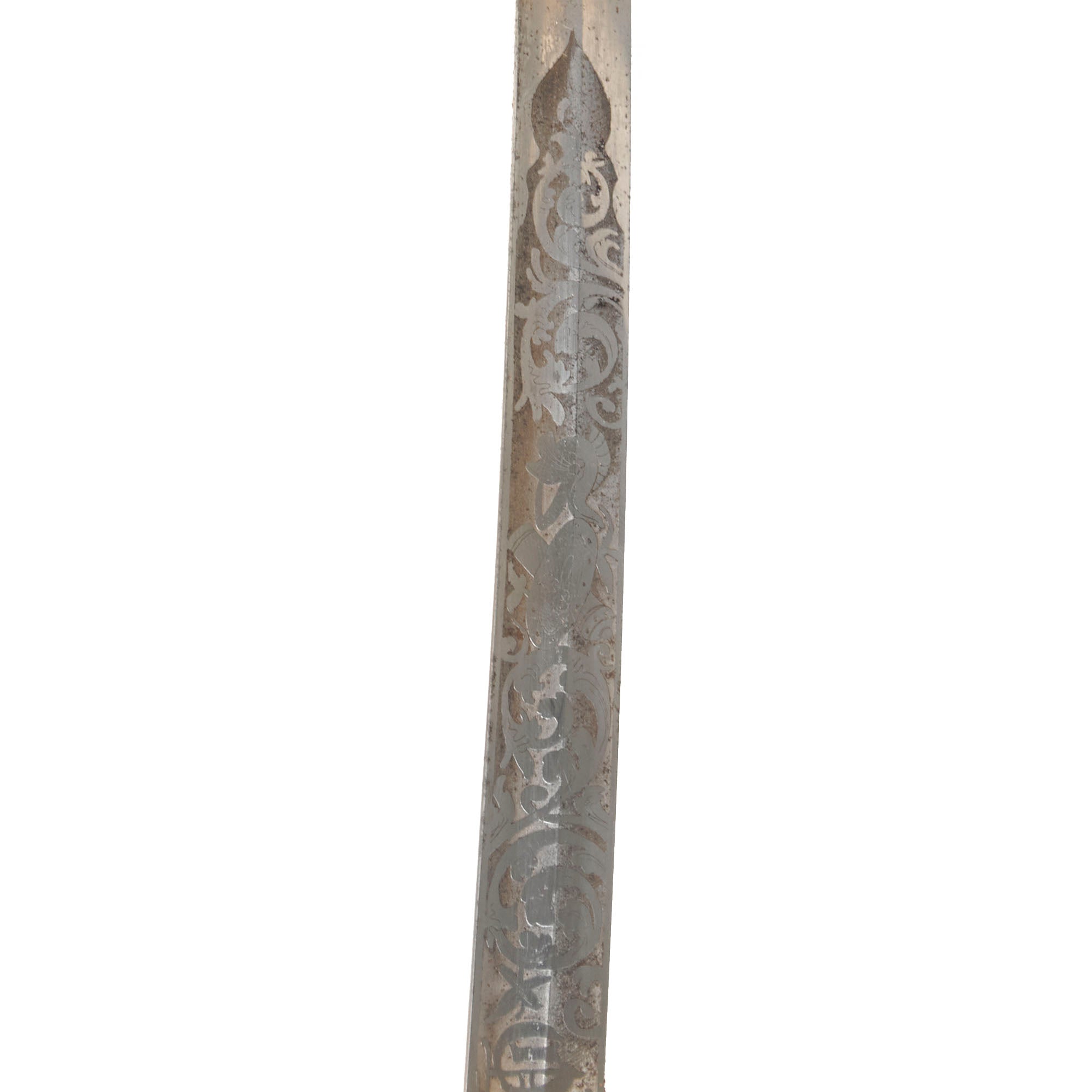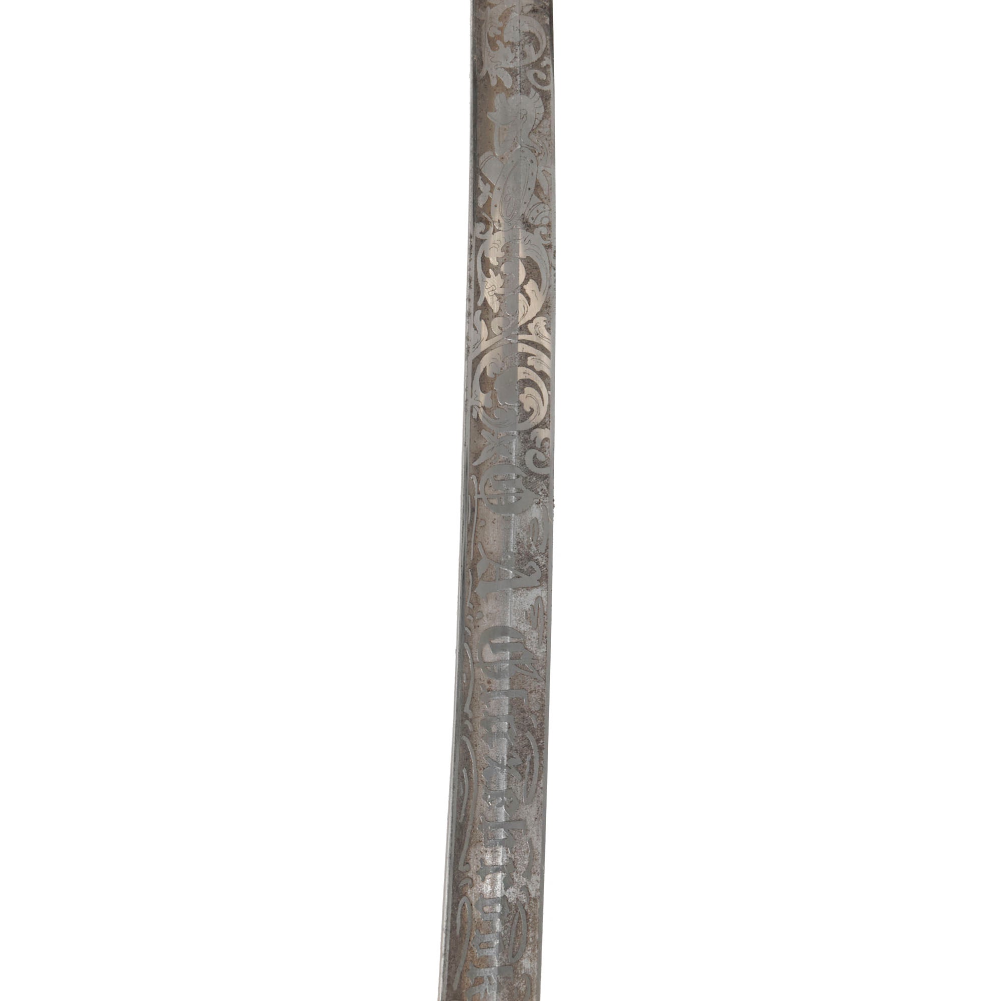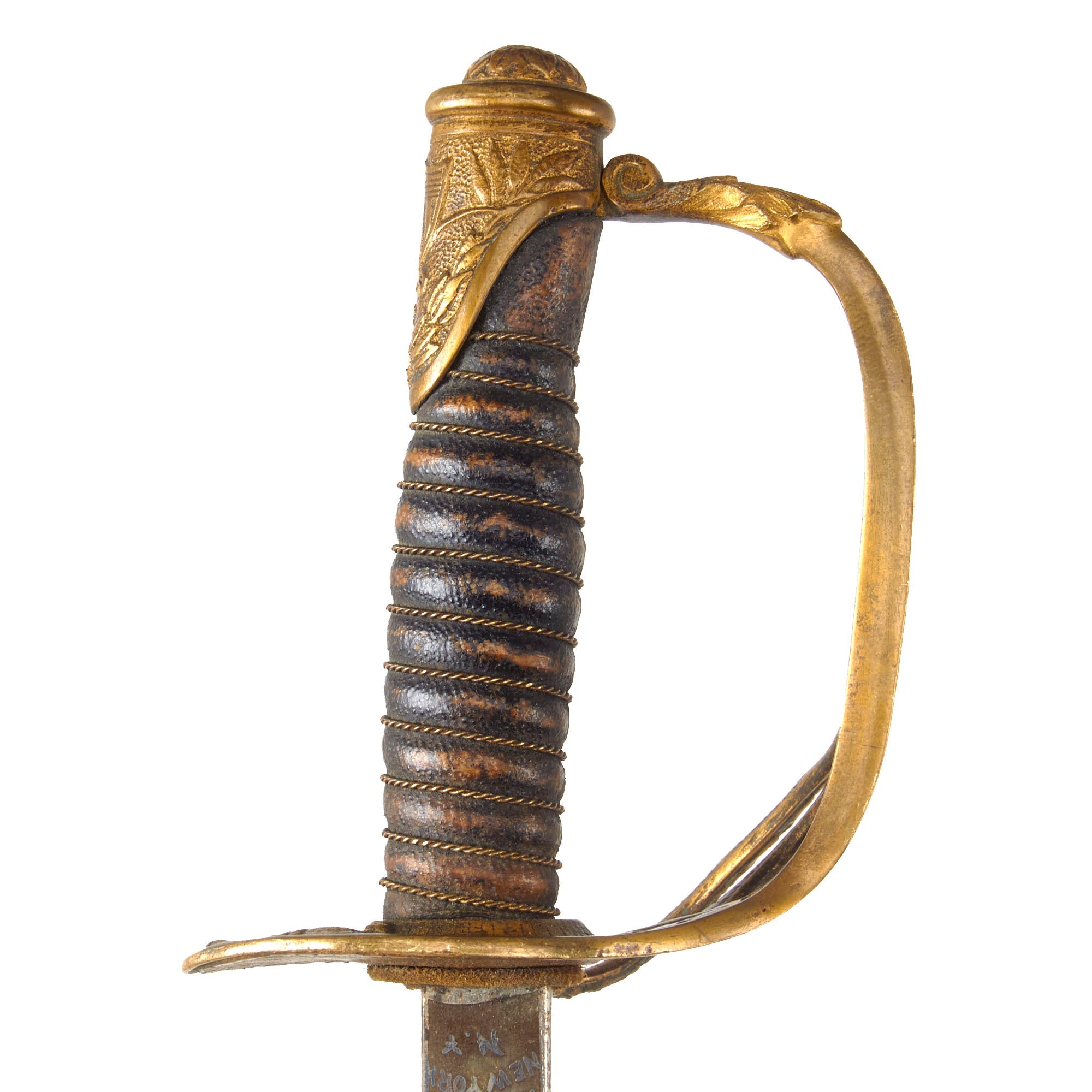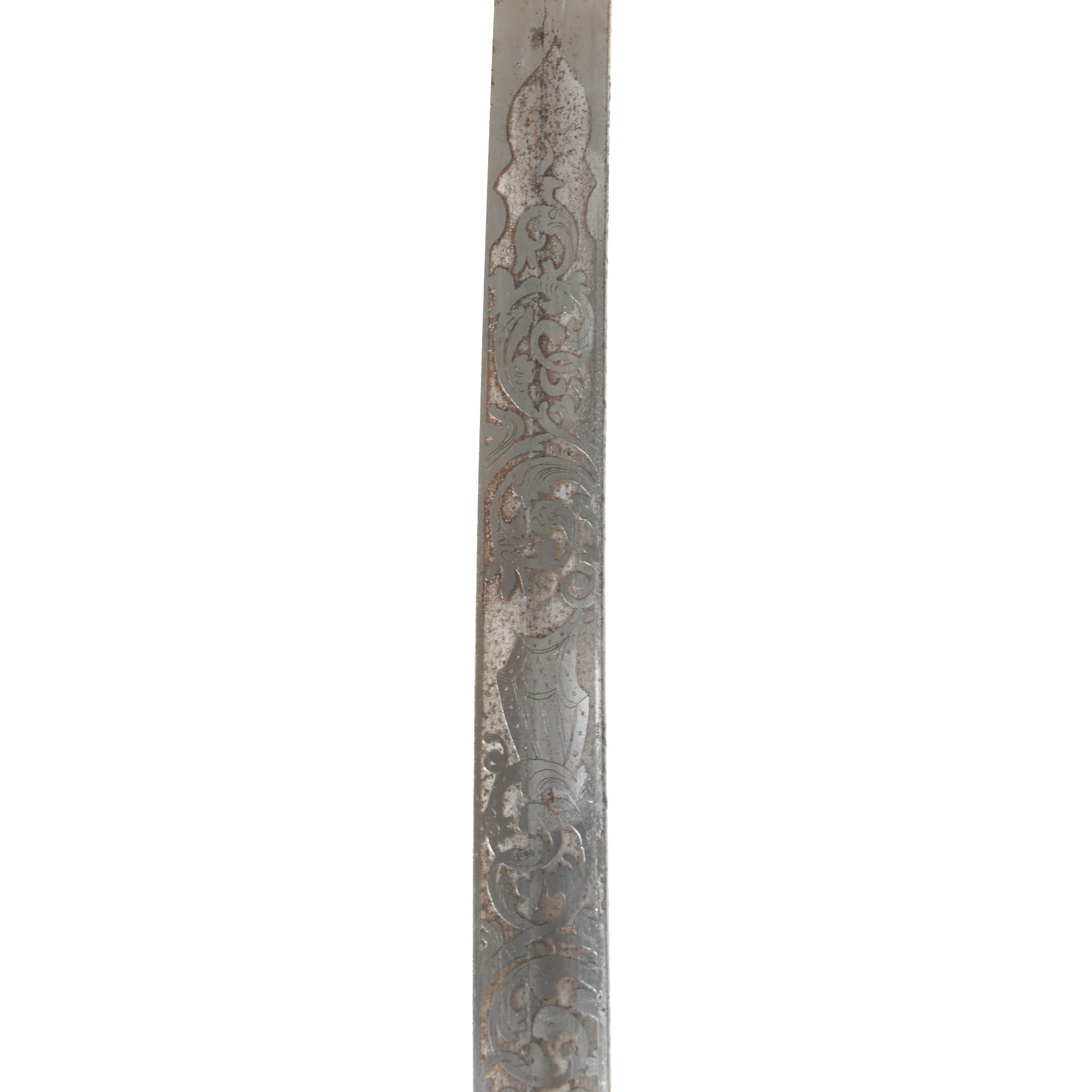 This 39 ½ Inch long example is good with some heavy wear and the expected patina of age. The curved 34 inch nickel-plated blade is in good condition, and has lovely etched designs on both sides, showing standard foliate and military motifs. One side has O.A. Glazebrook., while the other side has U. S. marked, both in lovely Gothic script. The edge has not been sharpened, correct for a dress sword, though there is a bit of denting. The plating is well retained, showing some minor flaking and oxidation to the steel base metal. The blade is marked on the ricasso with the maker / distributer:
