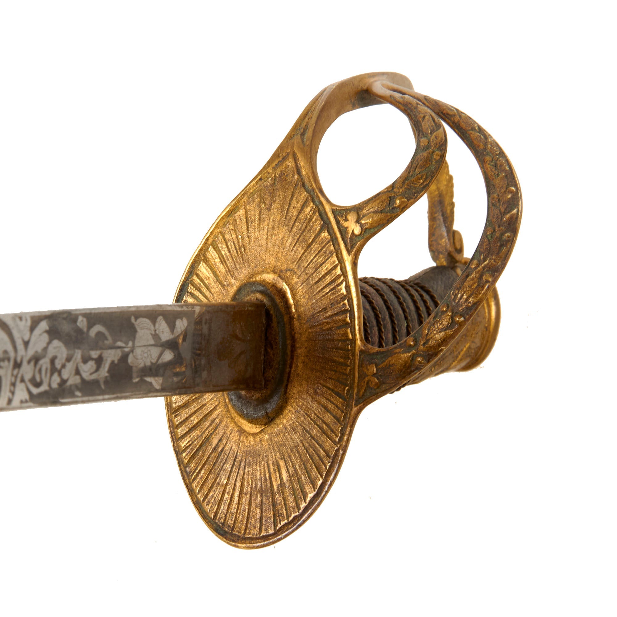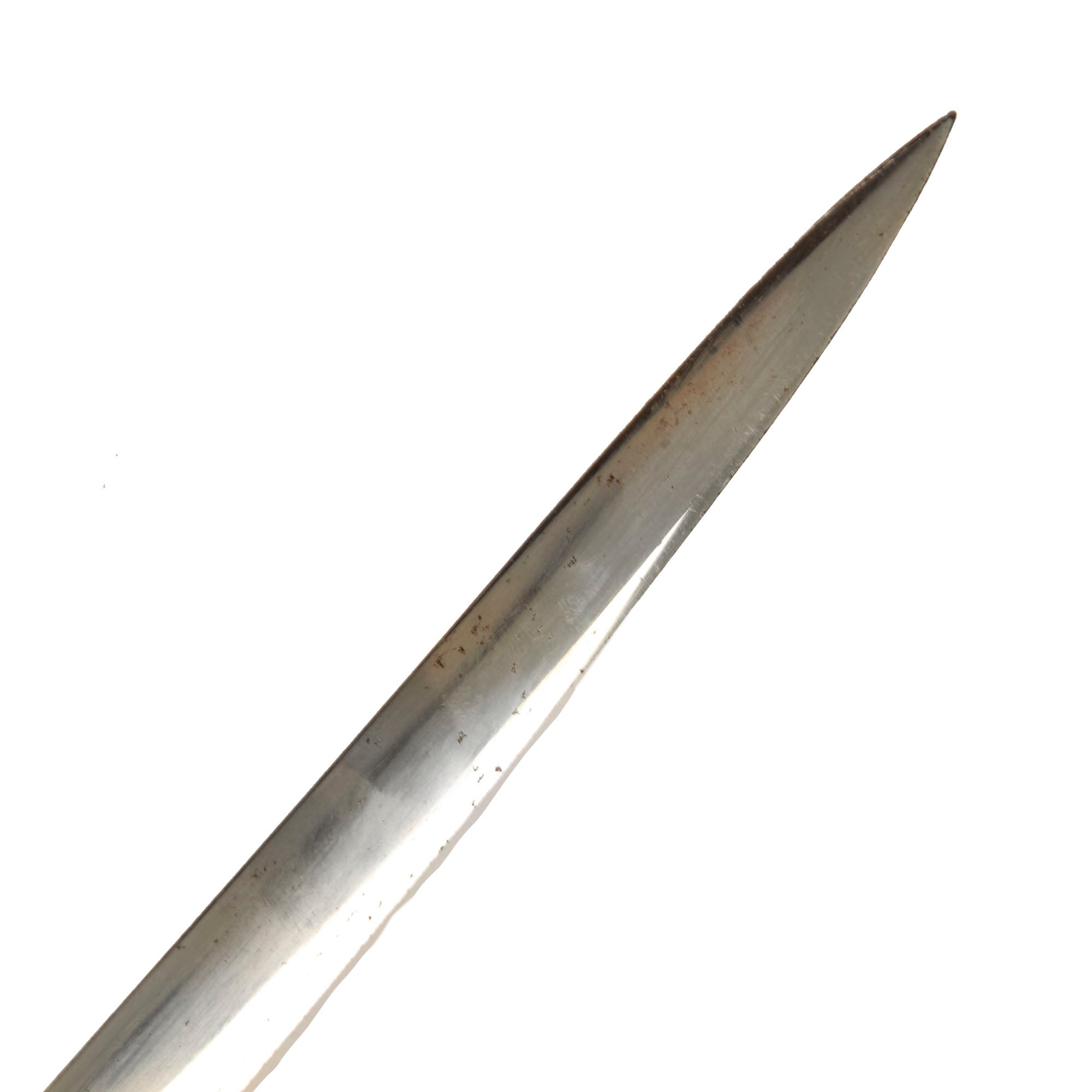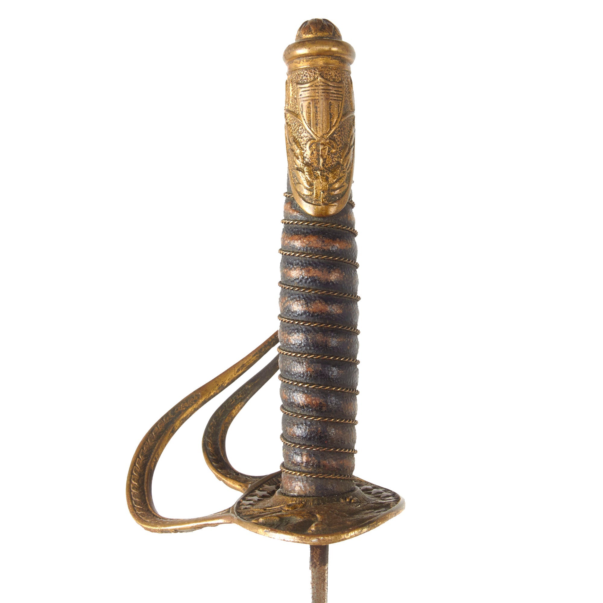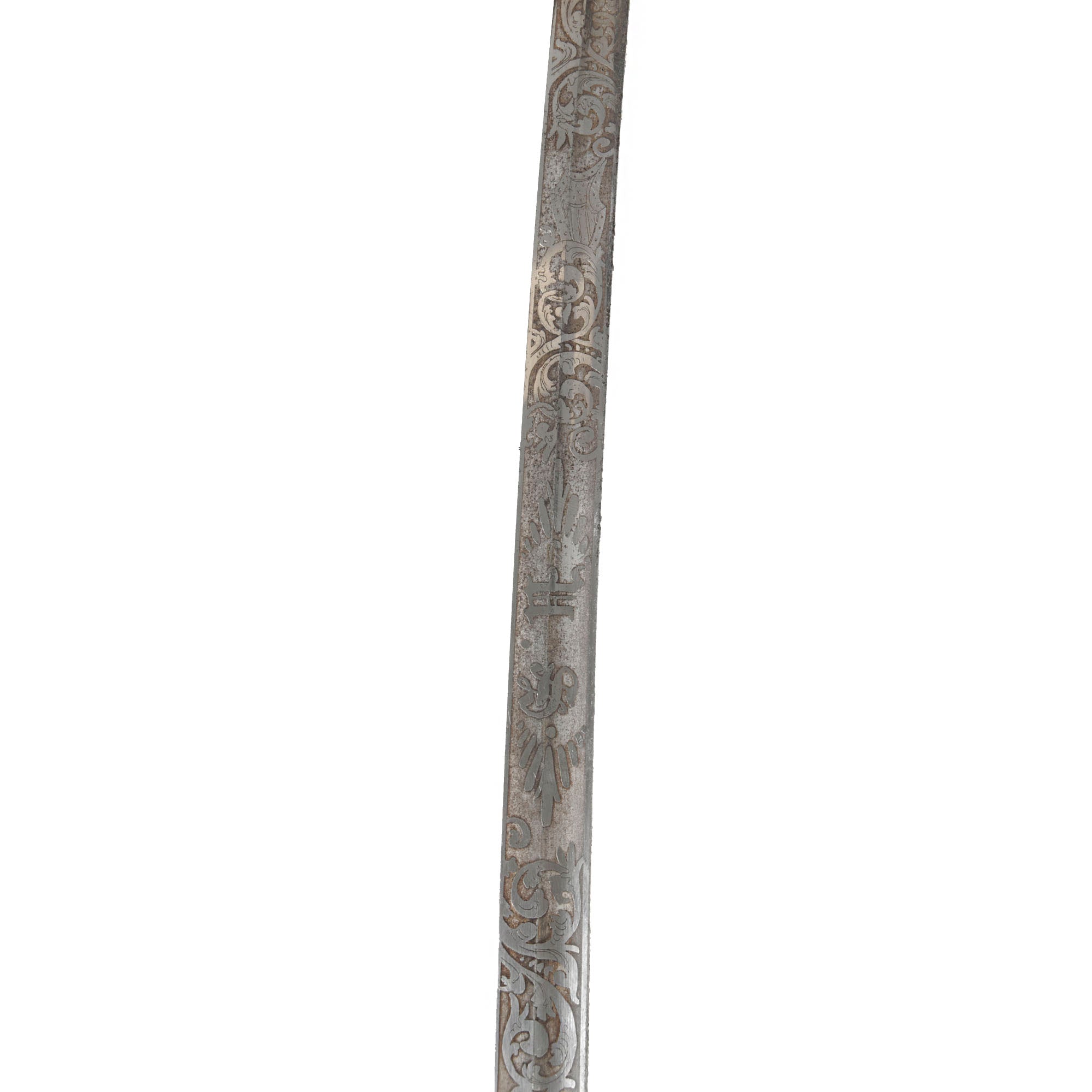 This 39 ½ Inch long example is good with some heavy wear and the expected patina of age. The curved 34 inch nickel-plated blade is in good condition, and has lovely etched designs on both sides, showing standard foliate and military motifs. One side has O.A. Glazebrook., while the other side has U. S. marked, both in lovely Gothic script. The edge has not been sharpened, correct for a dress sword, though there is a bit of denting. The plating is well retained, showing some minor flaking and oxidation to the steel base metal. The blade is marked on the ricasso with the maker / distributer: