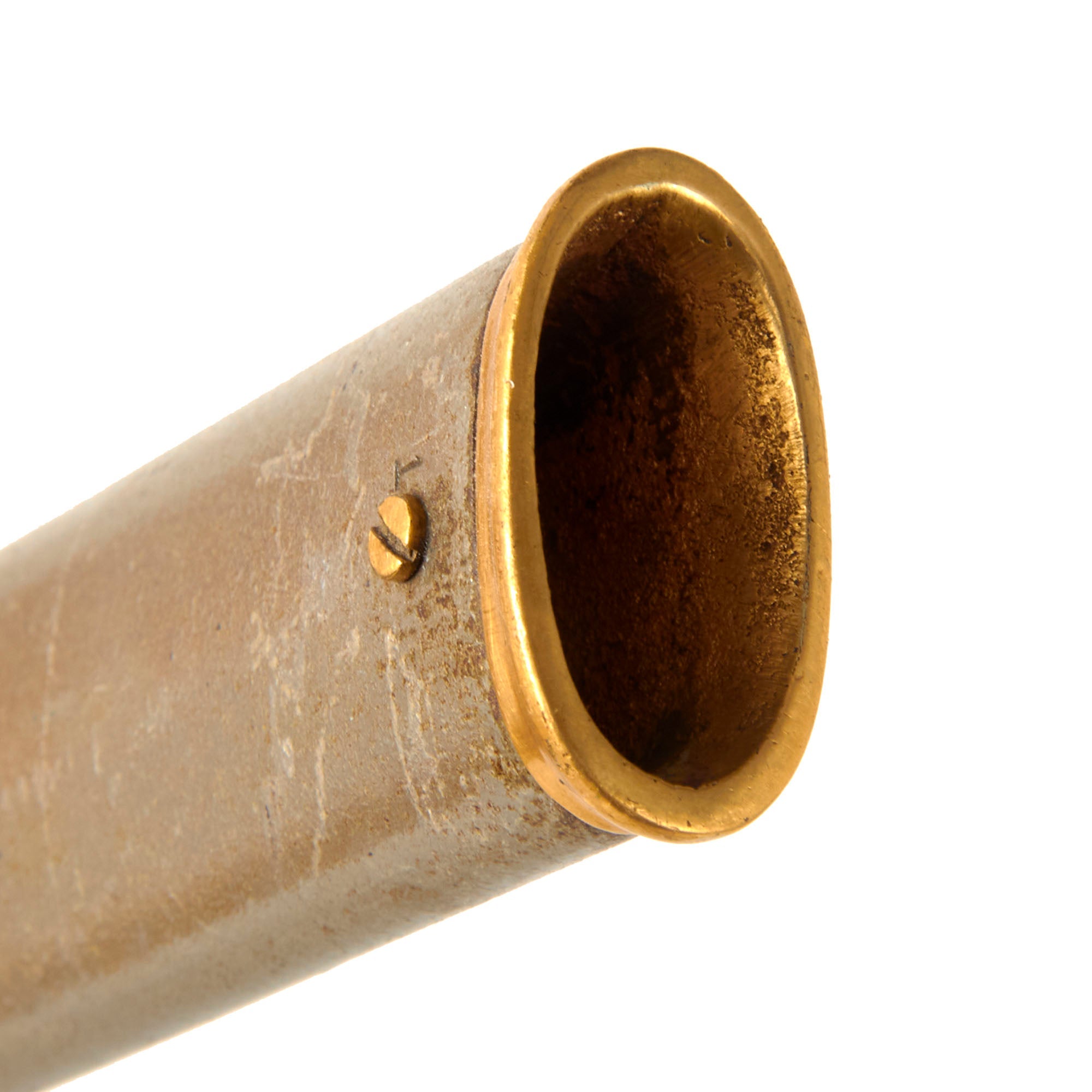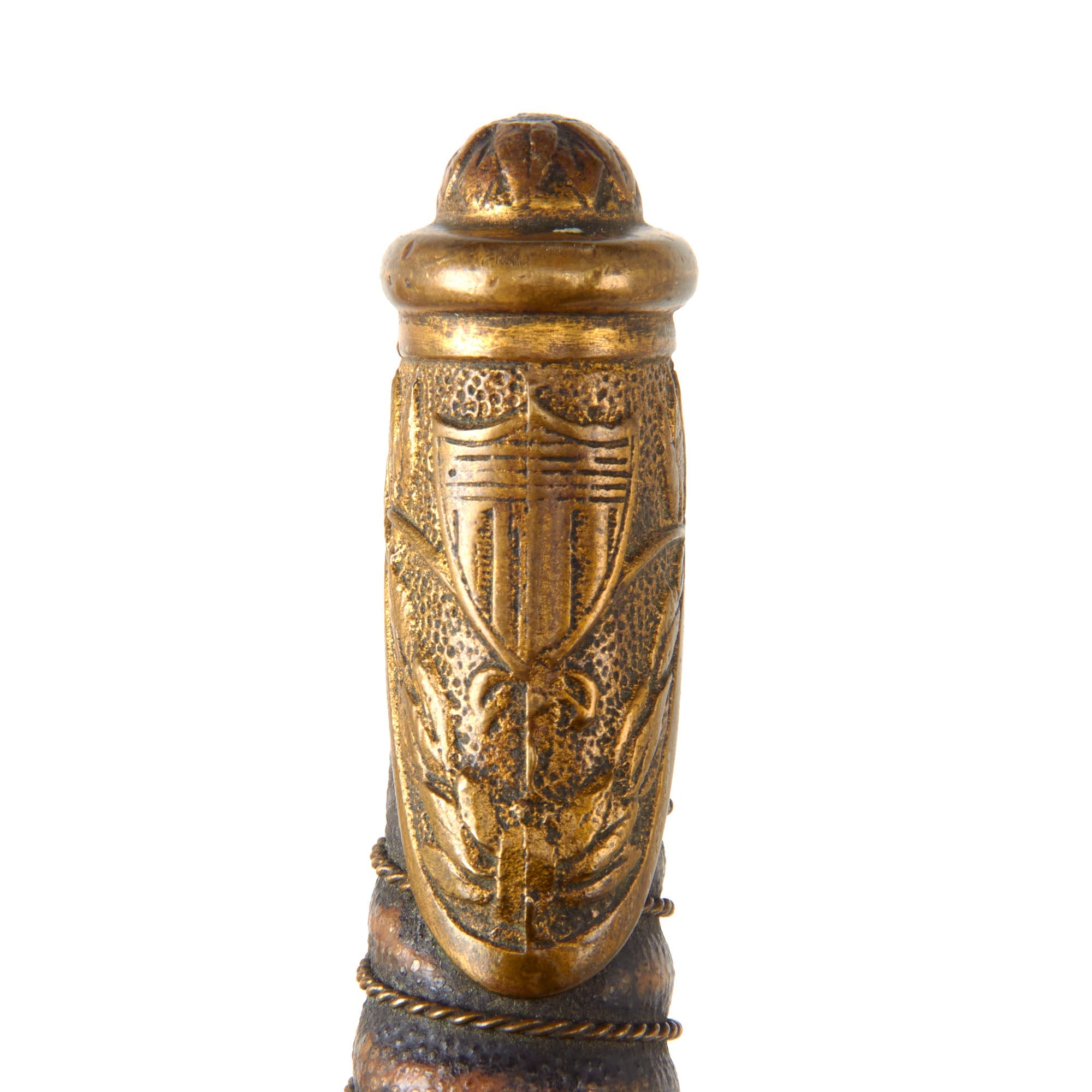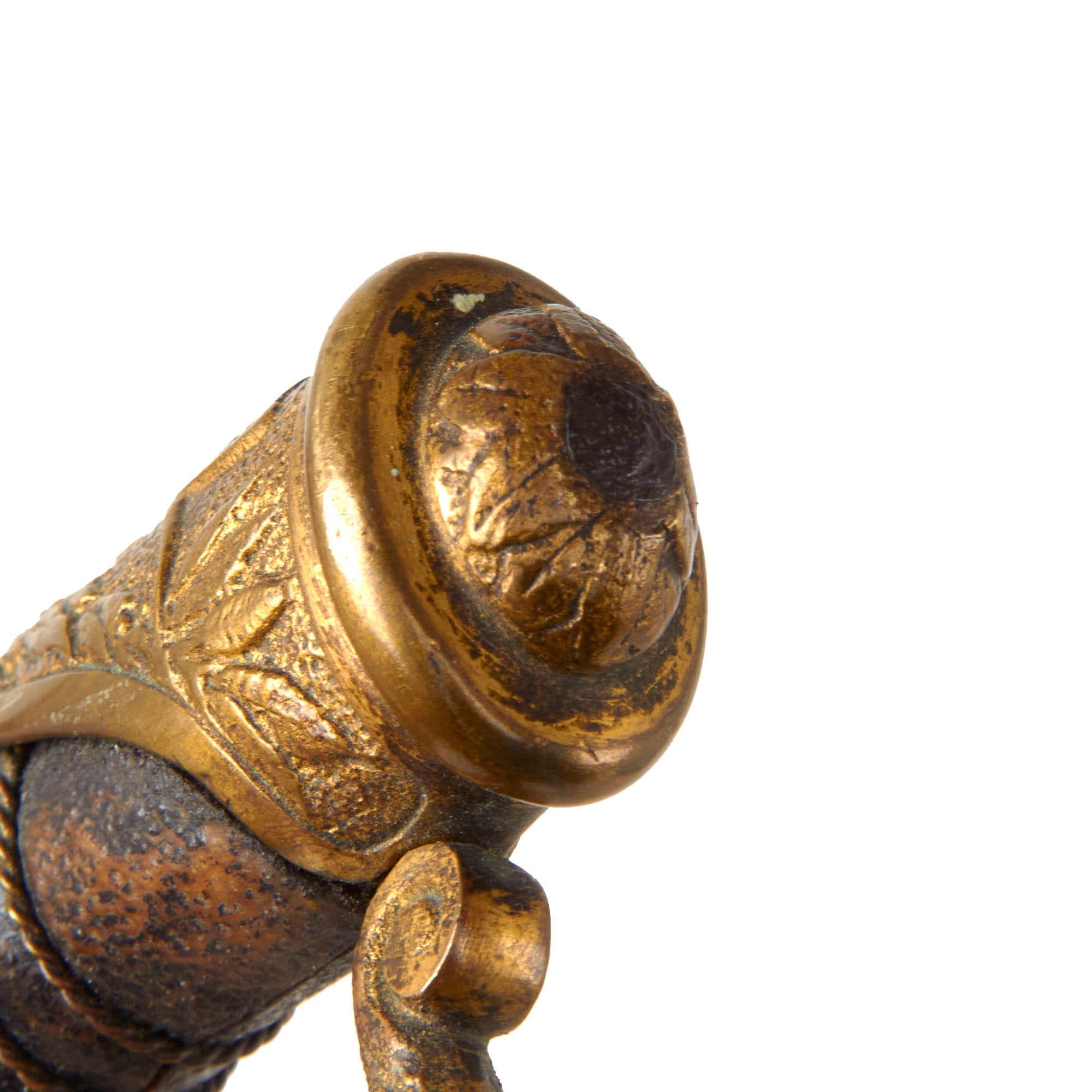 The grip is solid on the full length tang, and the guard is still mostly tight with a tiny bit of play, even with the leather blade buffer still intact. The grip still has most of the leather wrapping intact, with the original twisted brass wires resting in the grooves of the grip, with some heavy wear overall. The brass hilt is still in nice shape, though it does show some denting and deformation. It is a typical cast example, with a very decorative pommel and guard.