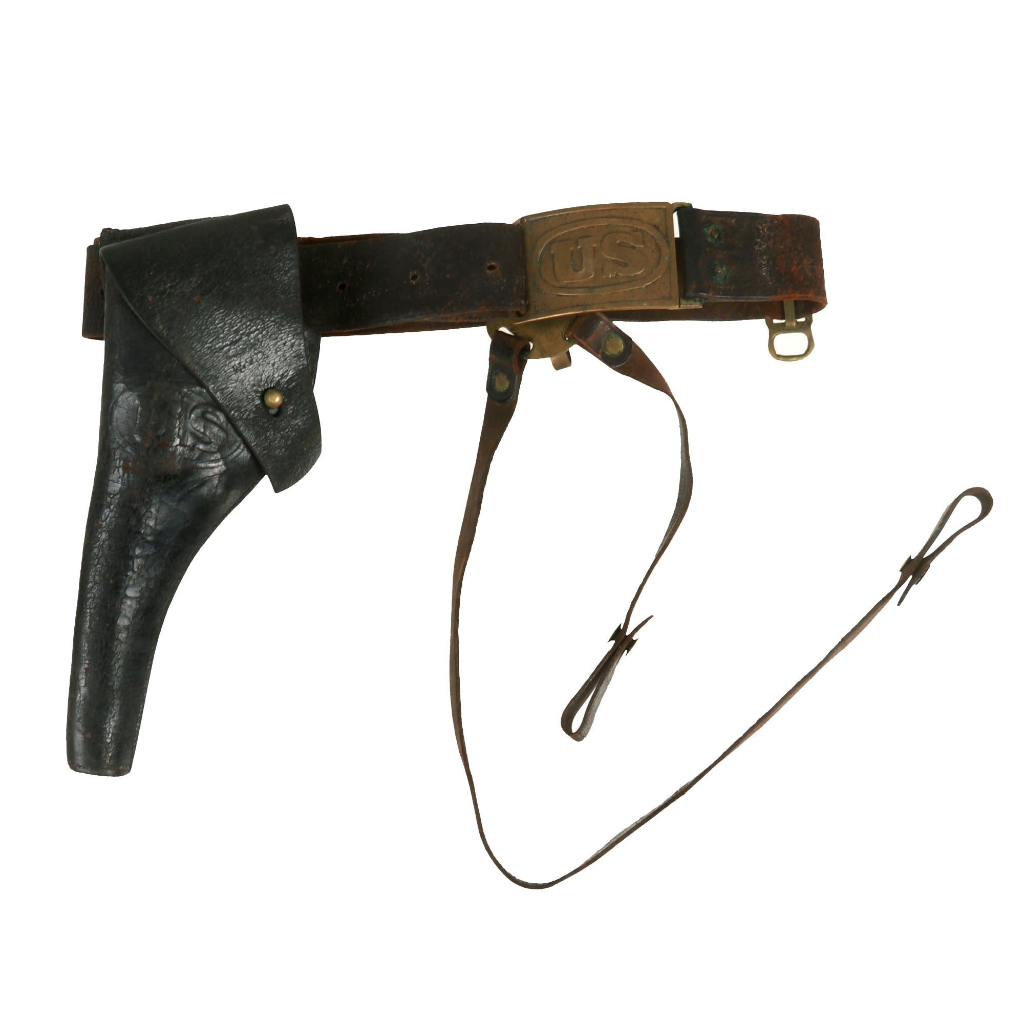 - M-1874 Saber Belt With Holster: Dating from the Indian Wars in the 1870s and 1880s, this is known as a Model 1874 Waist Belt, as used by the U.S. Army for the last decades of the 19th Century. It is of simple sturdy leather construction, with a heavy U.S. Brass Belt Plate Buckle, with a hook on the back that attaches to the end fitting on the other end. The belt could be used to suspend holsters, ammunition cartridges, and other field gear items for use in combat. This belt is set up for cavalry use and has very nice sword hangers attached as well as a leather holster. While the leather is very fragile in areas, it is still in fantastic condition given the age.