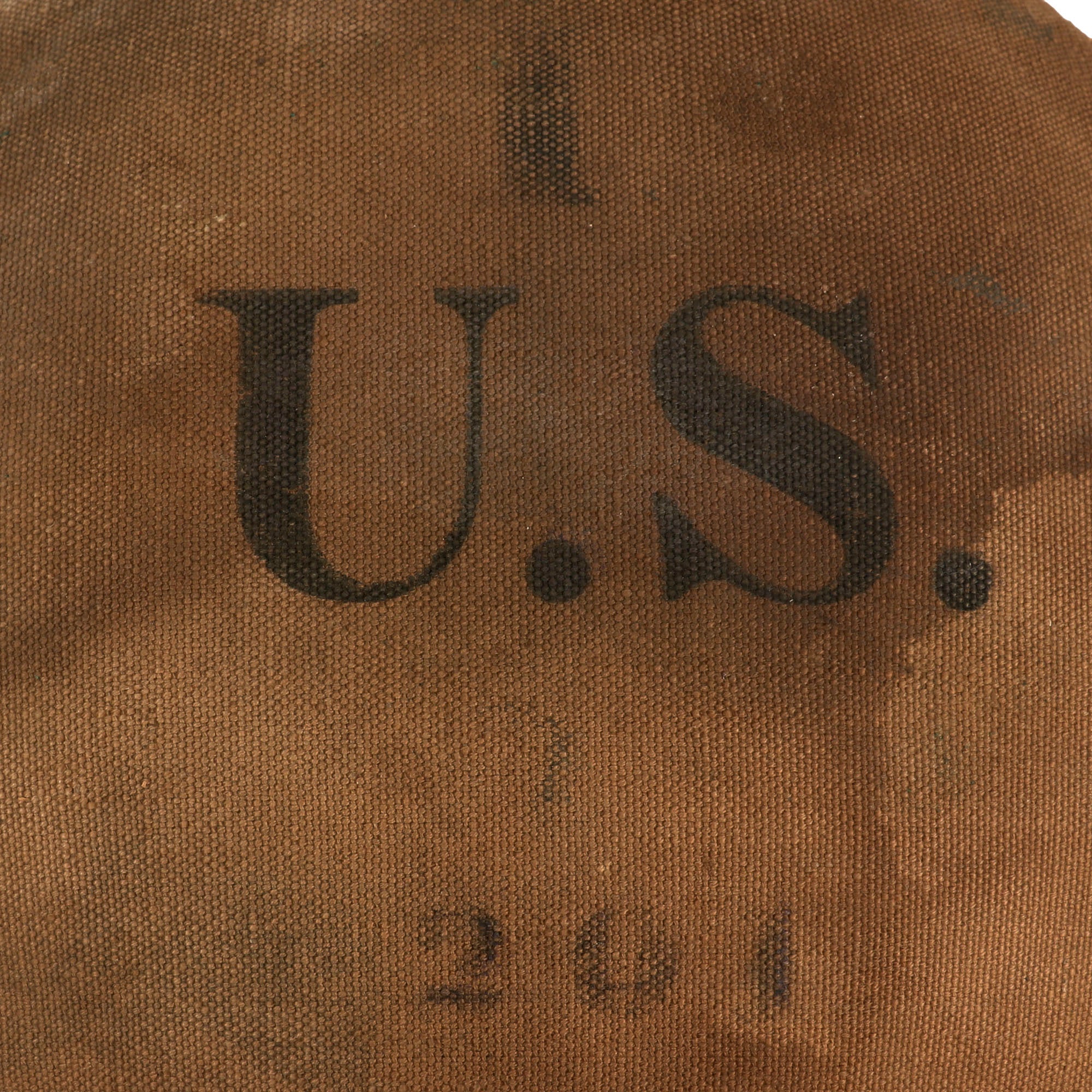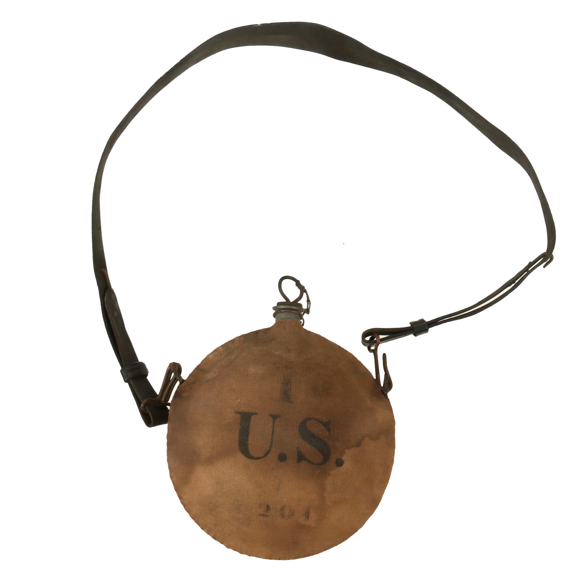 - M1878 Canteen with Leather Shoulder Strap: US M1878 Canteen with a tan canvas cover with a very clear early style U.S. stencil on the front, in very good condition with the original issue sling. There is wear present but is otherwise presented in wonderful condition with the original cork stopper as well!