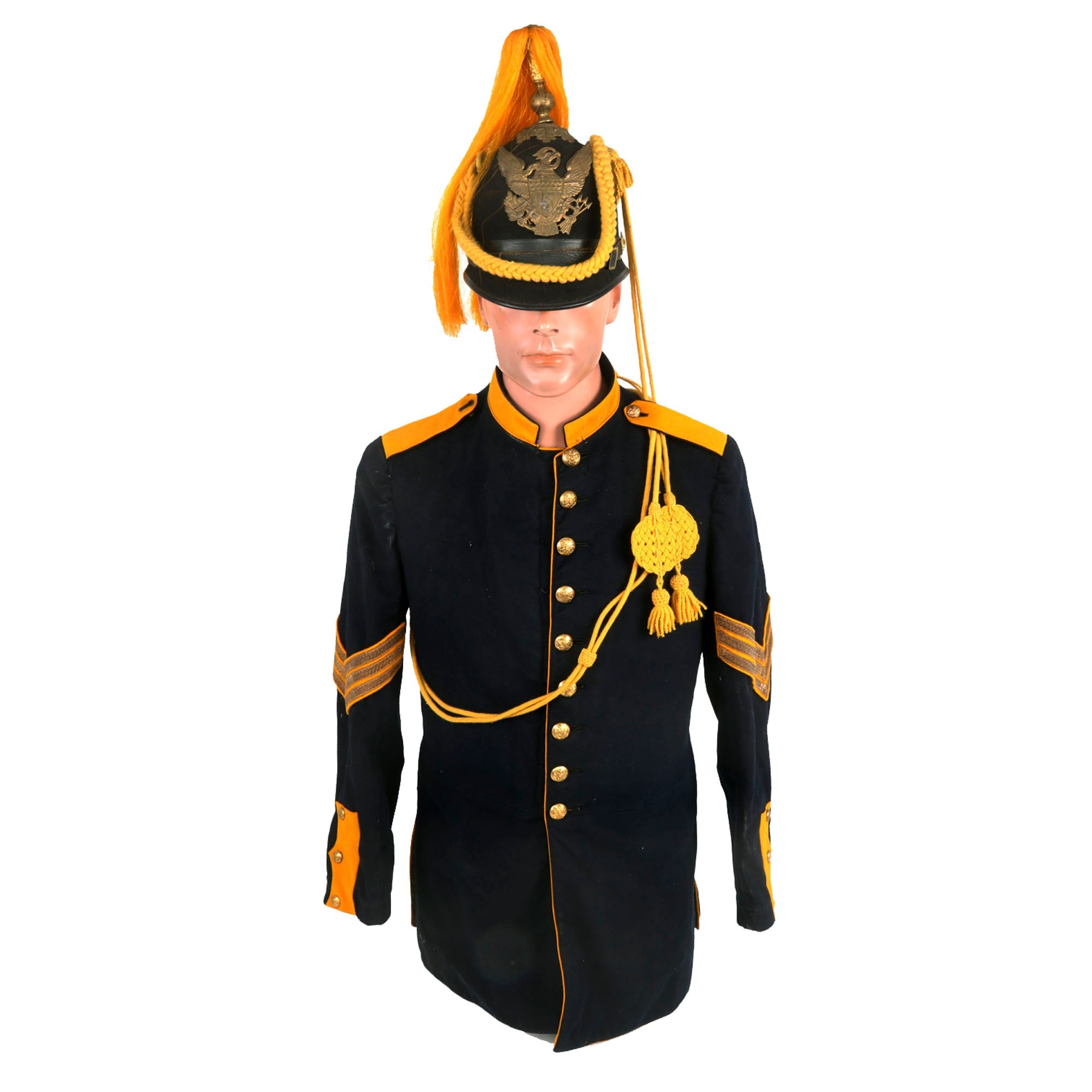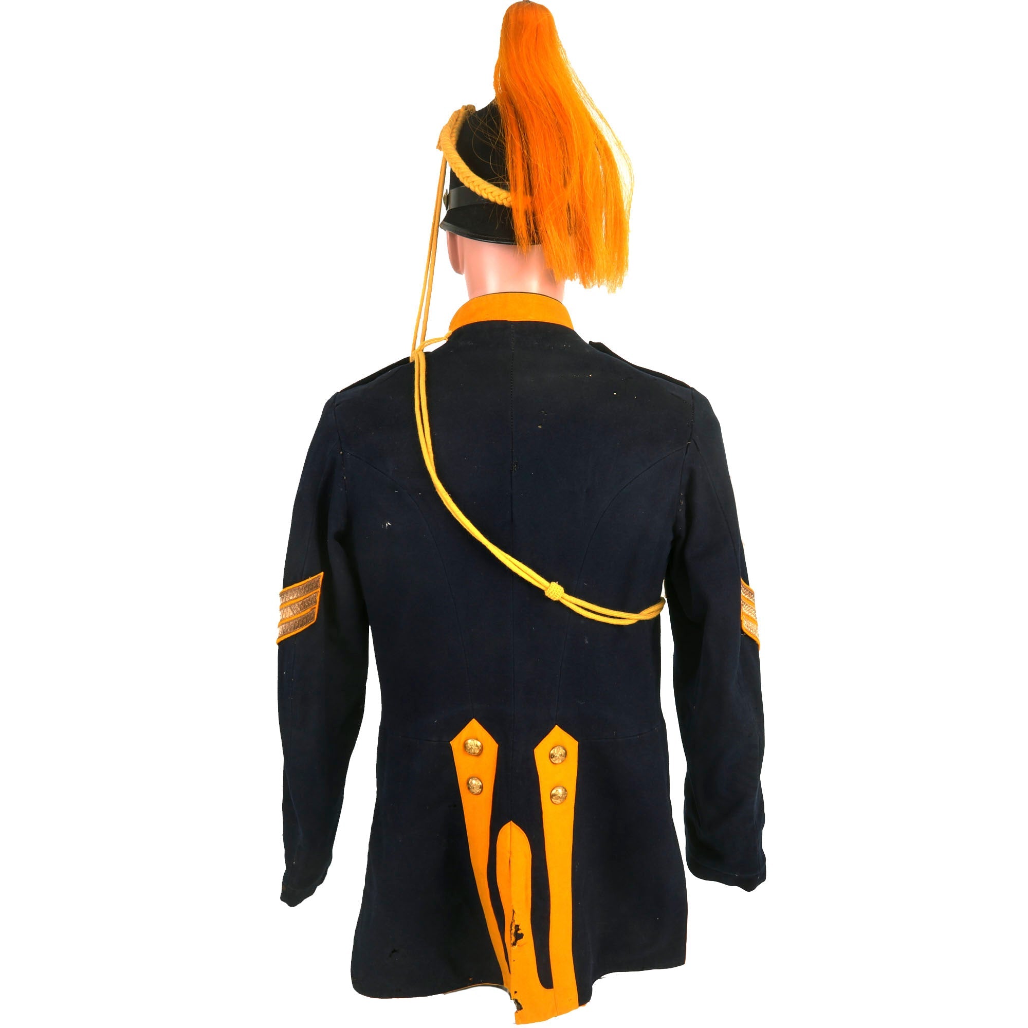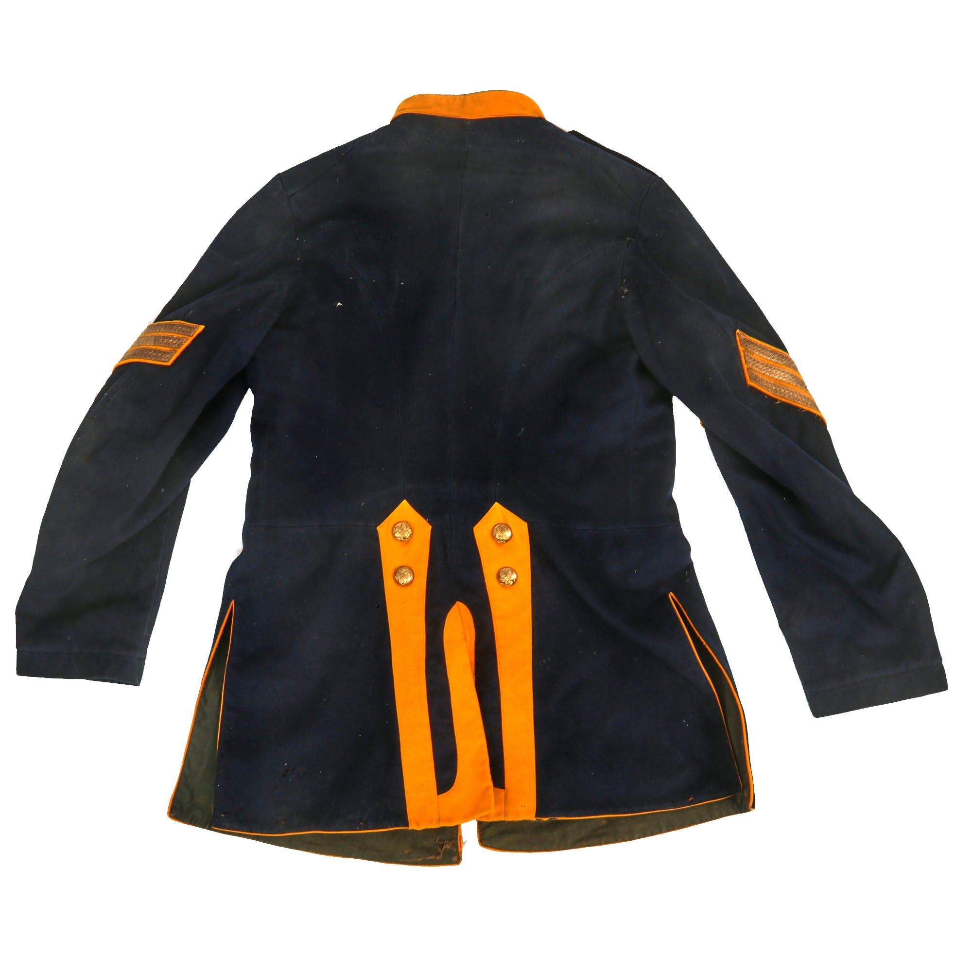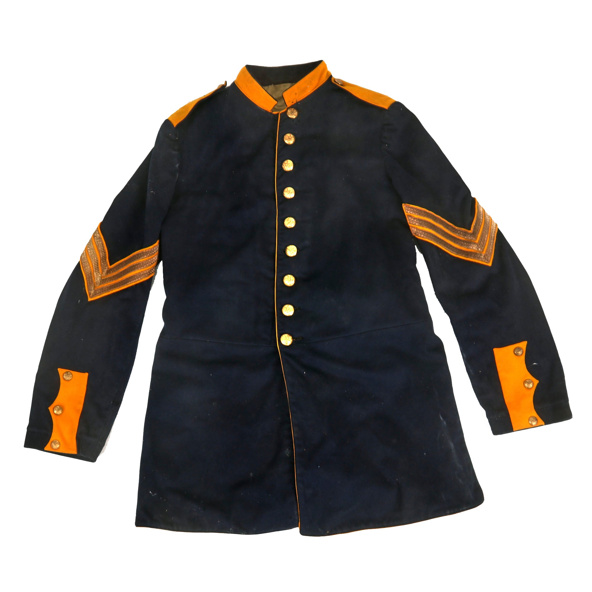 - Model 1885 Dress Coat With Trousers: The Model 1885 Enlisted Infantry Full Dress Coat is made of dark blue wool, with nine buttons sewn in a single column. The shoulder straps, collar and tail flaps are made of yellow wool, with yellow piping along the front of the coat. There is scattered moth nips but nothing too damaging. The trousers are in similar condition and display quite well with the top.