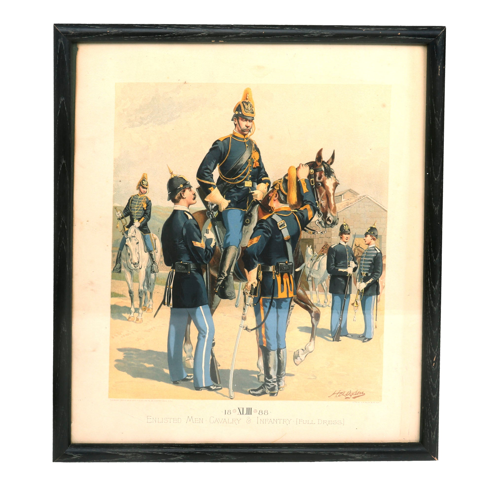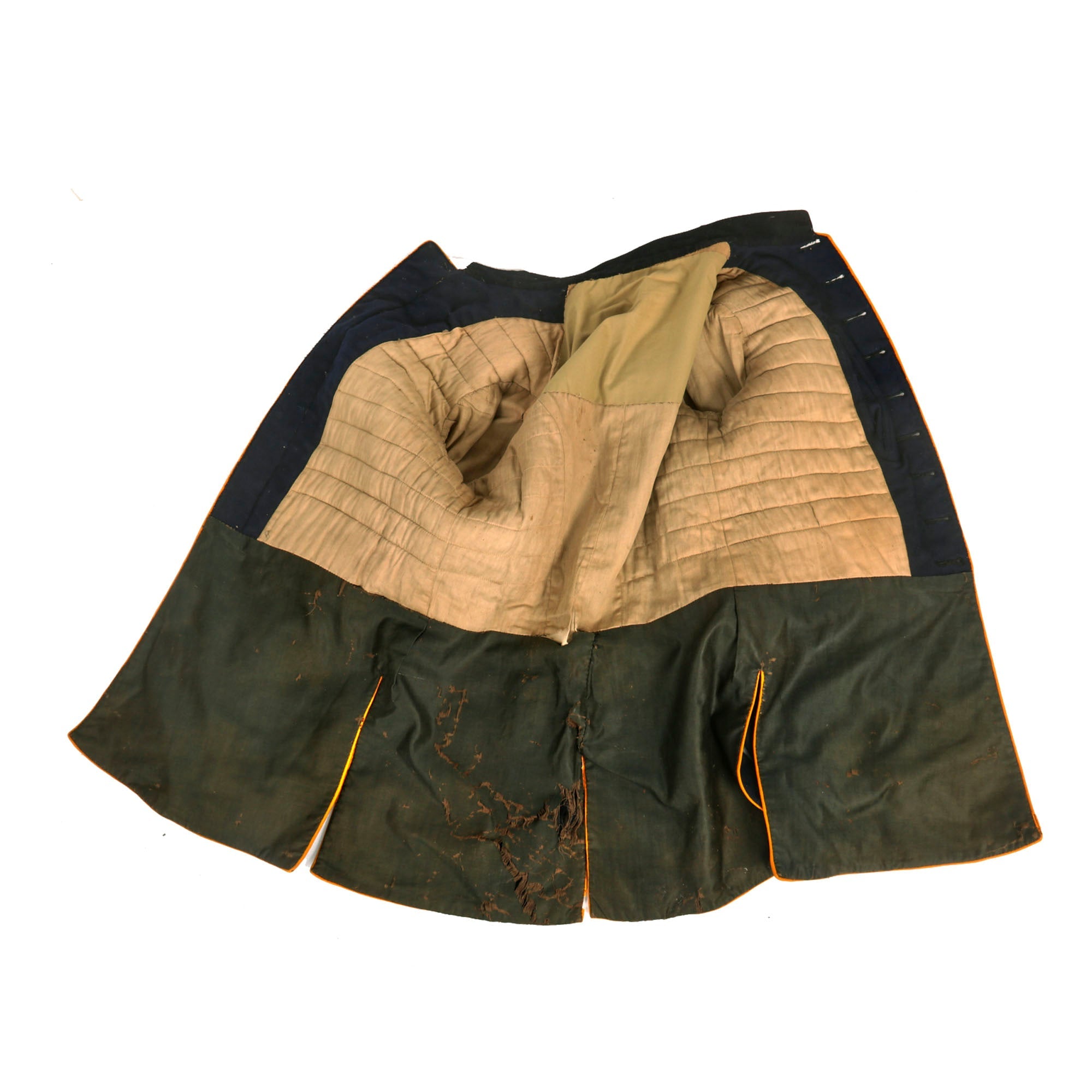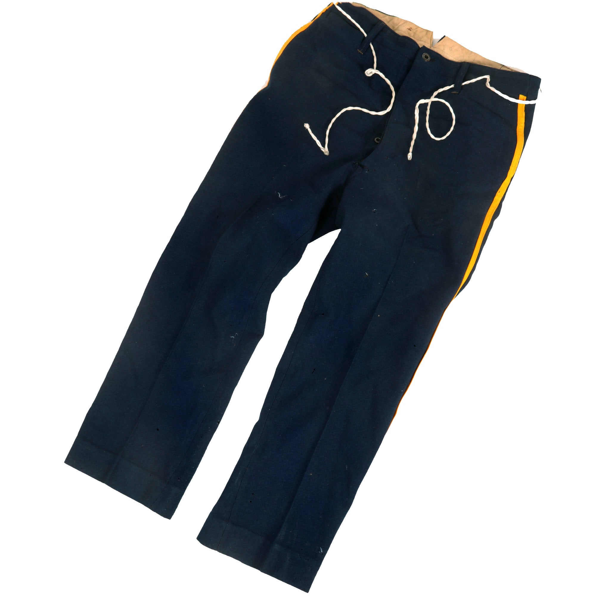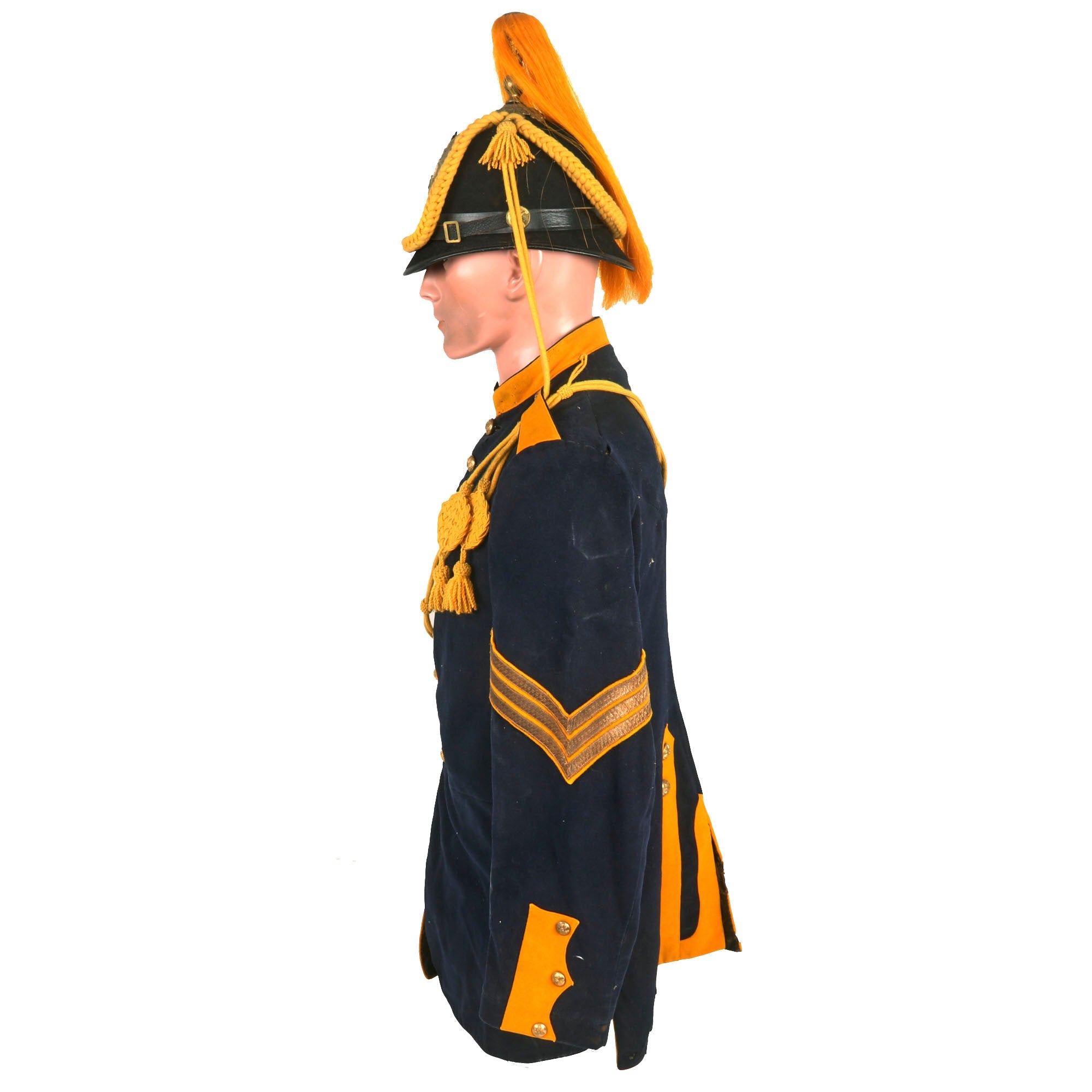 - Model 1885 Dress Coat With Trousers: The Model 1885 Enlisted Infantry Full Dress Coat is made of dark blue wool, with nine buttons sewn in a single column. The shoulder straps, collar and tail flaps are made of yellow wool, with yellow piping along the front of the coat. There is scattered moth nips but nothing too damaging. The trousers are in similar condition and display quite well with the top.