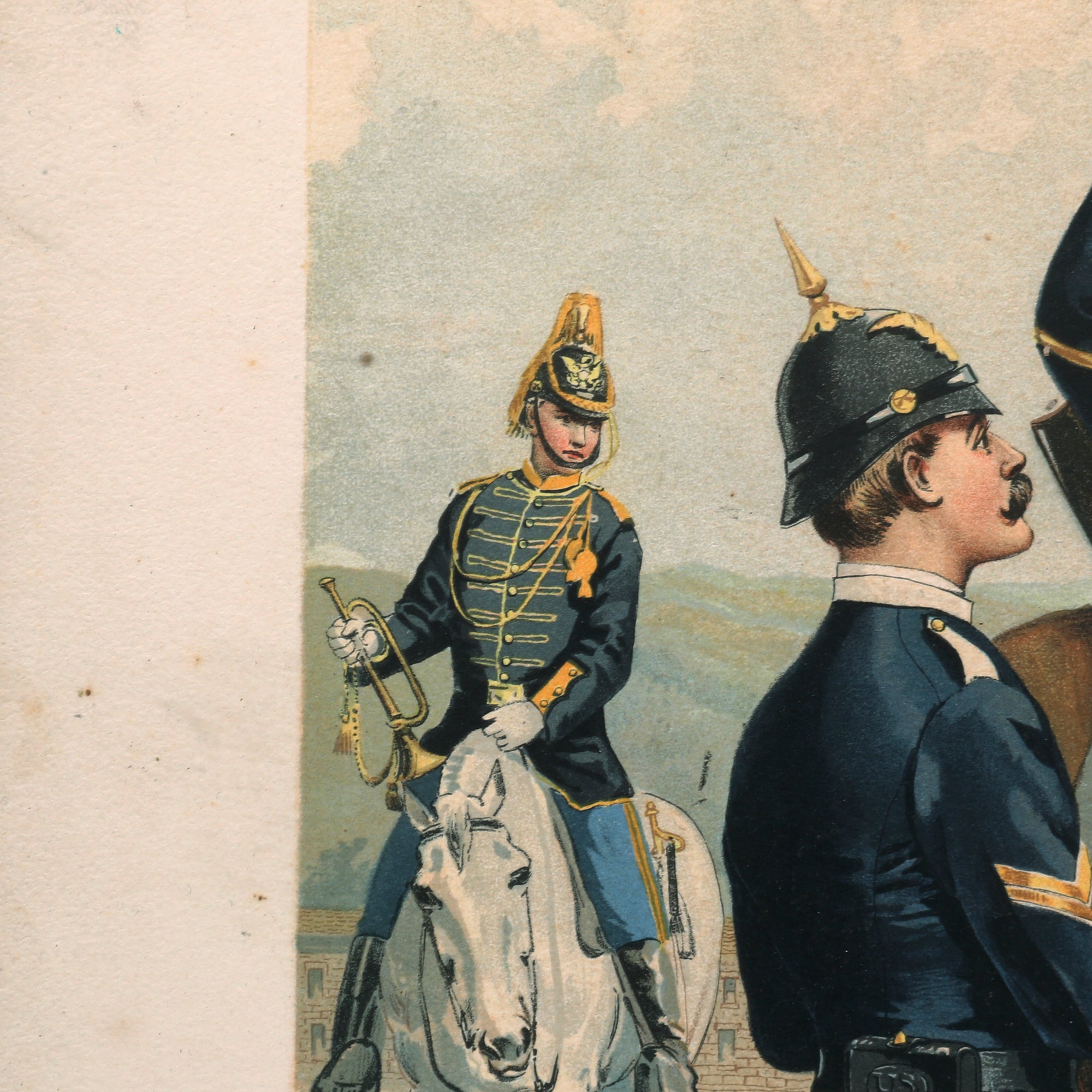 - Cavalry M-1881 Blue Cloth Spiked Pith Helmet With Plume: This helmet dates to the late 1880s to early 1890s, and it really is quite striking. This is not the type of helmet that was worn in the field, but instead one intended for use with the "dress" uniform for ceremonial occasions. It is beautifully made from cork covered with brown fabric but no maker markings present.