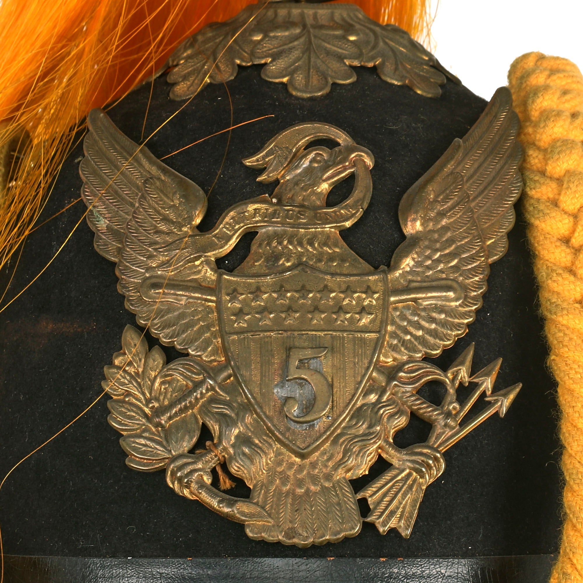 The Helmet plate displays the Great Seal of the United States, with the American Eagle with a banner in its beak stating: E PLURIBUS UNUM. The "crossed sabers" on the shield indicate that it is for an Army Cavalry unit. The cavalry insignia was adopted in 1851. Officers and enlisted personnel assigned to cavalry regiments, cavalry squadrons or separate cavalry troops are authorized to wear the cavalry collar insignia in lieu of their insignia of branch when approved by the MACOM commander. Some of the armor and aviation units are designated cavalry units.