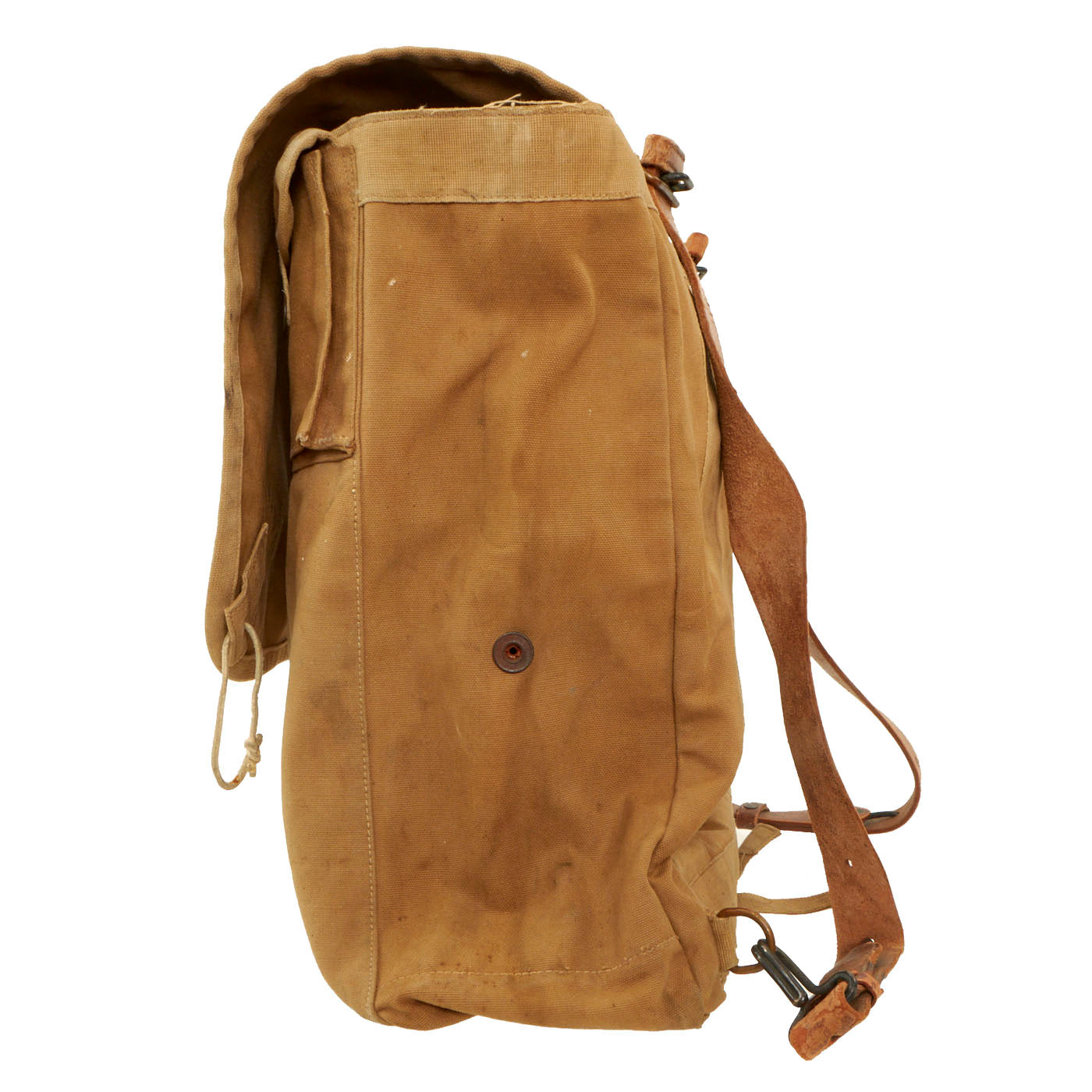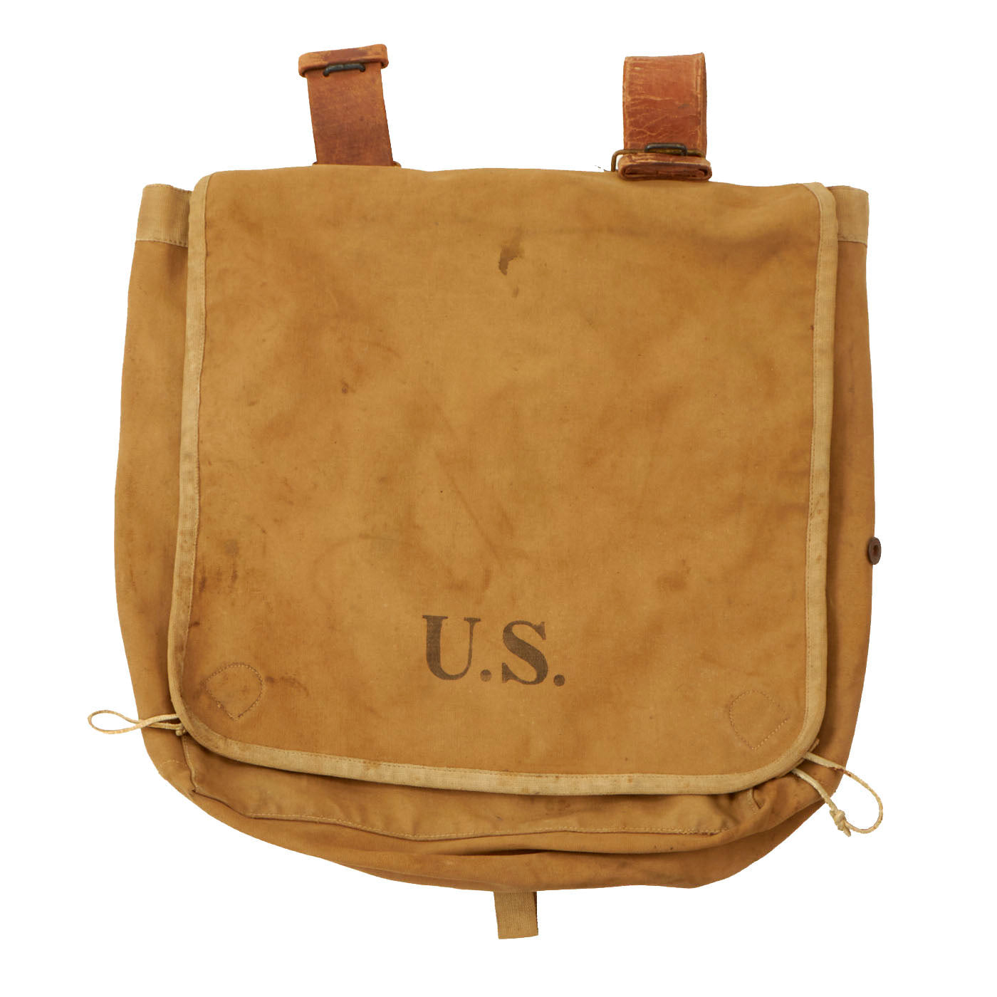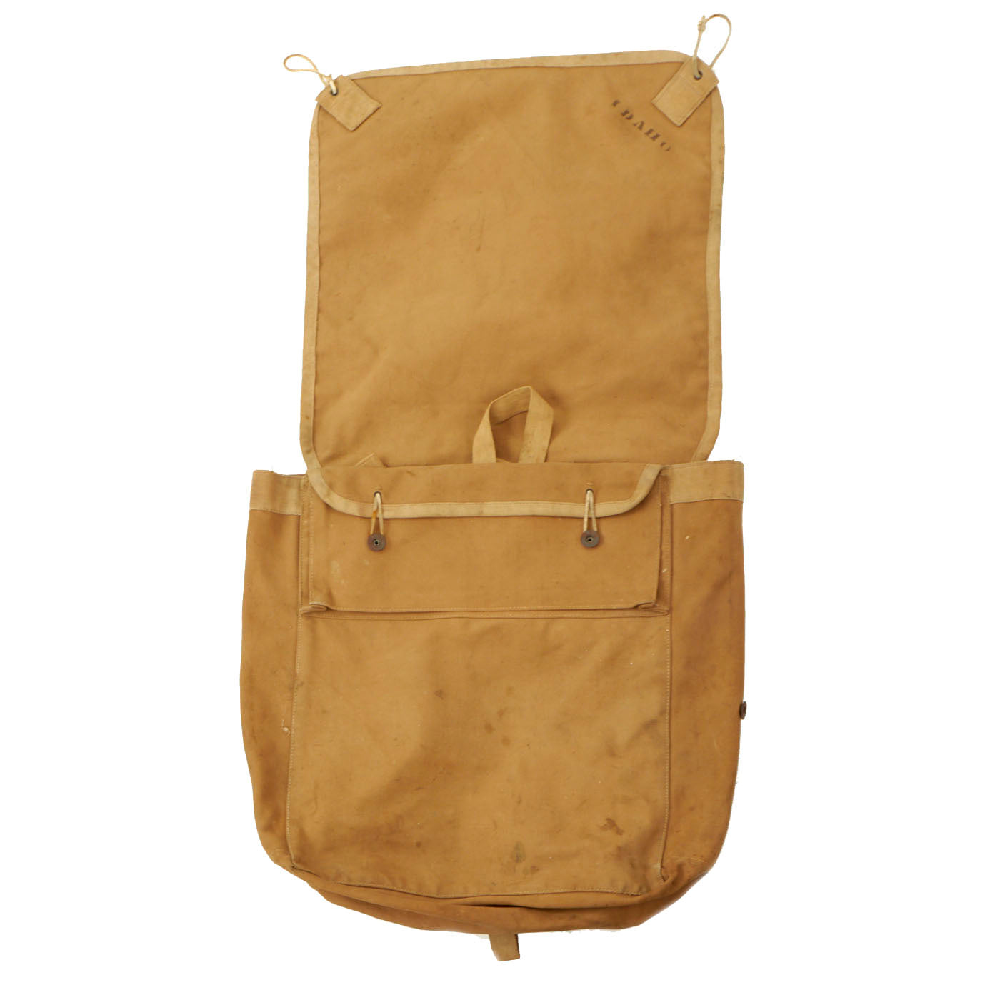 The example we are offering is in very good condition, especially considering it is well over one hundred years old. The canvas exhibits the expected dirt, stains, and wear in places as expected with a service used military article of this age. Both russett leather shoulder straps are still intact, although dry as expected. The original elkhide closure loops on the pack flap and inner pocket flap are also intact! There are no maker stamps or dates on this pack, which is not uncommon as these are usually a depot-made piece. There is a nice crisply stamped “U.S.” on the pack flap, and “Idaho” stamped on the inner corner of the main flap.