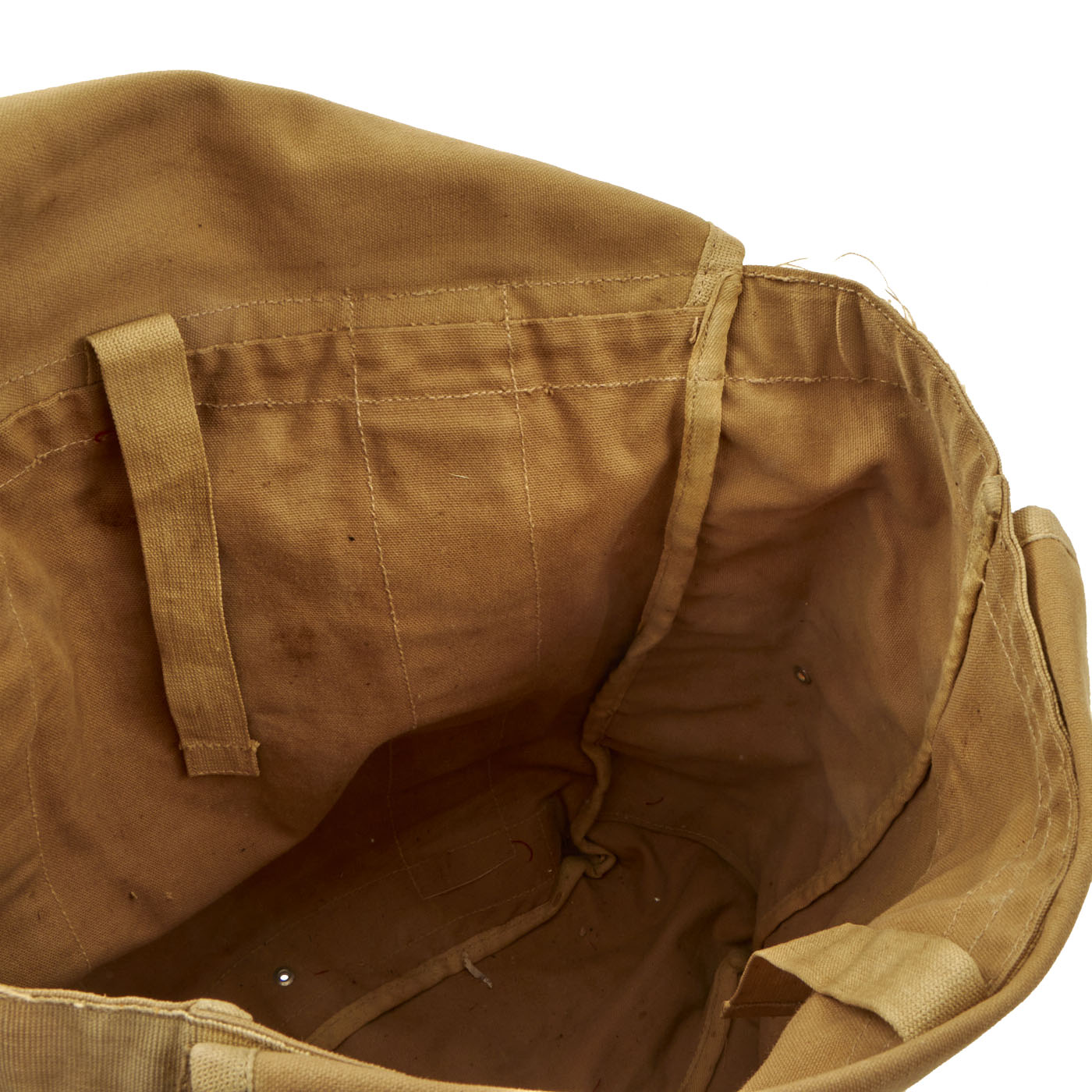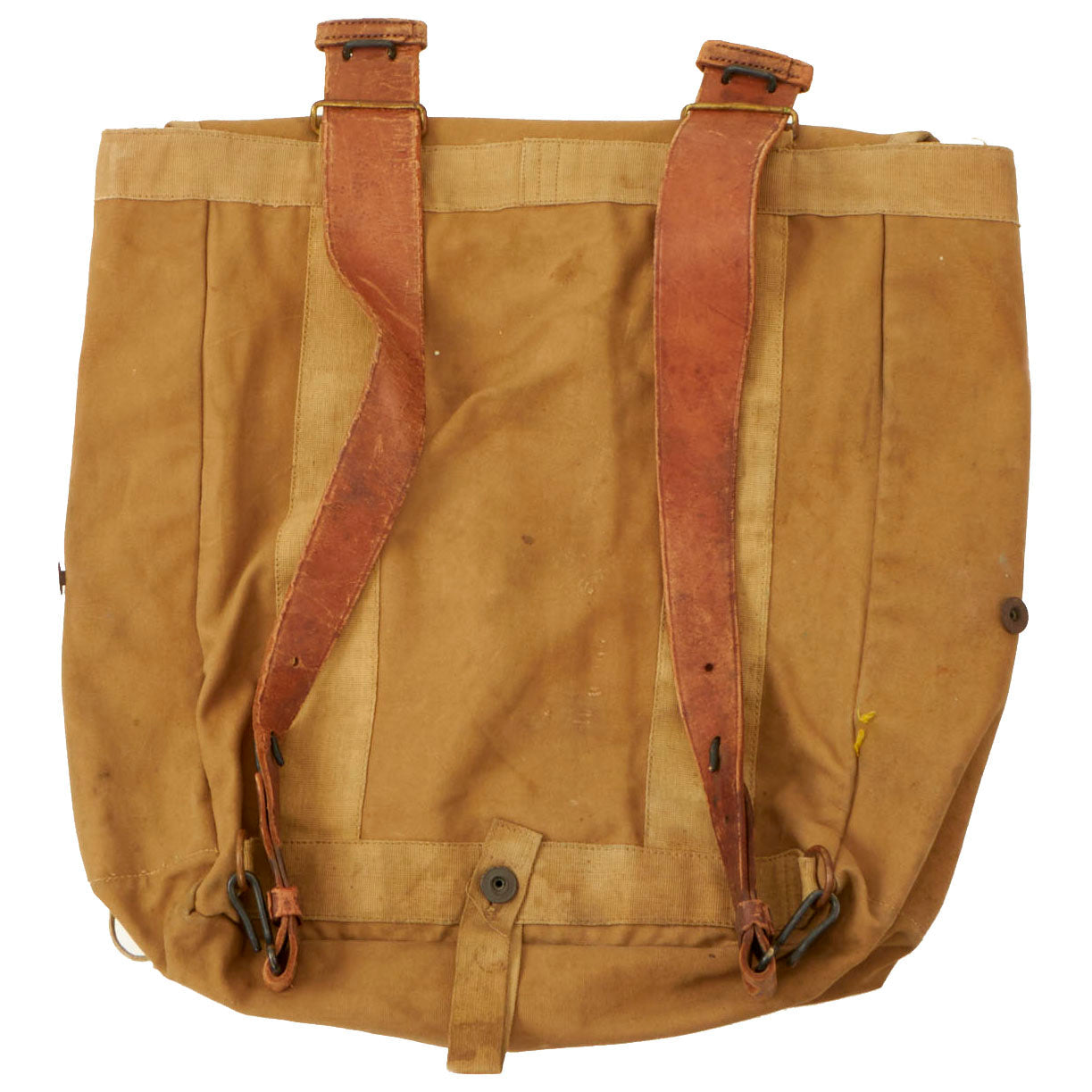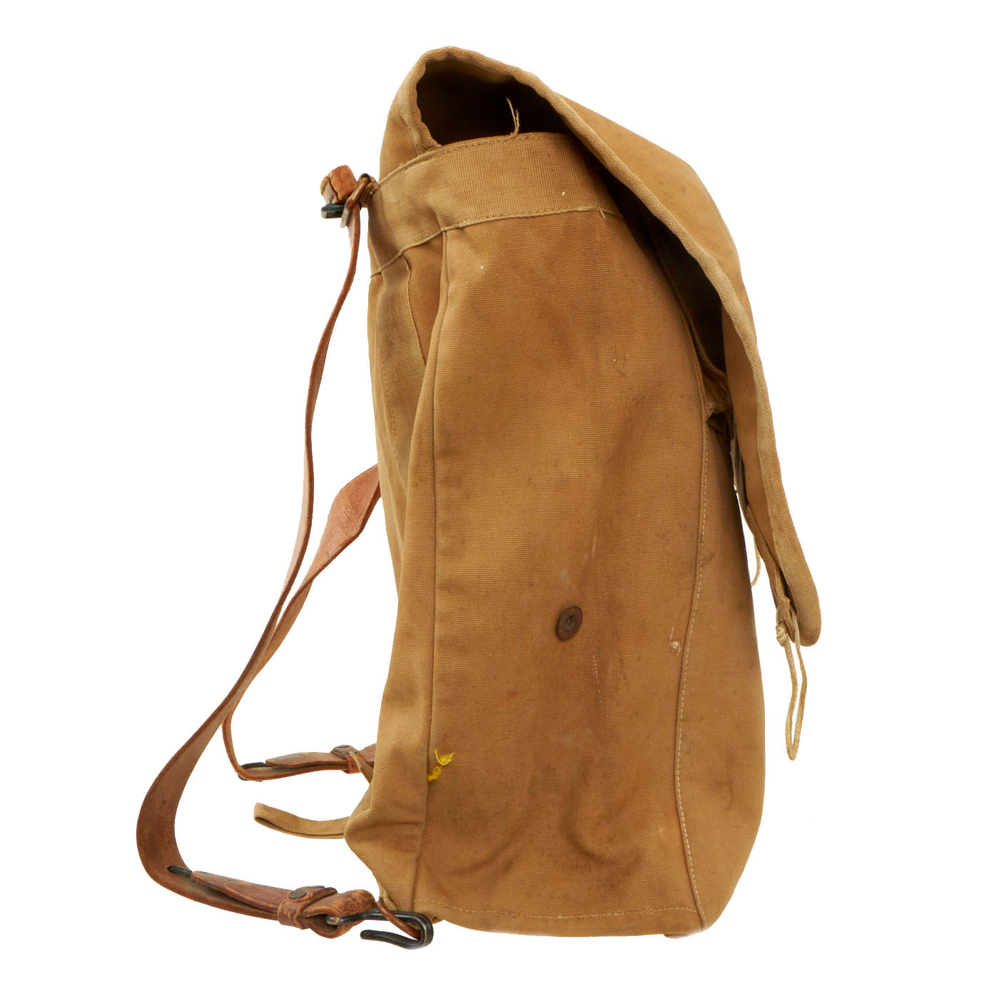 The example we are offering is in very good condition, especially considering it is well over one hundred years old. The canvas exhibits the expected dirt, stains, and wear in places as expected with a service used military article of this age. Both russett leather shoulder straps are still intact, although dry as expected. The original elkhide closure loops on the pack flap and inner pocket flap are also intact! There are no maker stamps or dates on this pack, which is not uncommon as these are usually a depot-made piece. There is a nice crisply stamped “U.S.” on the pack flap, and “Idaho” stamped on the inner corner of the main flap.