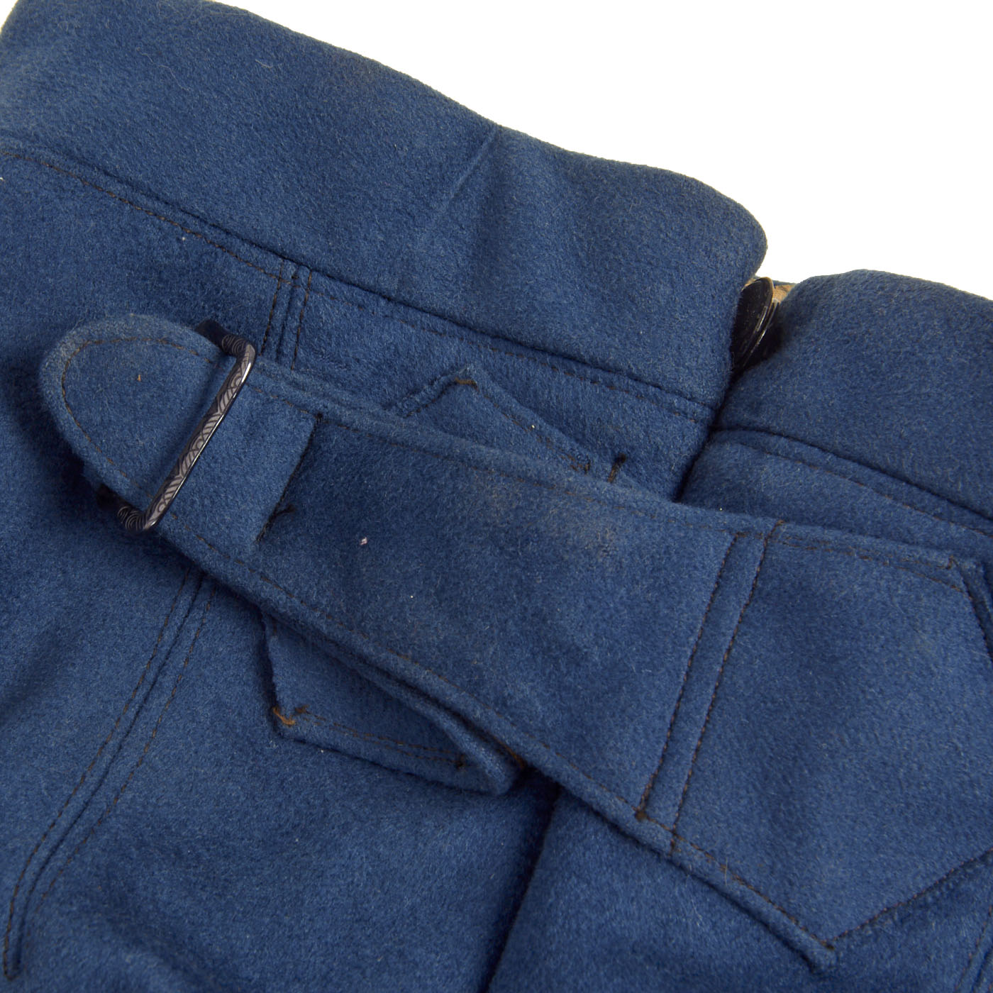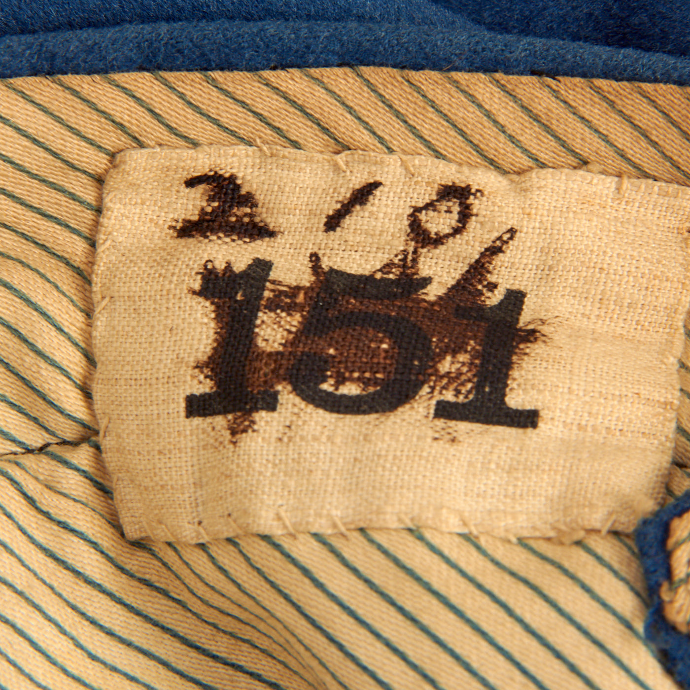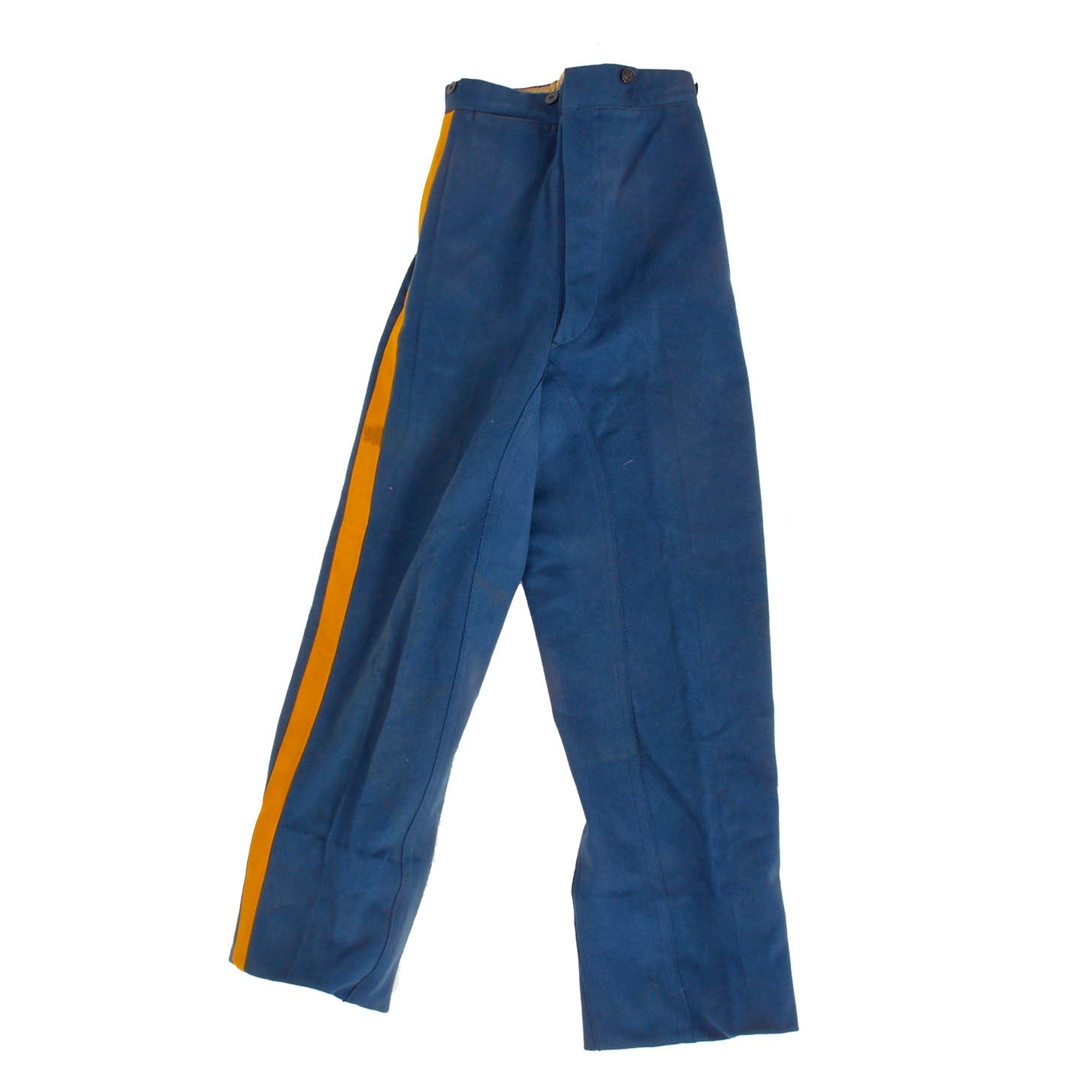 To an untrained eye, these are very similar to U.S. Civil War Issue Trousers. They are constructed of a sky blue kersey wool, which, while similar in shade to their Civil War counterparts are in fact a slightly darker blue shade. As typical with garments from the later portion of the 19th Century, a mixture of hand and machine sewing is visible. The Cavalry yellow inseam stripe is fabricated from fine melton wool, and is original to the trousers. The seat retains its woolen reinforcement as well.